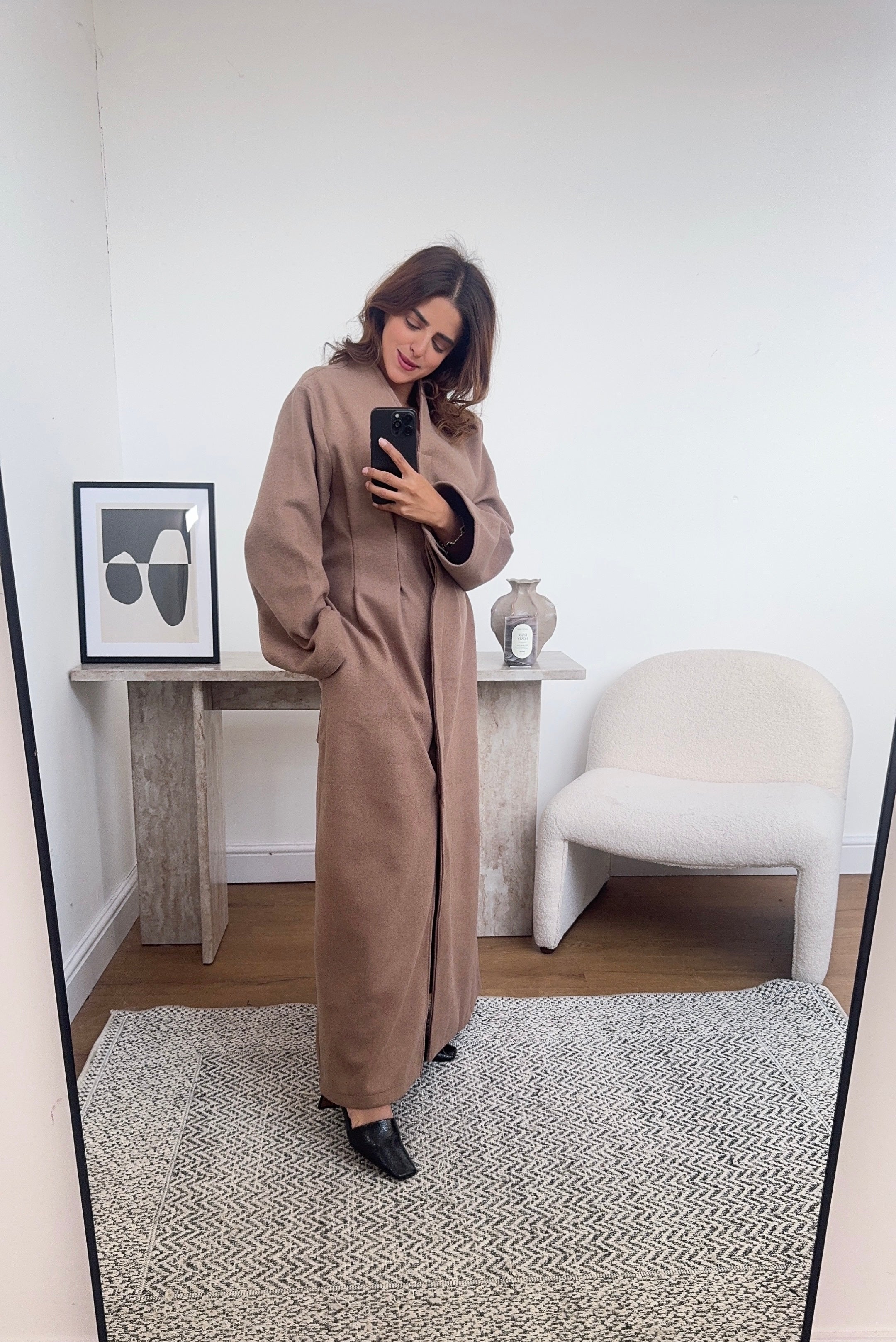 • A long, structured coat in a light taupe, which drapes beautifully and has a slightly oversized fit.
