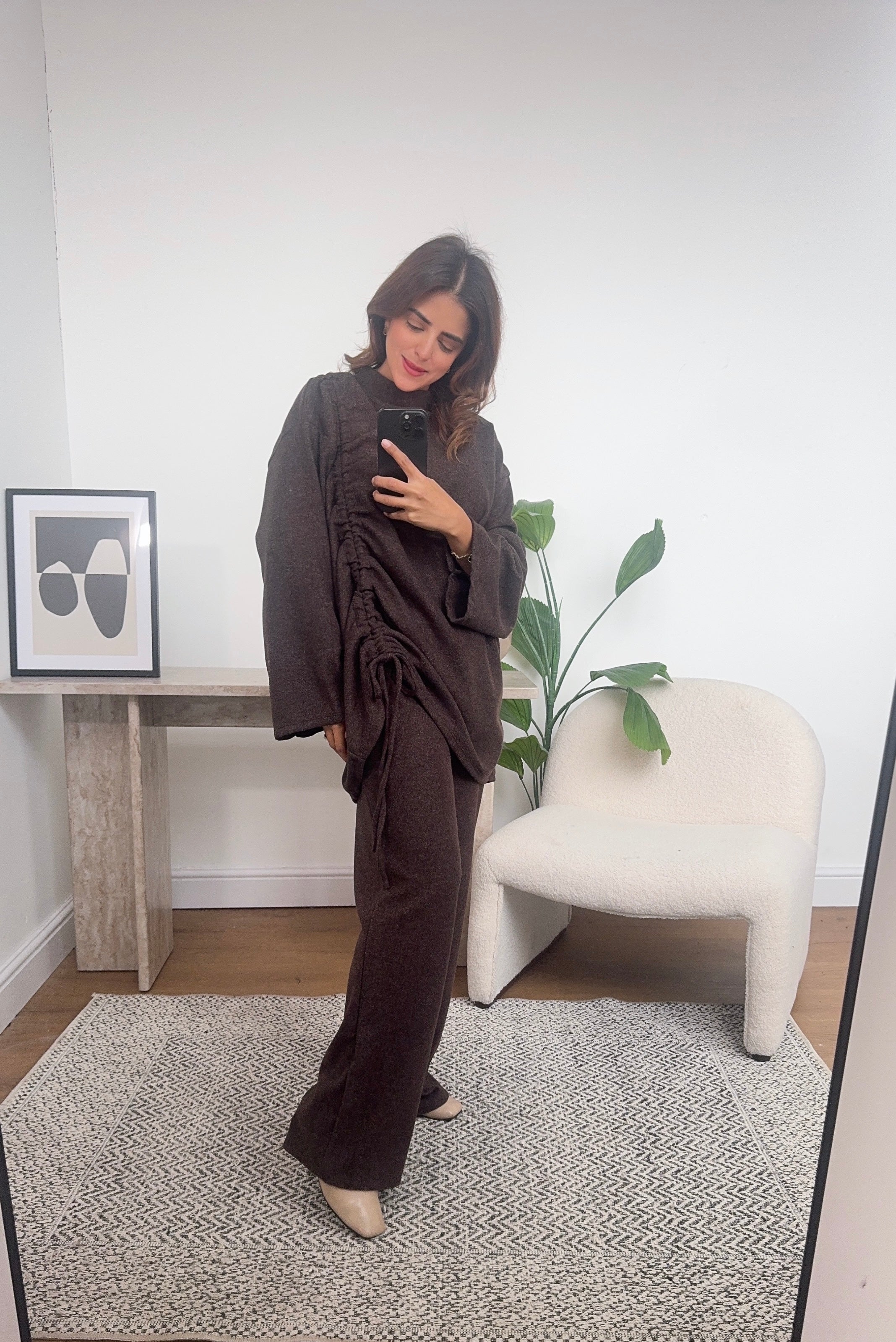 A causal coord featuring ruch side tie detail and trousers with elasticated waist.