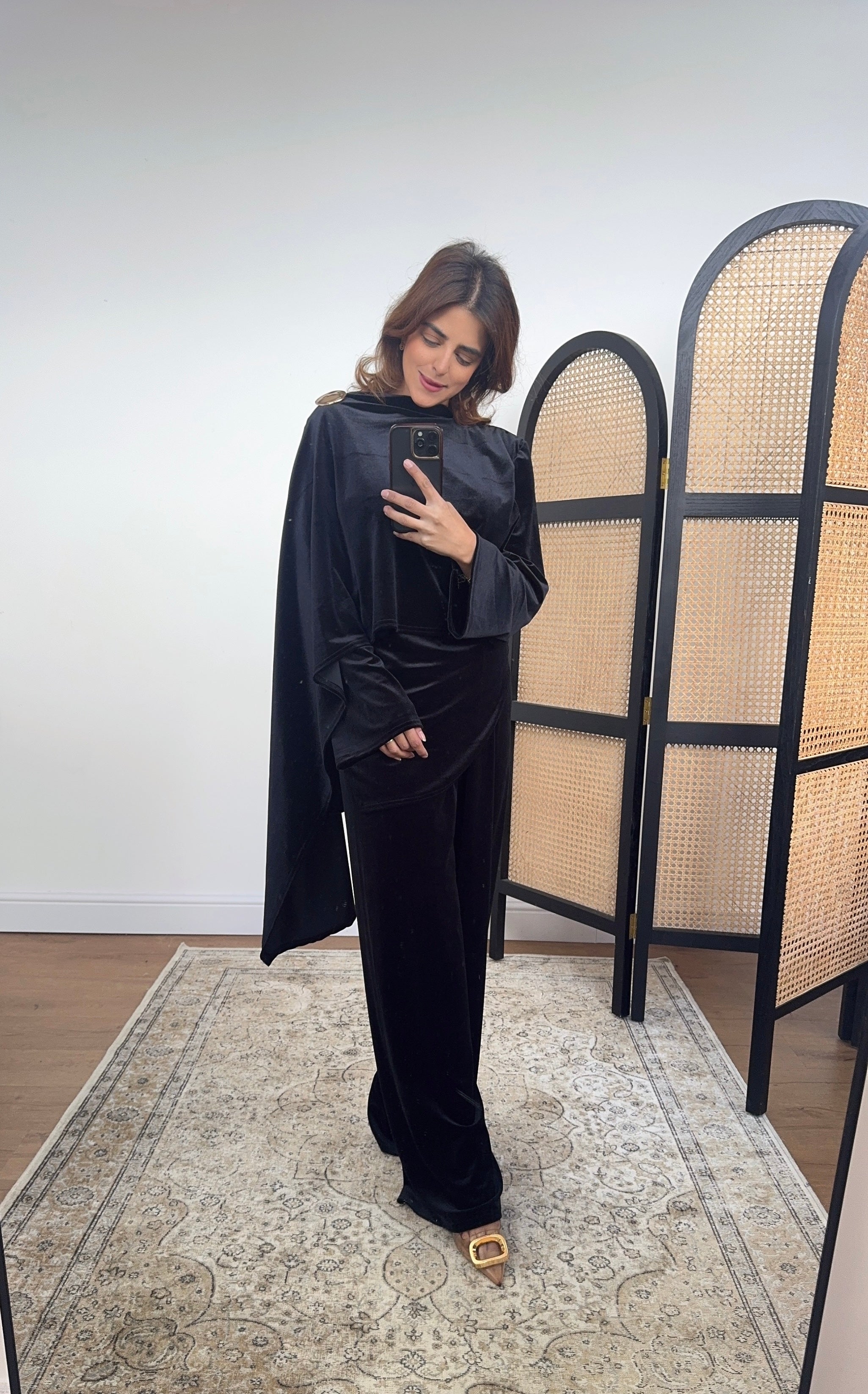 This chic asymmetric top features a draping scarf and a gold brooch detail for a touch of elegance. The longer back provides extra coverage, heavyweight fabric will keep you warm & chic during your winter occasions.. Paired with elasticated waist trousers for a comfortable, flattering fit, this set blends style and comfort effortless.
