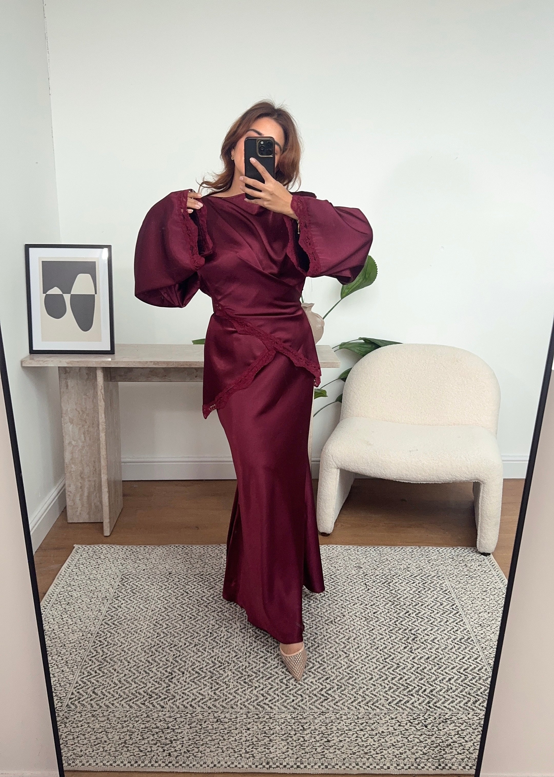 What really elevates it is the delicate lace trim—running along the sleeve edges, diagonally across the wrap, and down the hem. The lace is tonal and refined, not loud, which keeps the look polished and romantic rather than fussy.