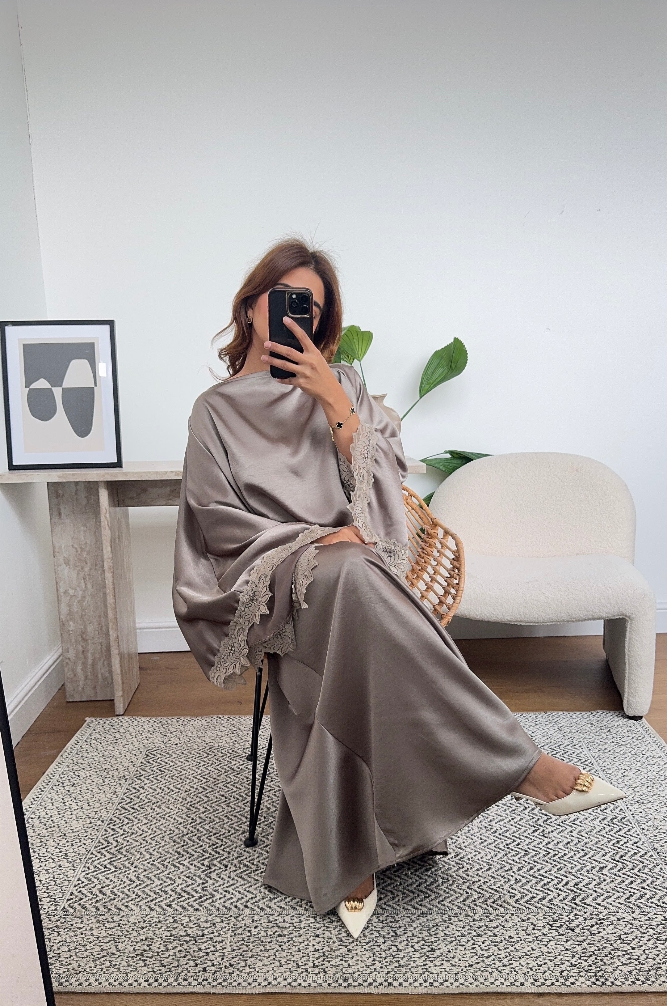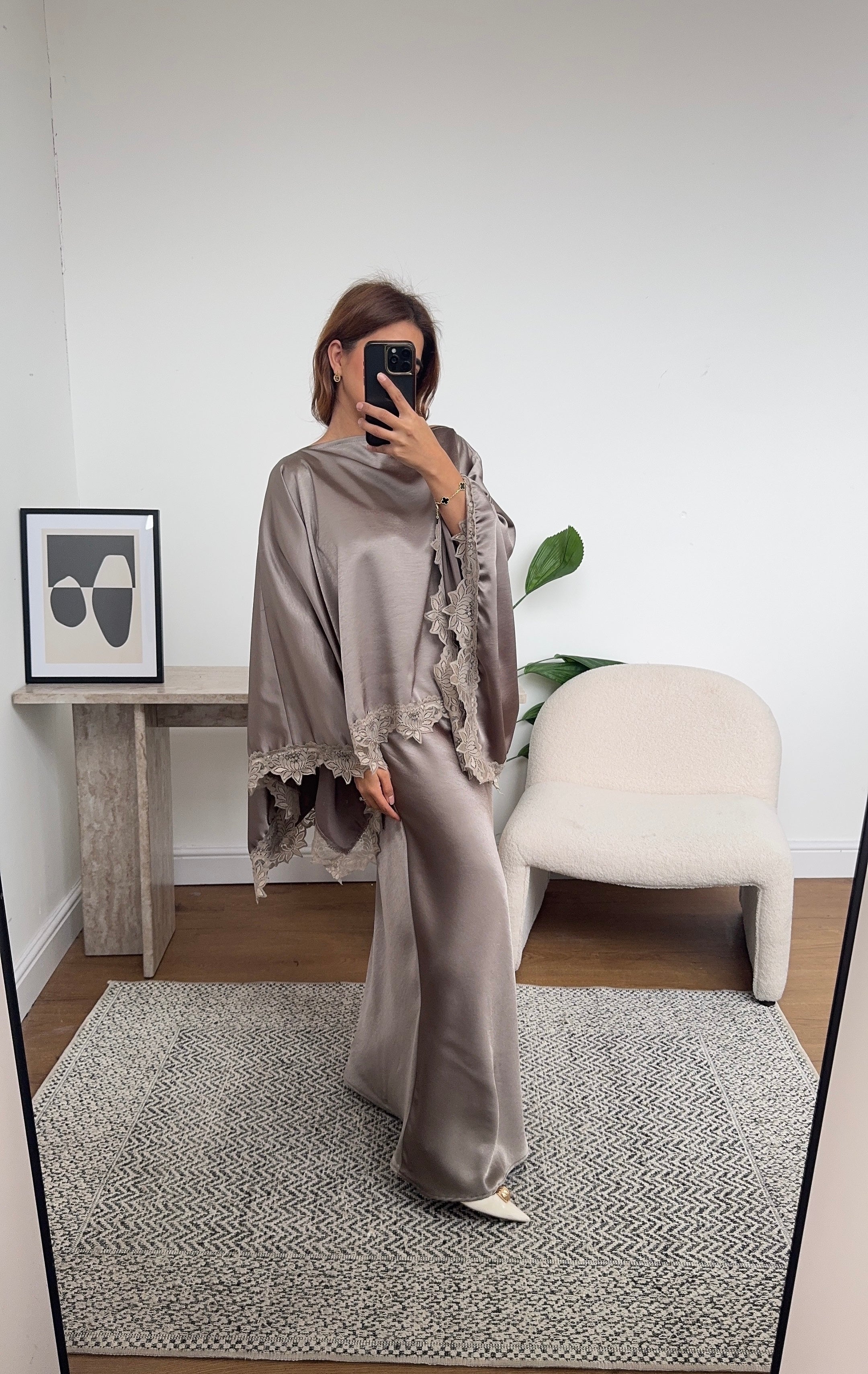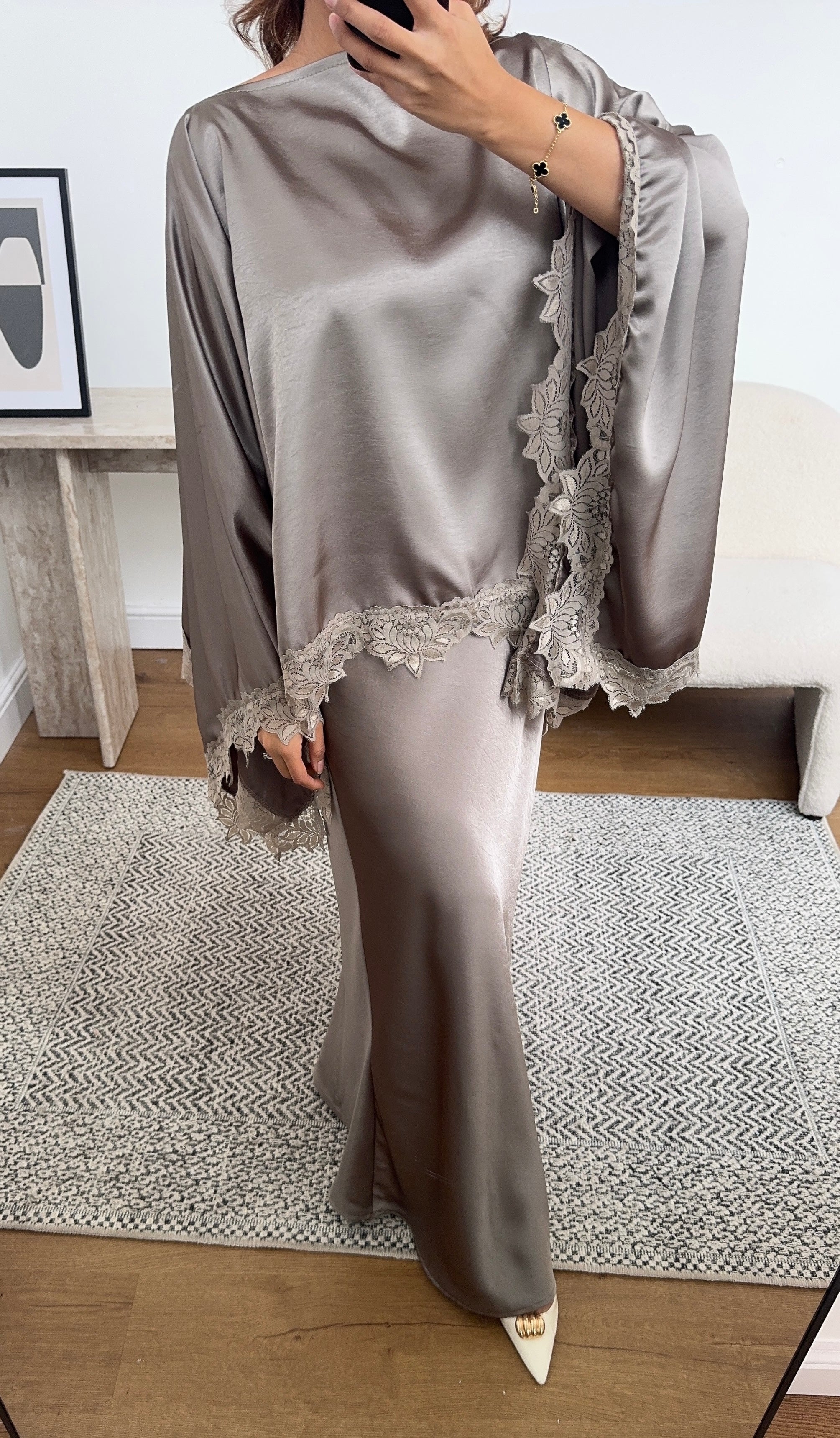 • Overall style: Graceful and sophisticated, blending modest coverage with luxurious details. The soft fabric and lace accents give it a timeless, formal look—well-suited for an evening event, formal gathering, or special occasion.