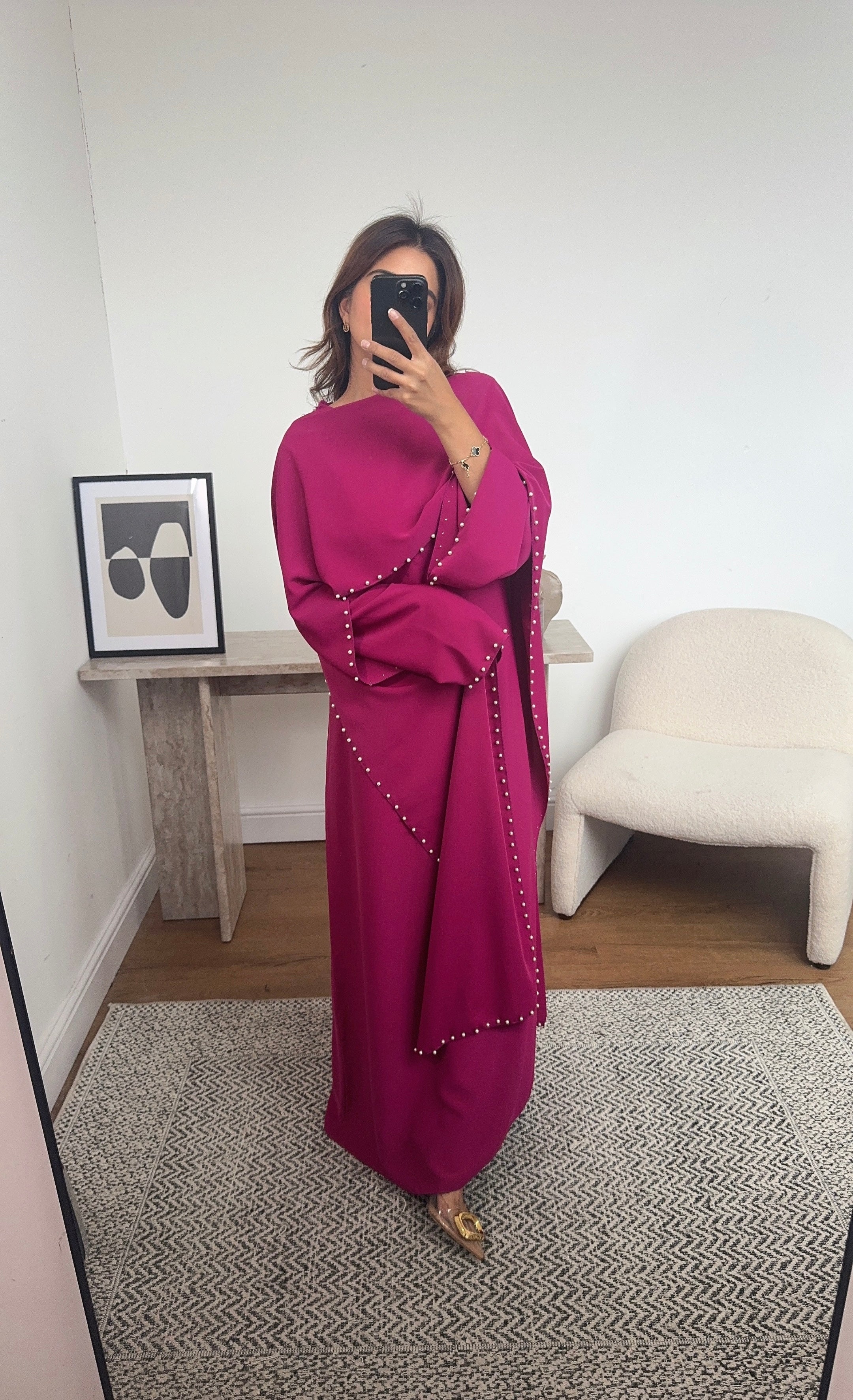 Beautiful long dress with pearl detailing cape attached. Back belt for extra fitting.