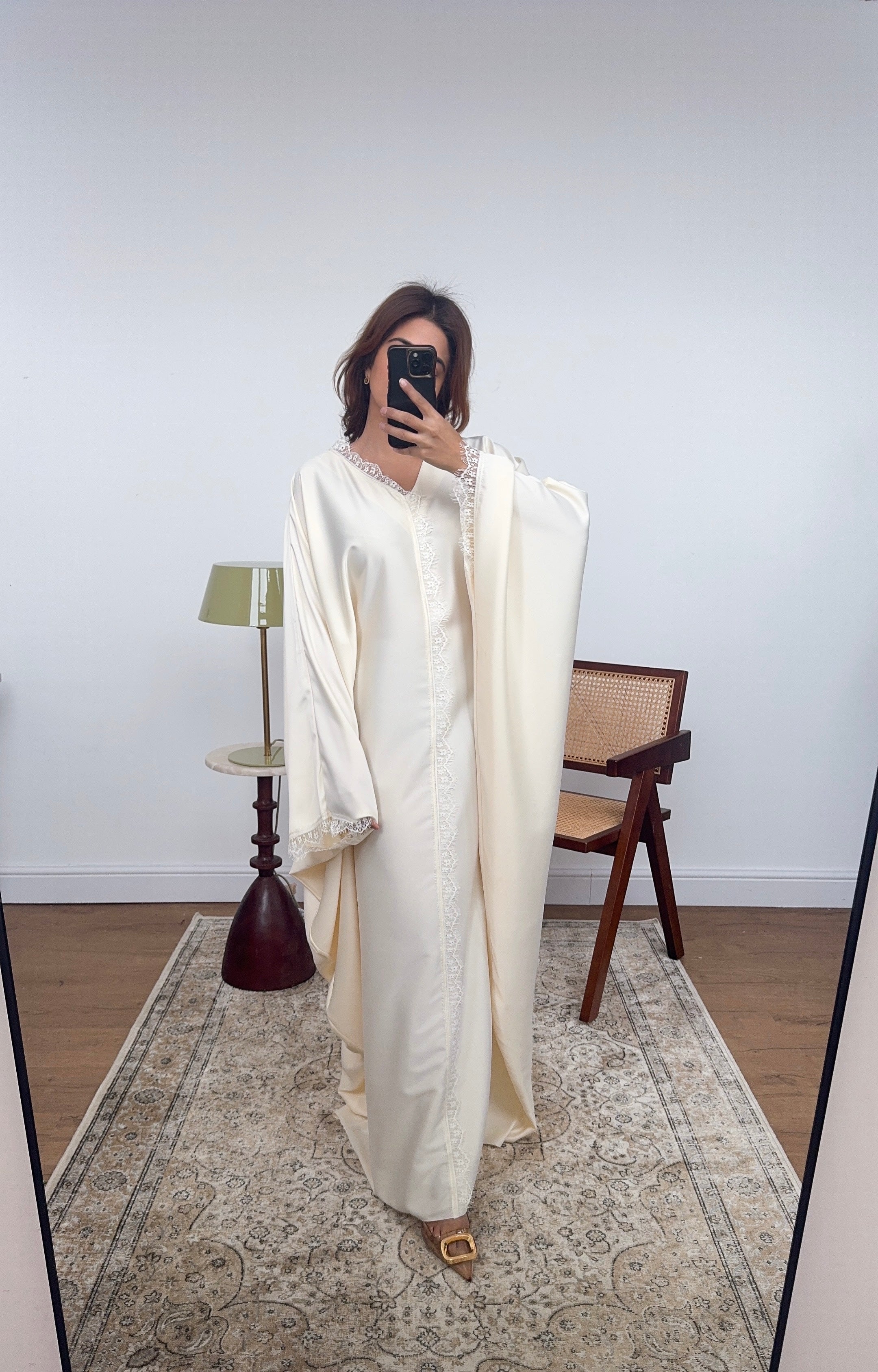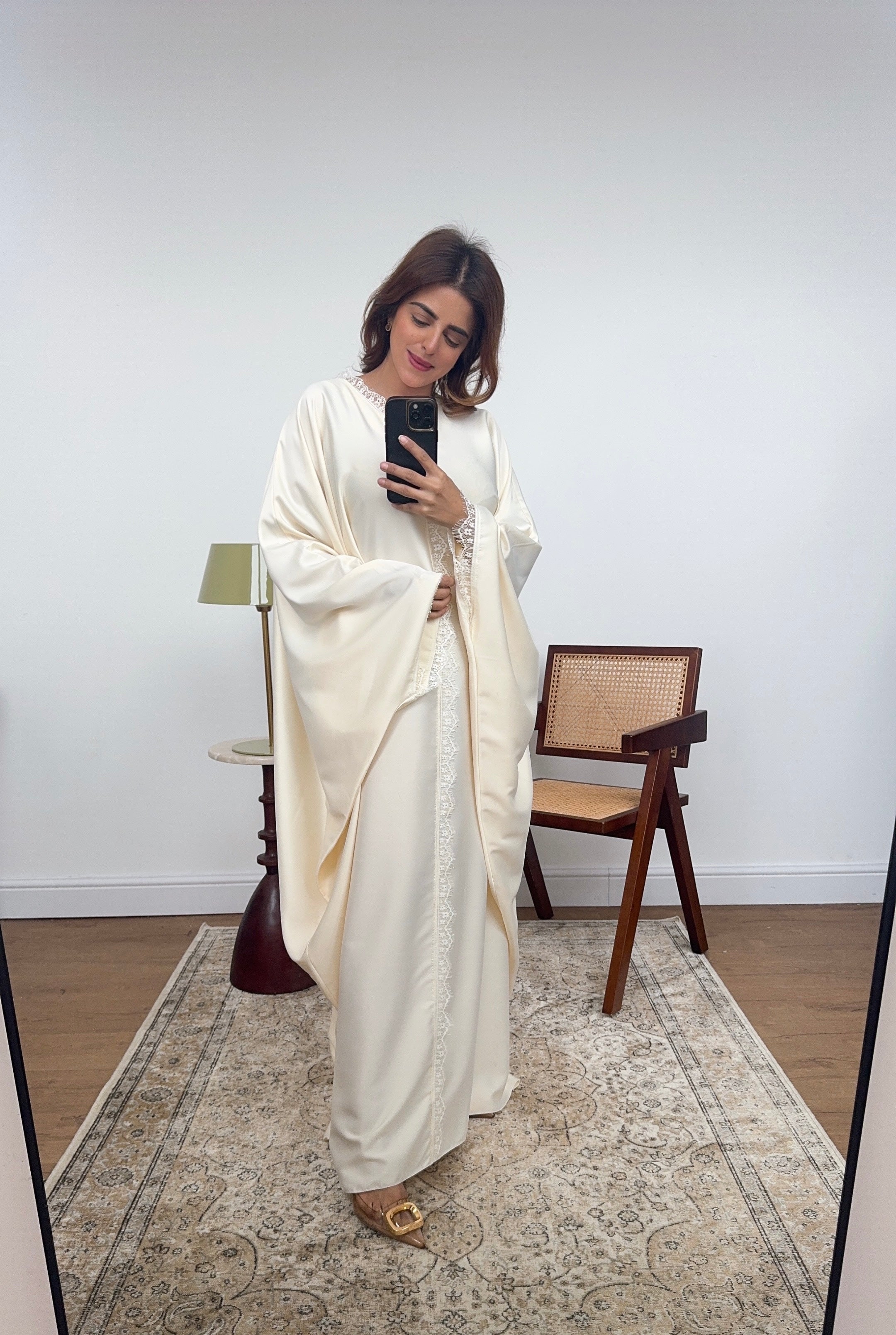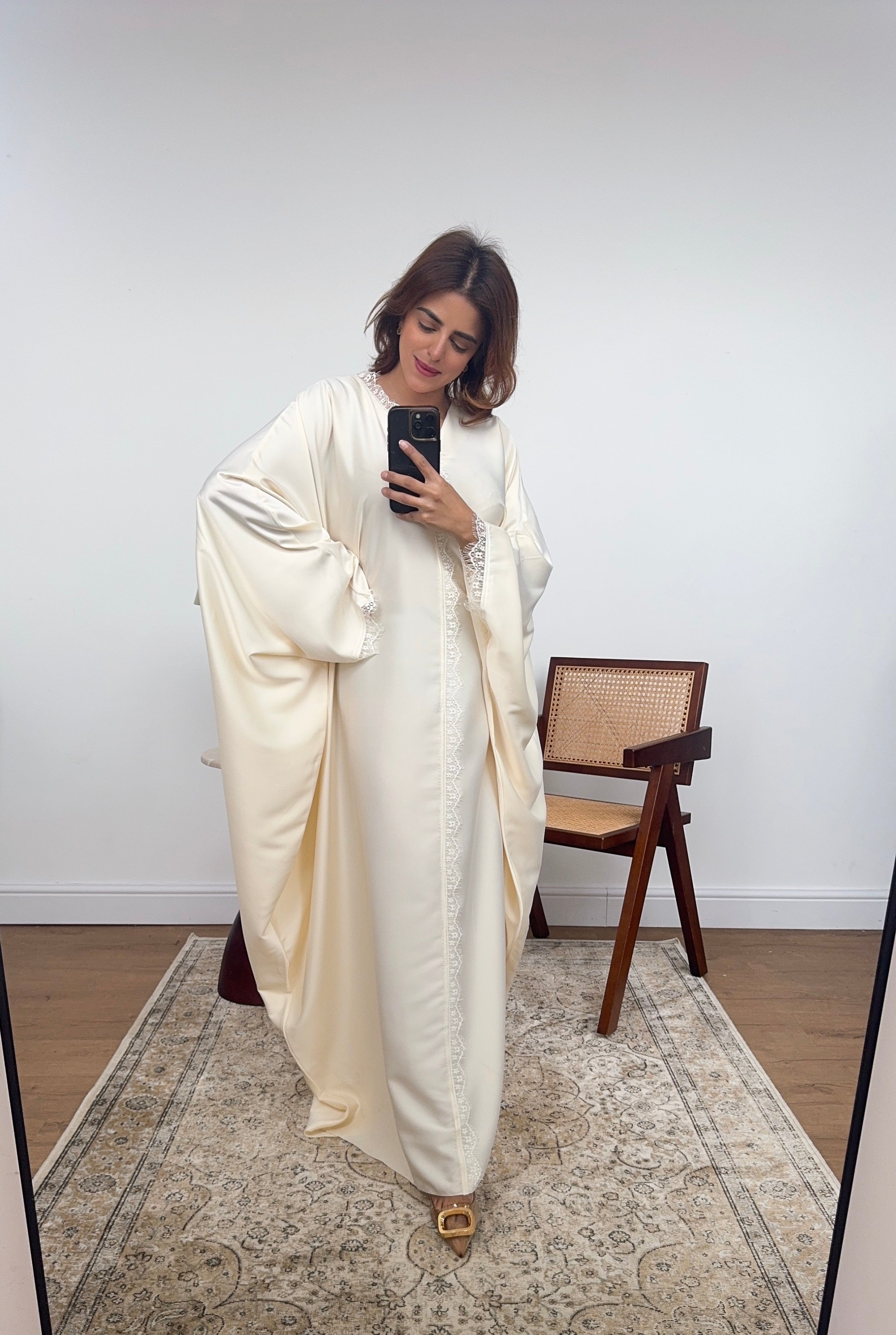 An expression of quiet elegance, this ivory abaya is crafted from premium fluid fabric for a graceful, full-length silhouette. Delicate lace detailing along the neckline, front, and cuffs adds refined femininity while maintaining a clean, minimalist aesthetic.