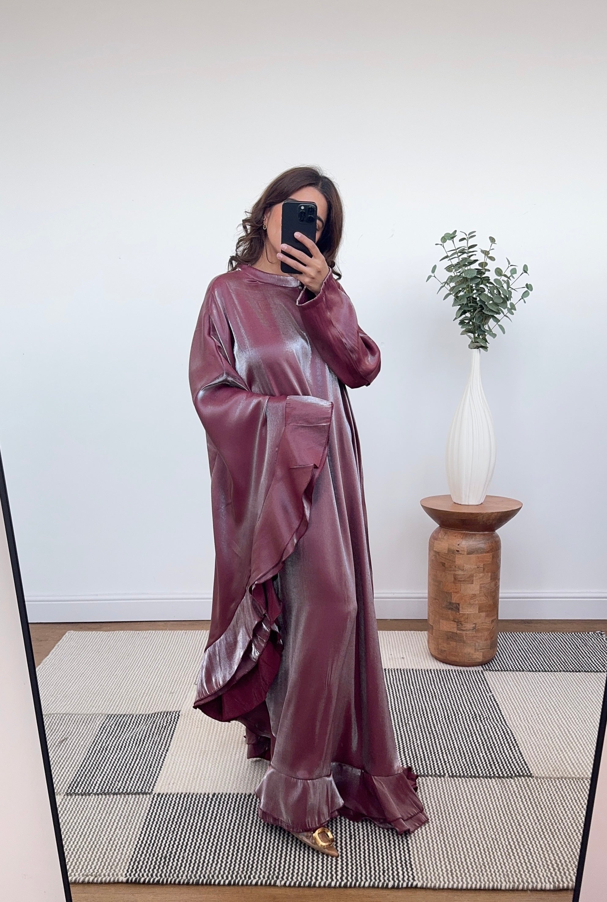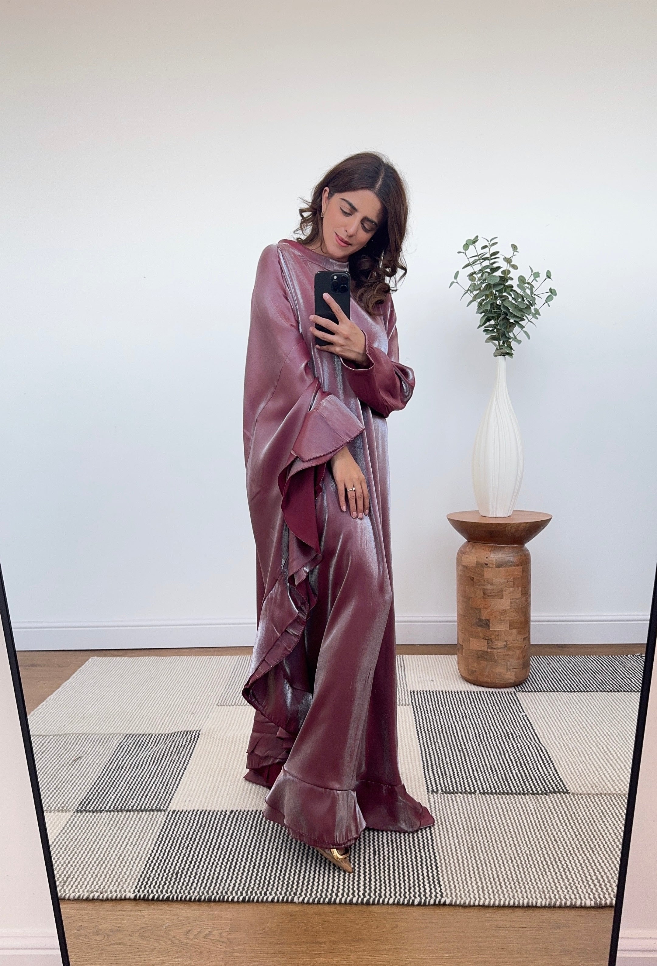Beautiful high neck long shimmer dress with frill detailing and an inner belt for fitting.