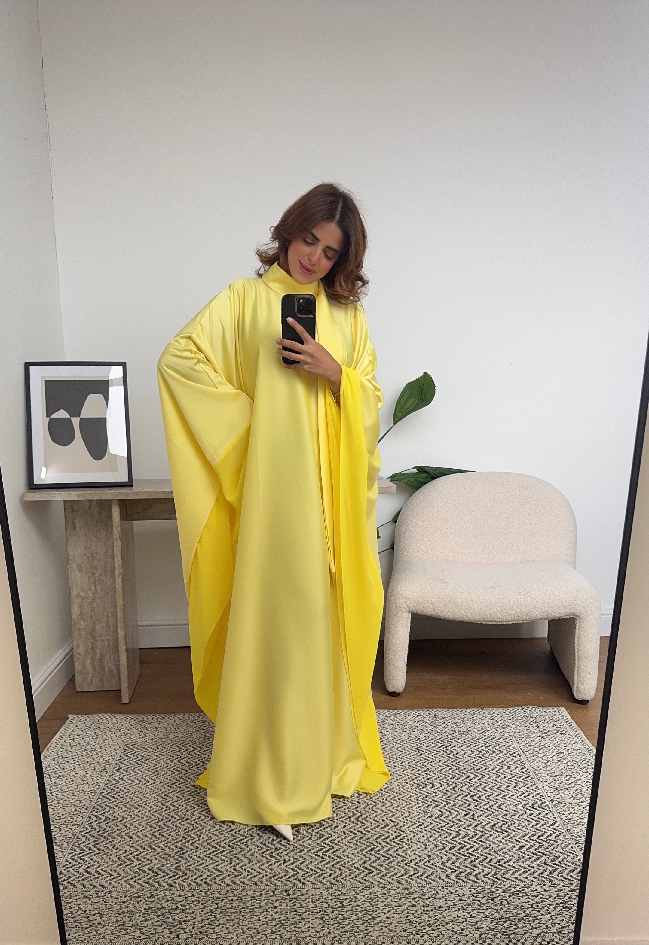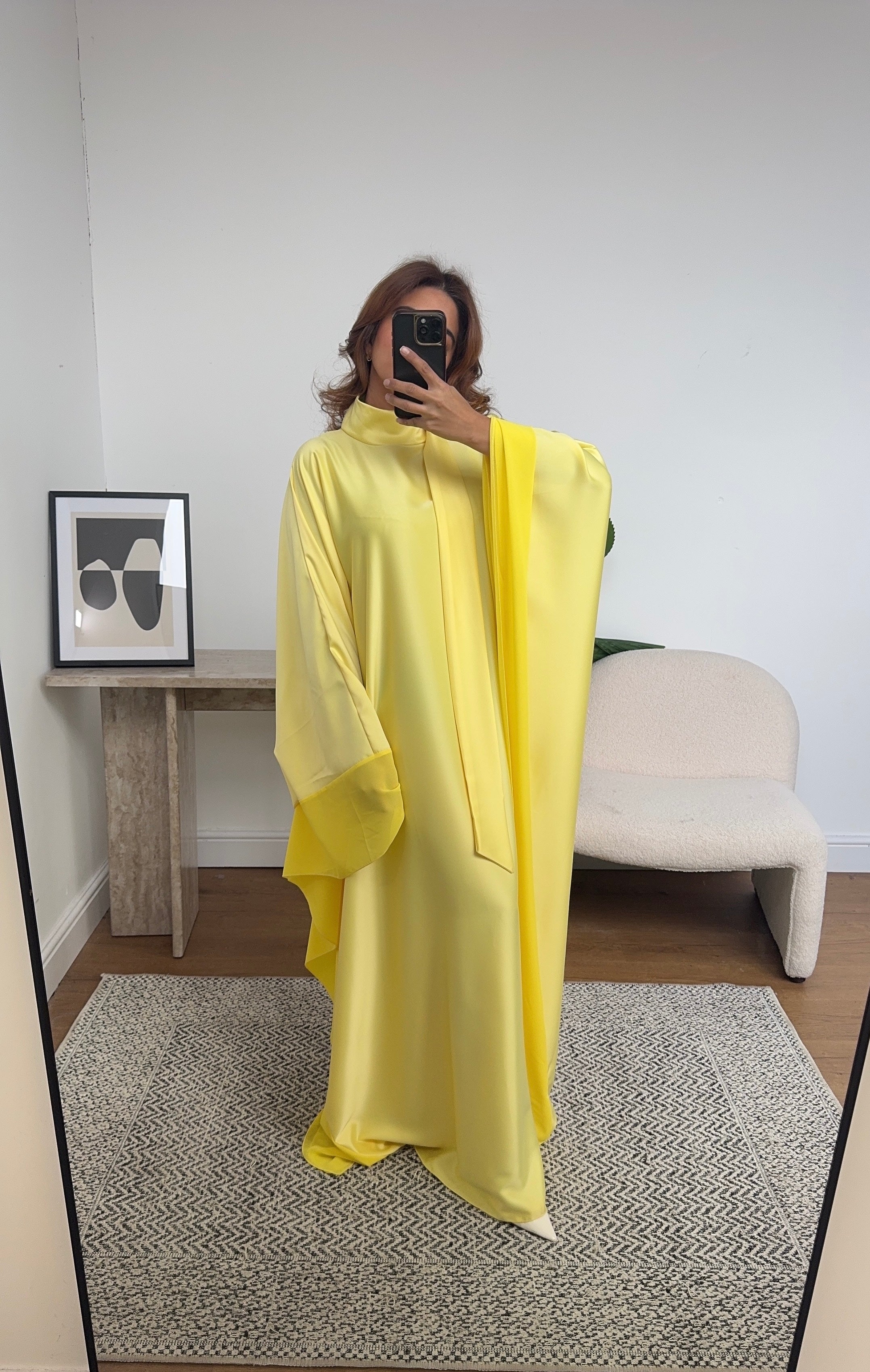 Beautiful heavy weight high neck flare sleeve dress with contrast chiffon fabric sleeve. Back neck tie and scarf detail.