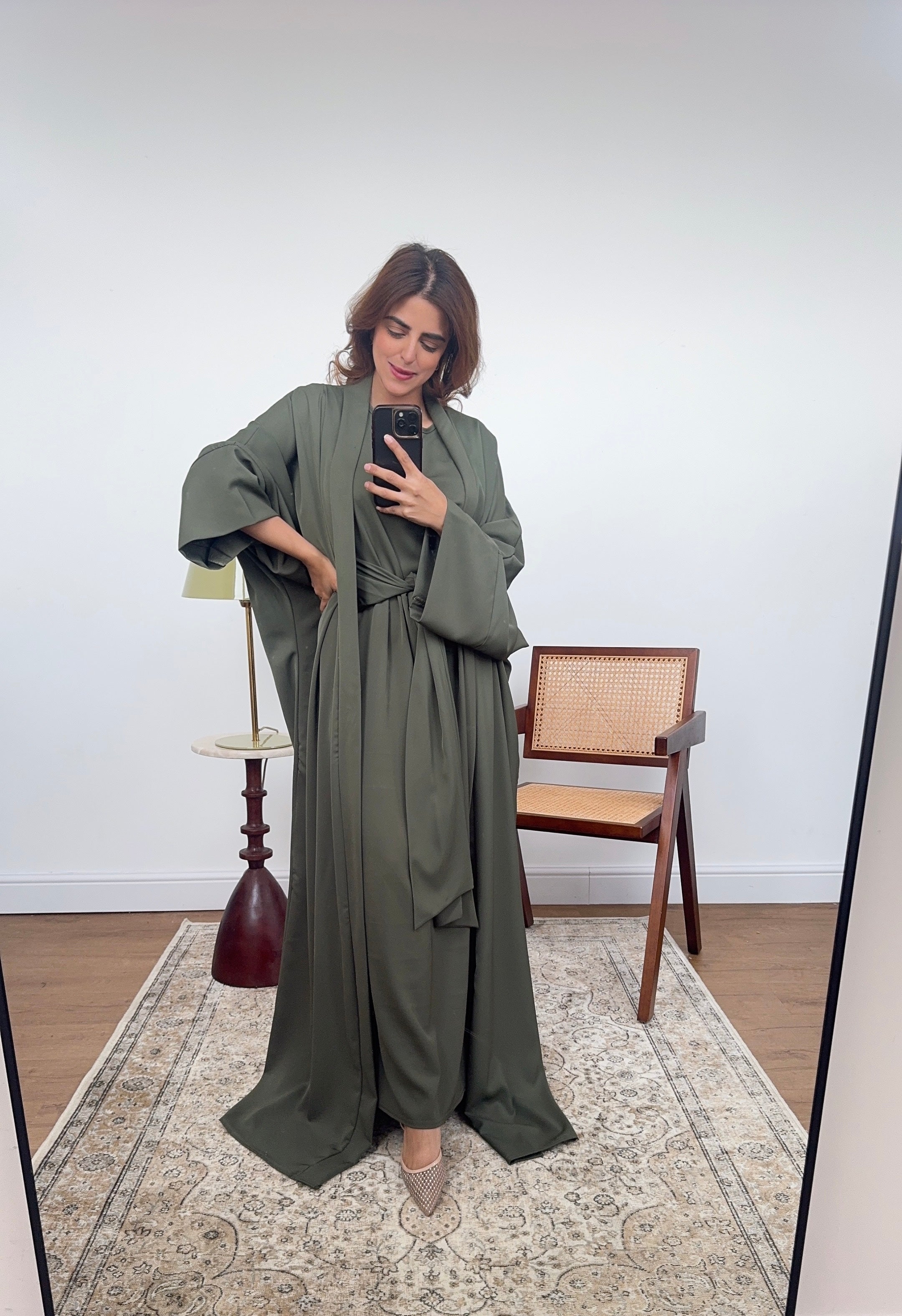 Beautiful two piece featuring a long sleeve inner dress with front tie and a open long kimono.