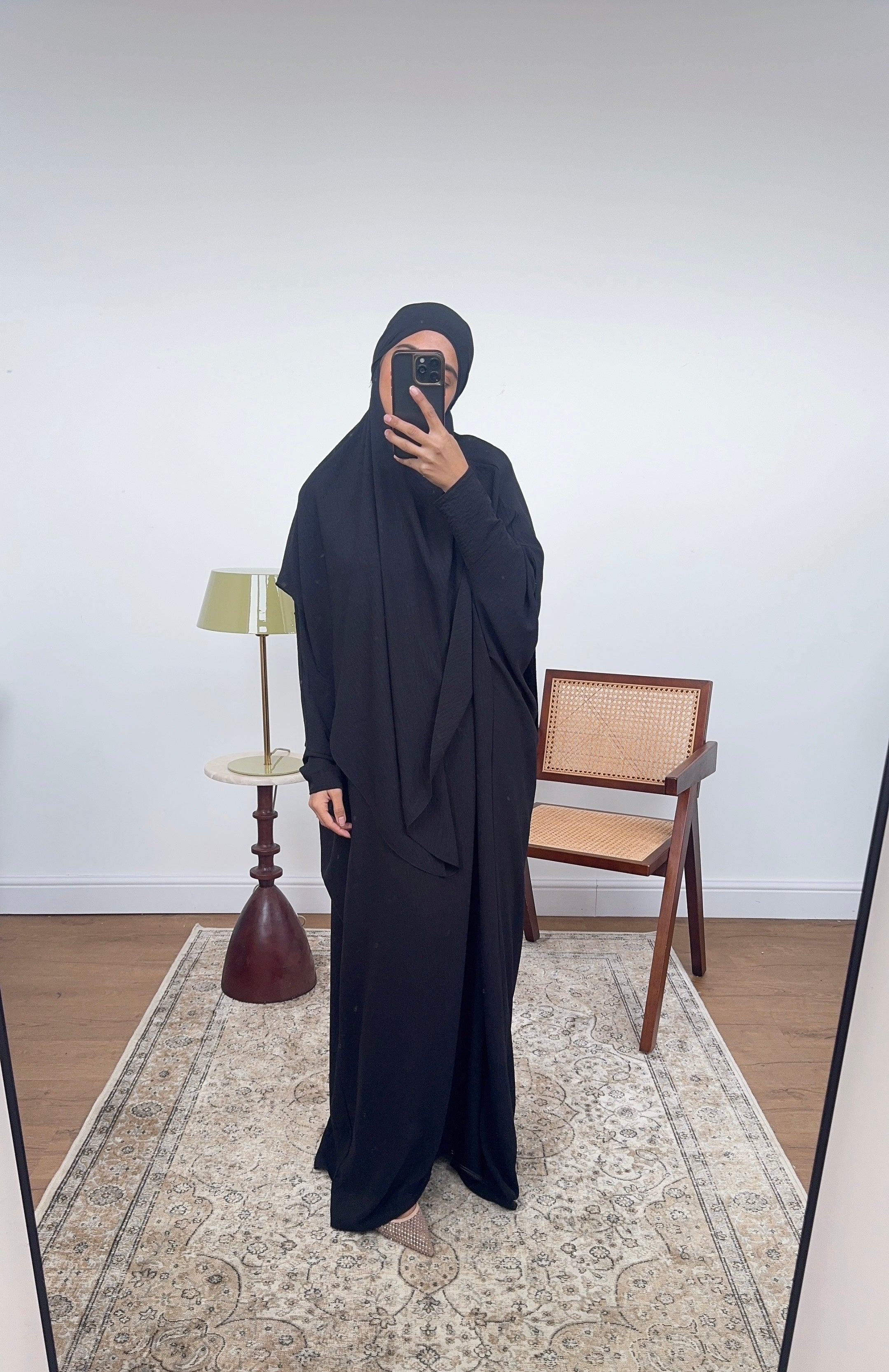 Two piece khimar set featuring a long sleeve inner abaya with round neck and a tie up khimar. Perfect to pray in