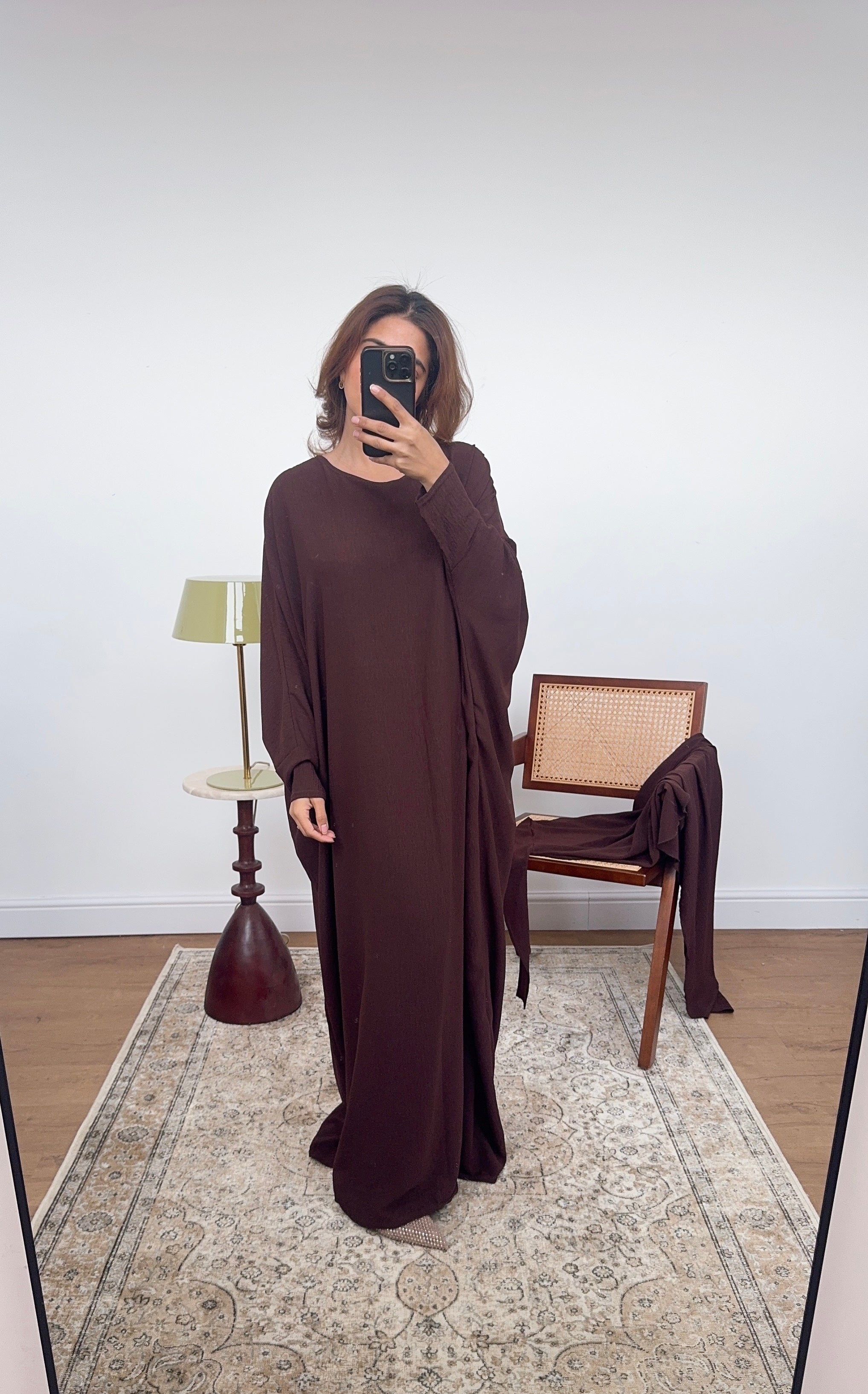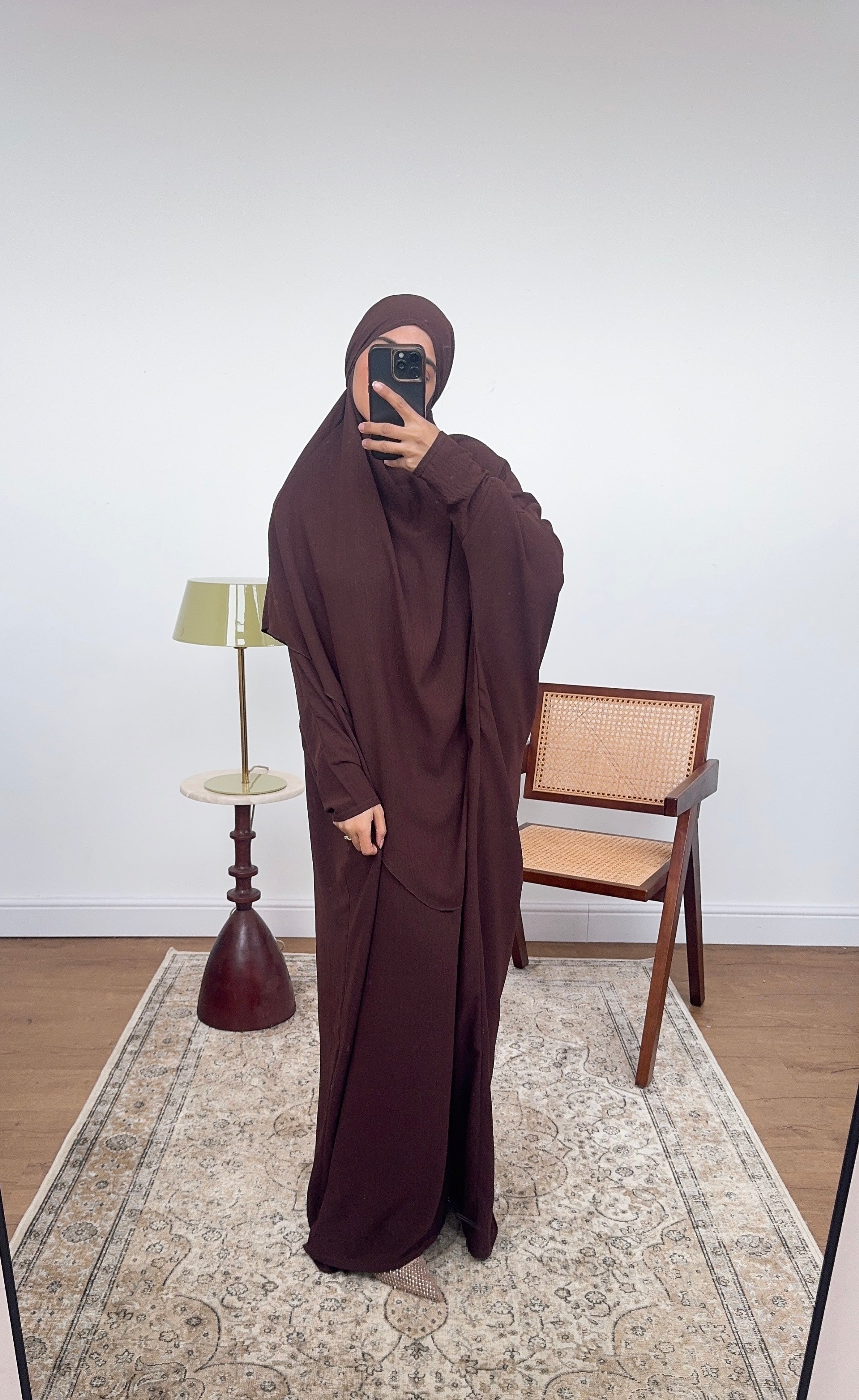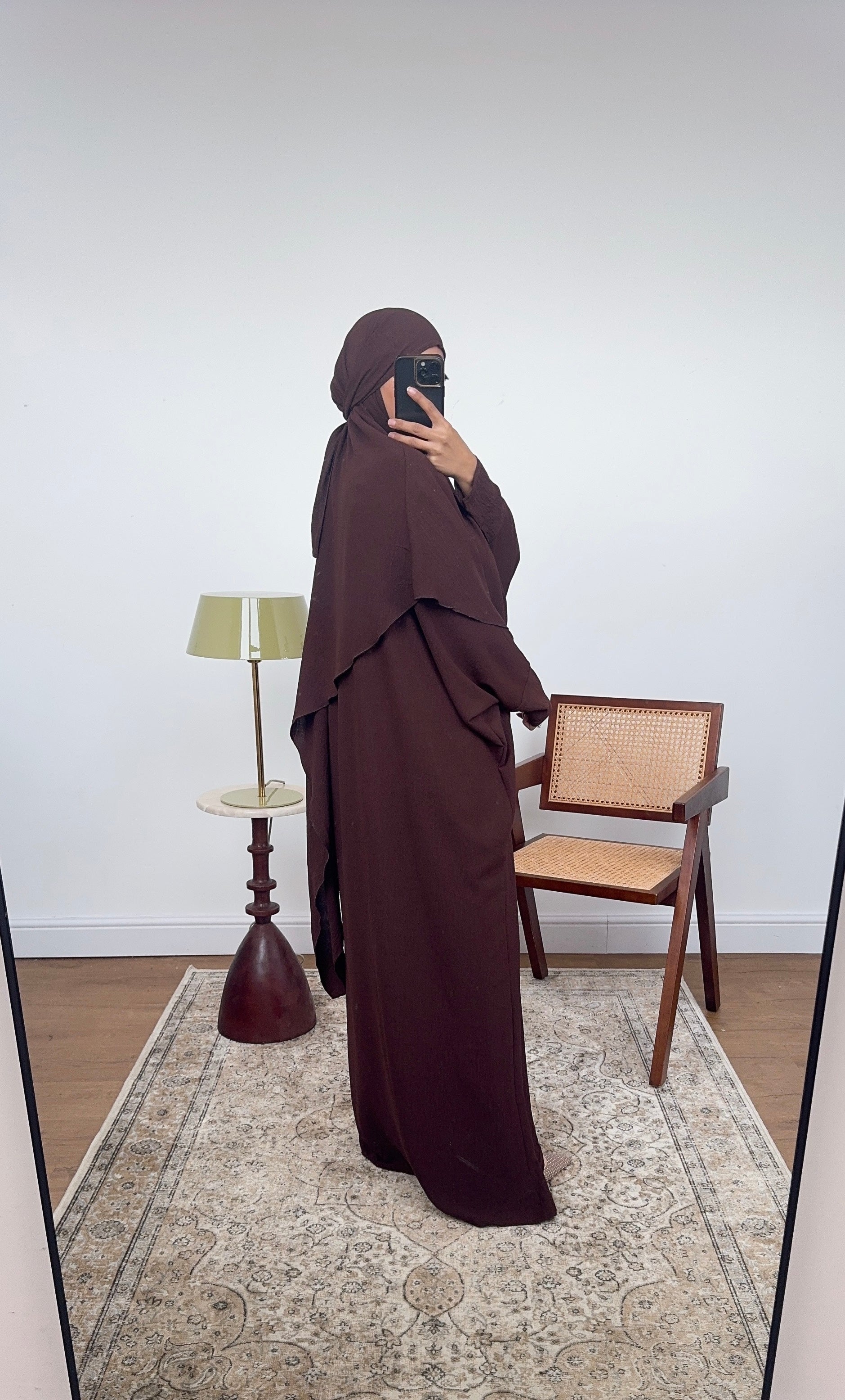 Two piece khimar set featuring a long sleeve inner abaya with round neck and a tie up khimar. Perfect to pray in