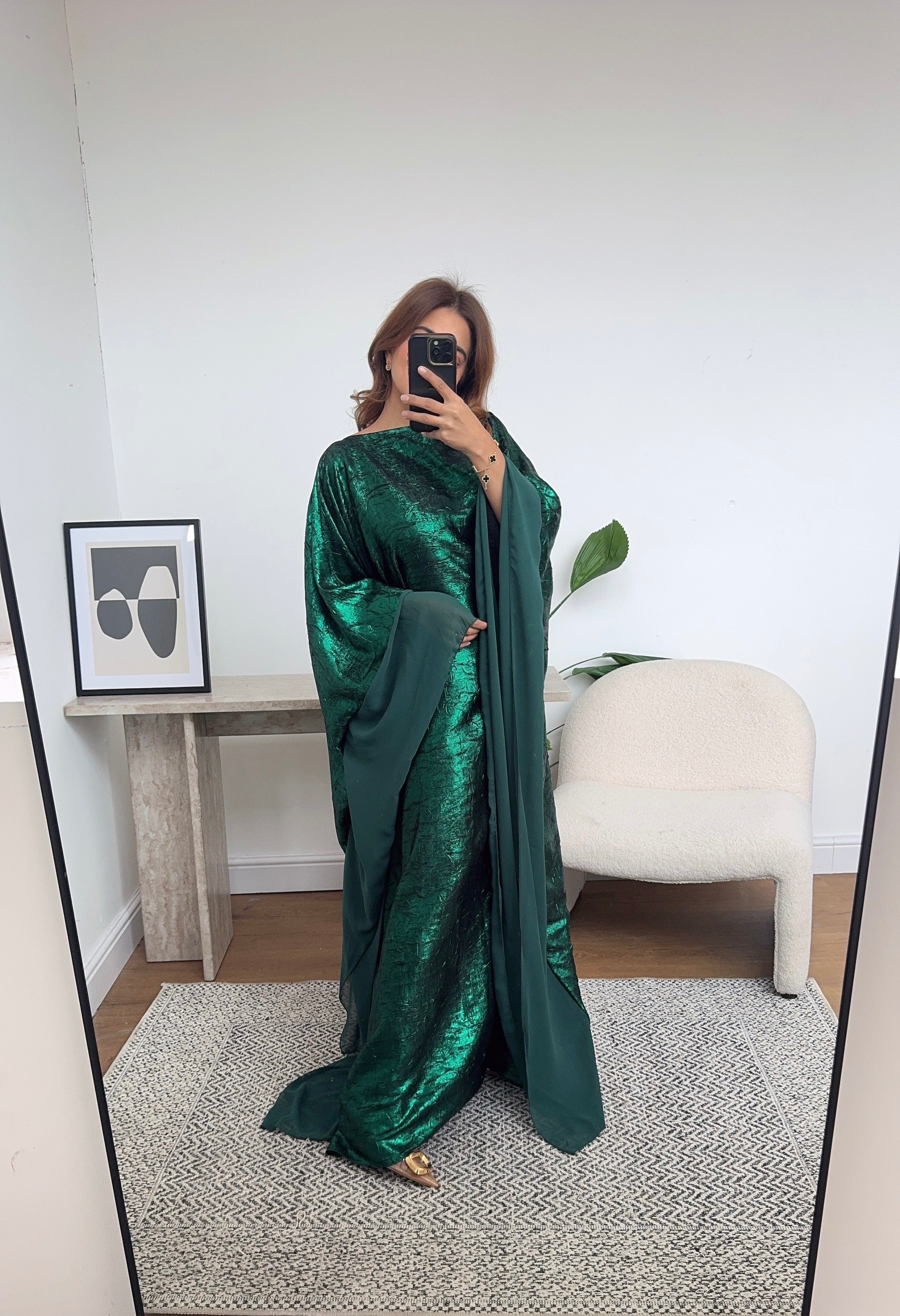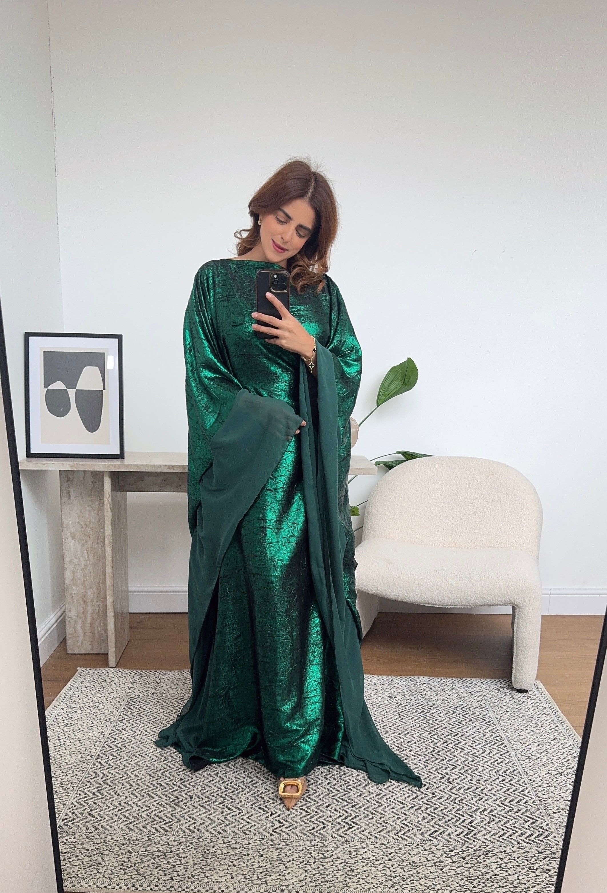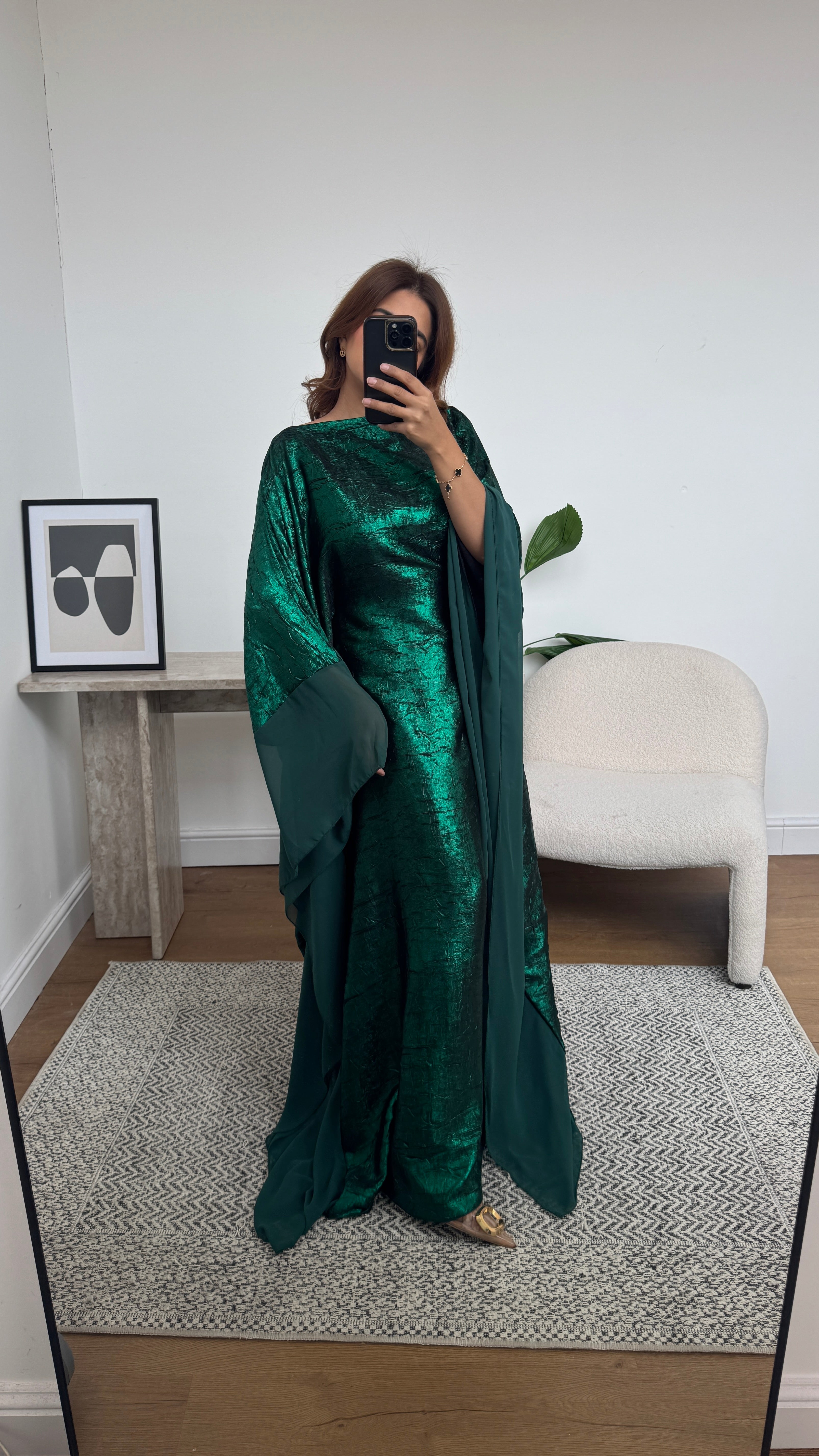 Beautiful long shimmer dress with a round neck and long flared contrast sleeves, has an inner belt for fitting