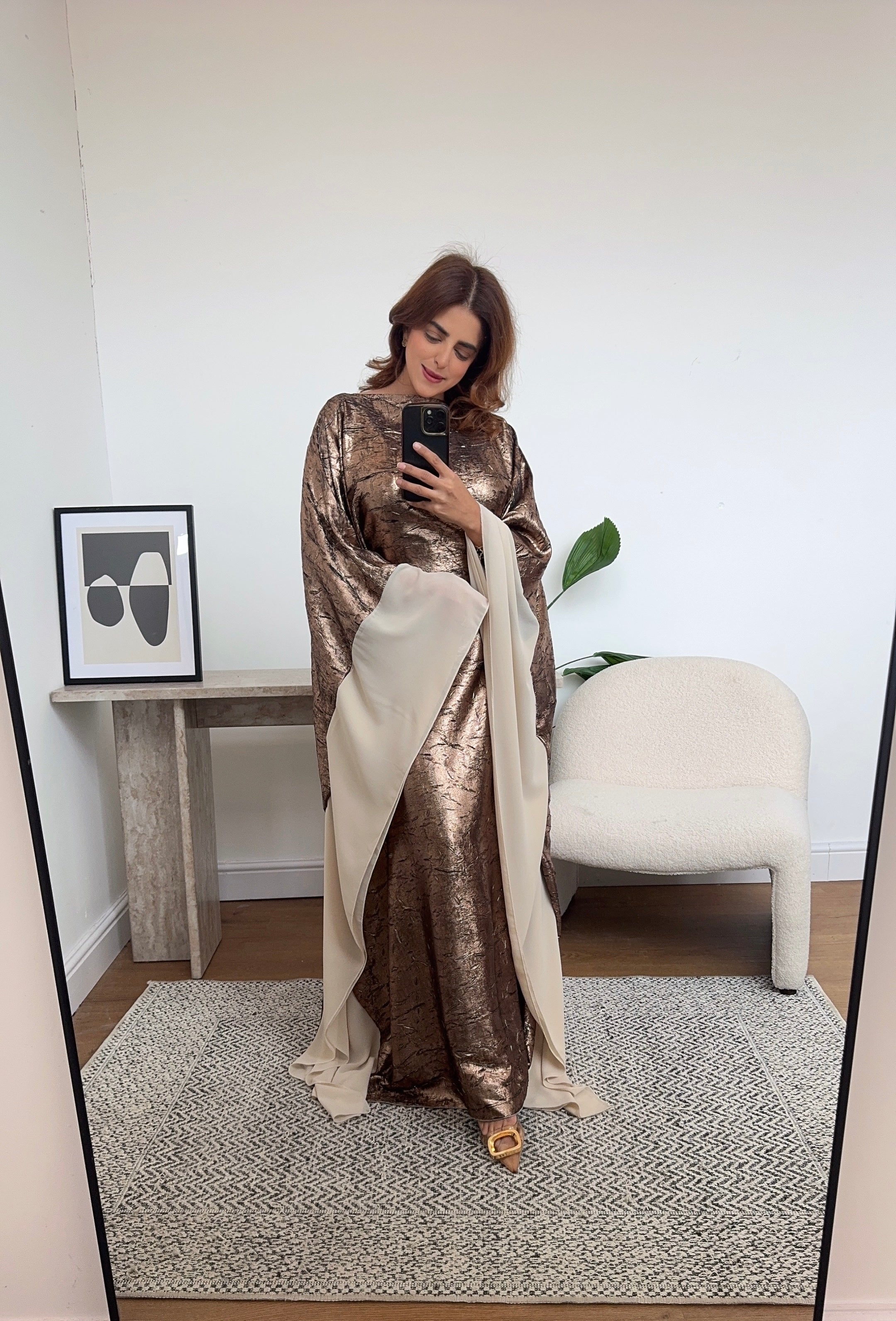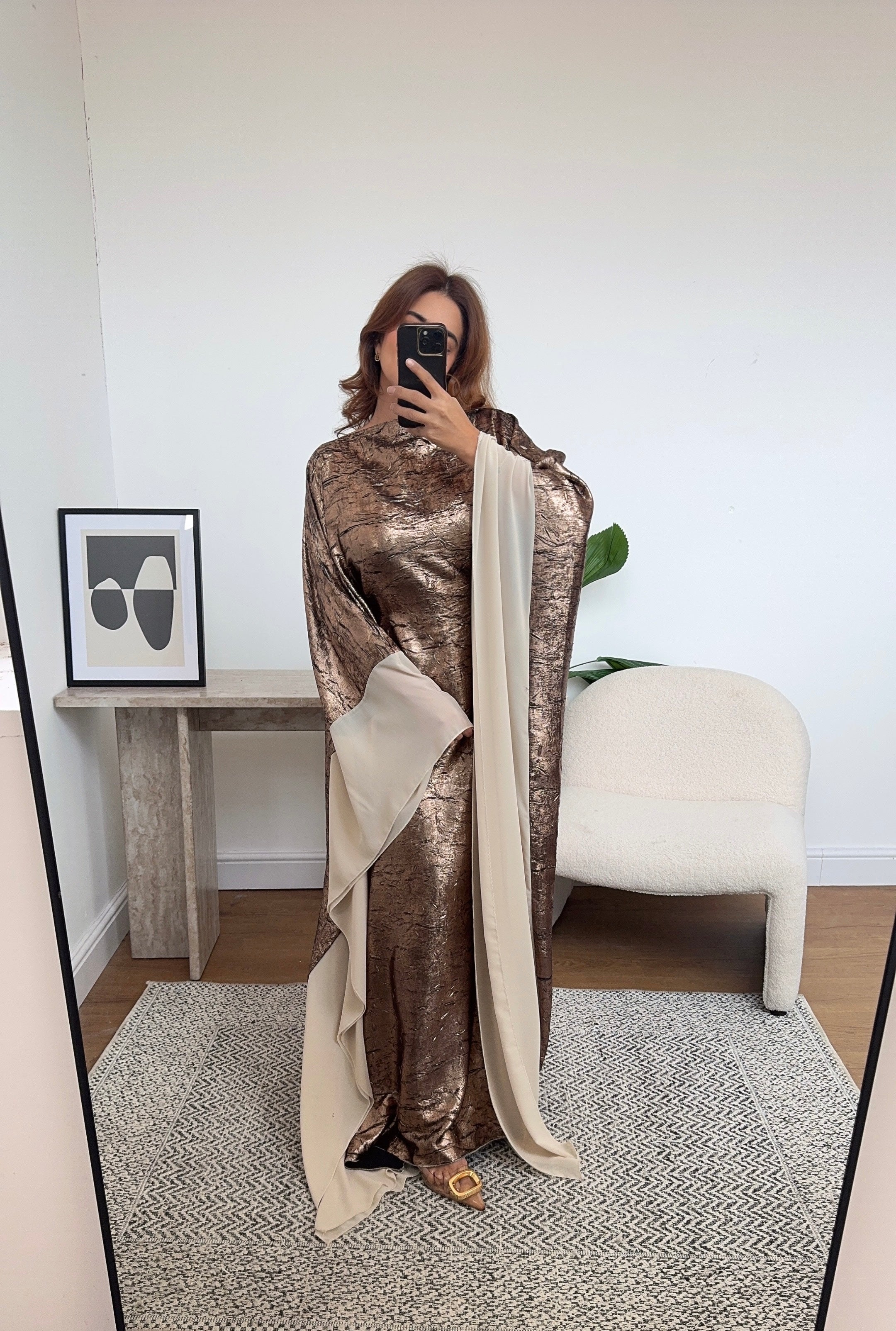 Beautiful long shimmer dress with a round neck and long flared contrast sleeves, has an inner belt for fitting