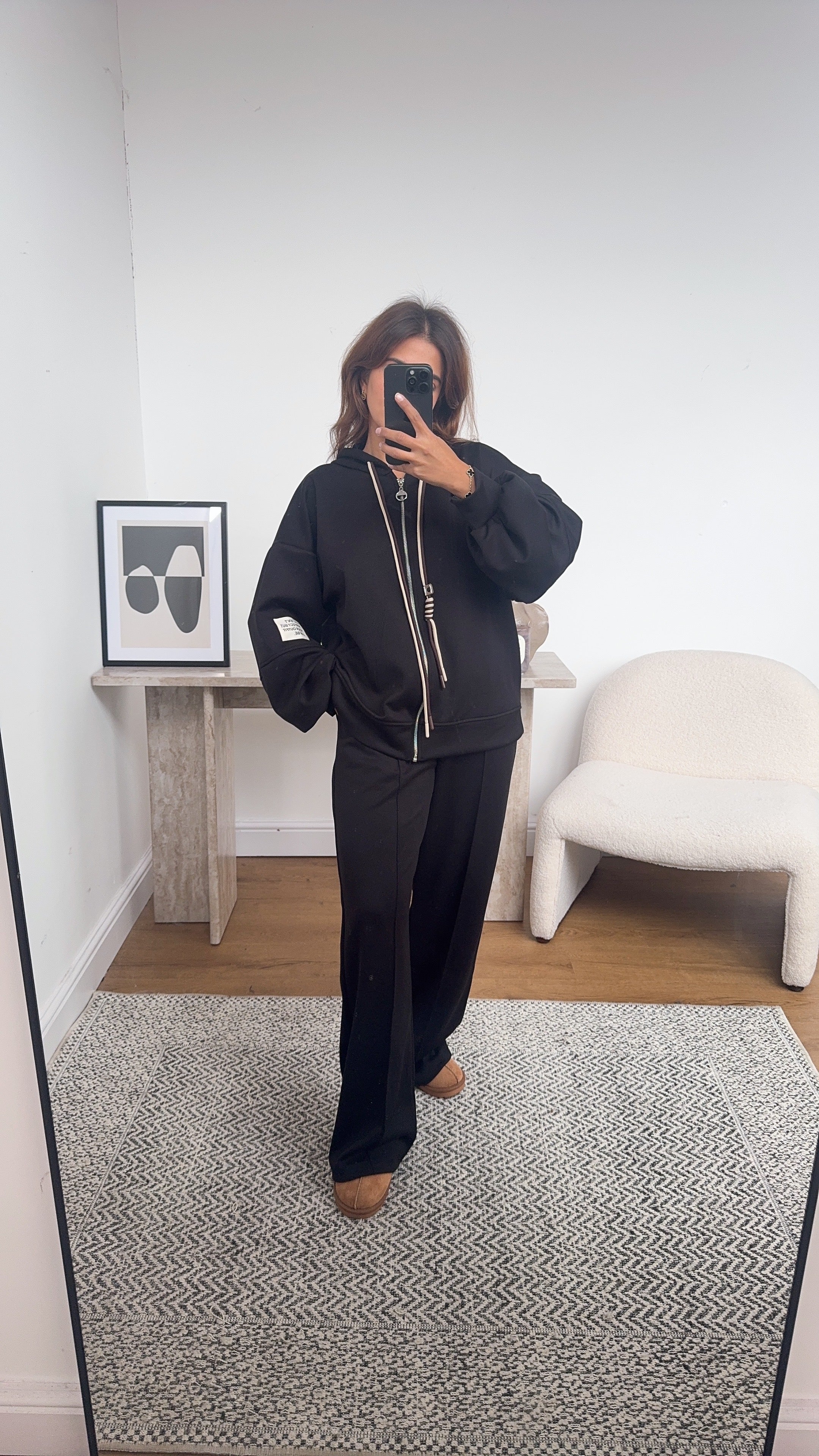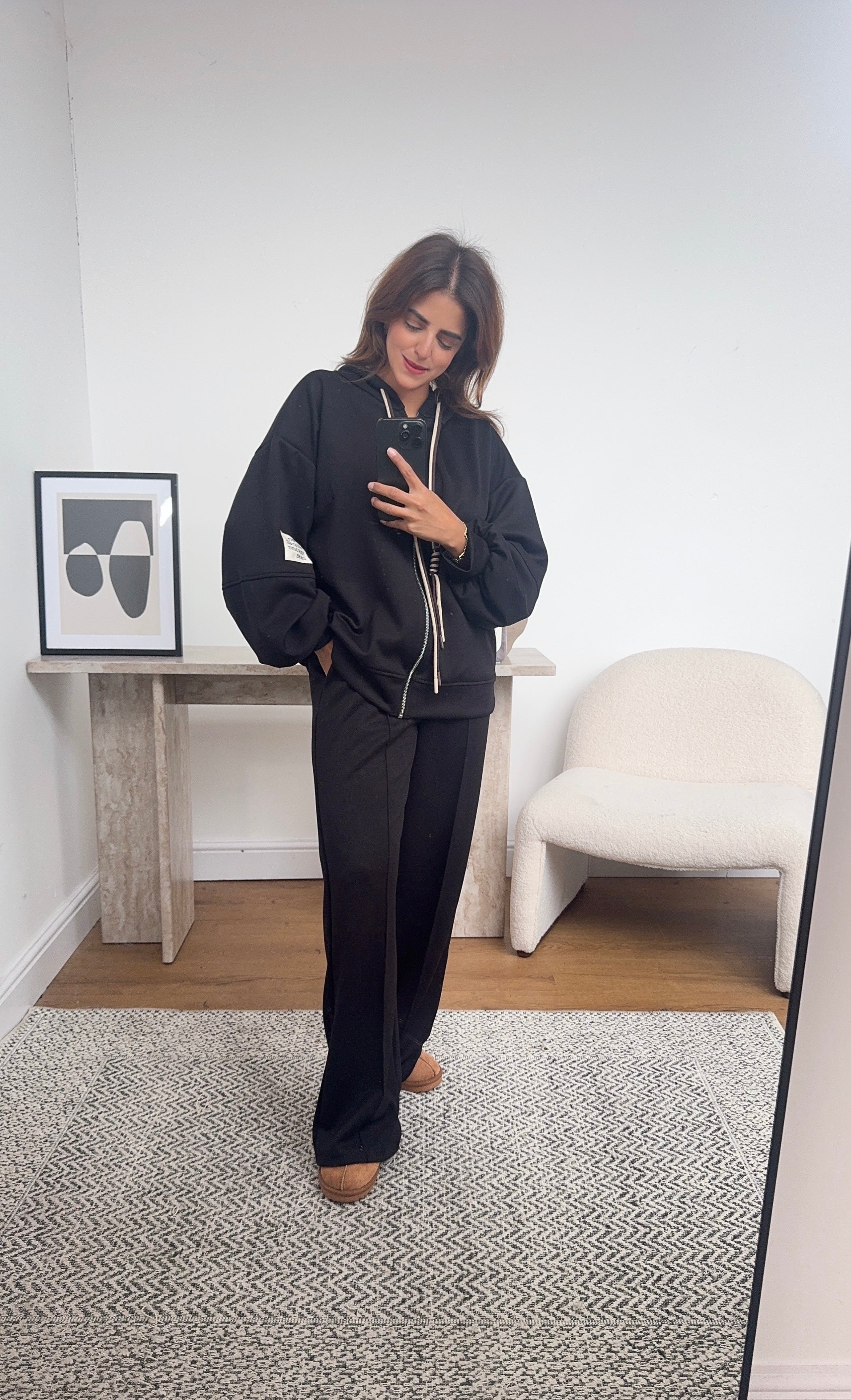 Casual loungewear outfit featuring a long length zip up hoodie and matching joggers with stitch detail on the edges