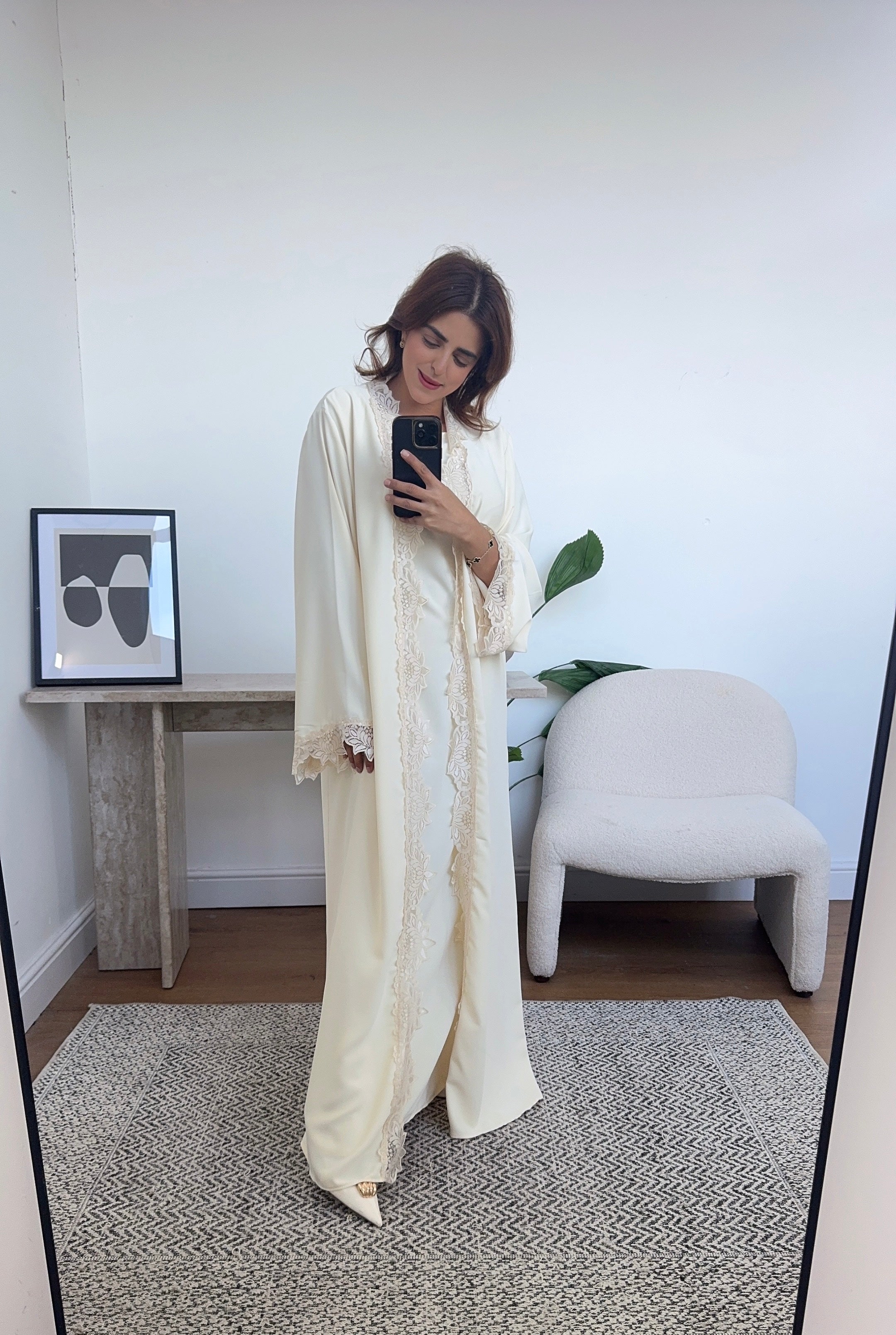 Beautiful two piece set features a open kimono with delicate lace embroidery running down the front opening and around the cuffs, adding a subtle, elegant detail. The sleeves are loose and wide, giving the outfit a relaxed, graceful silhouette. Inner dress has back tie belt for extra fittings