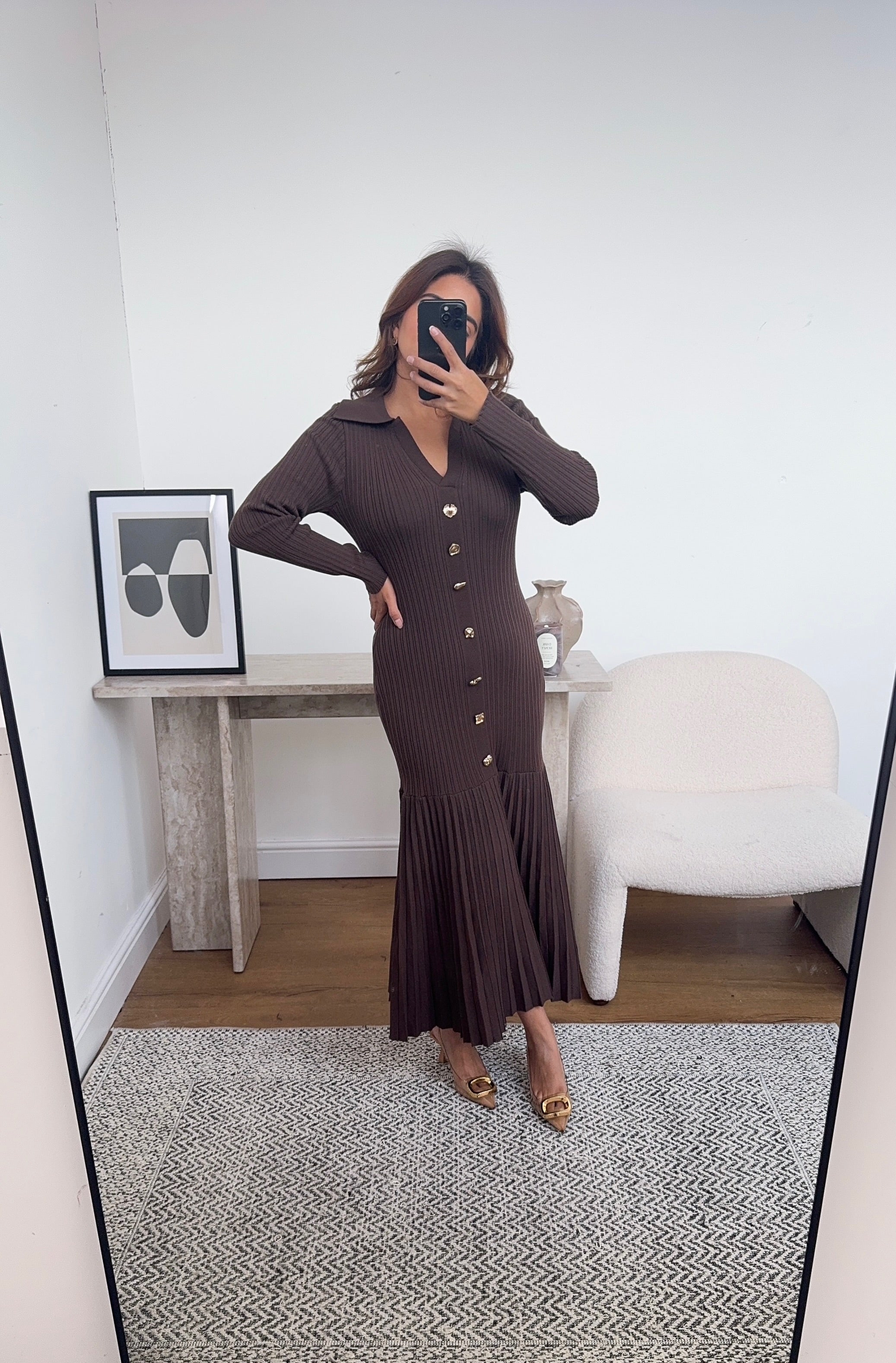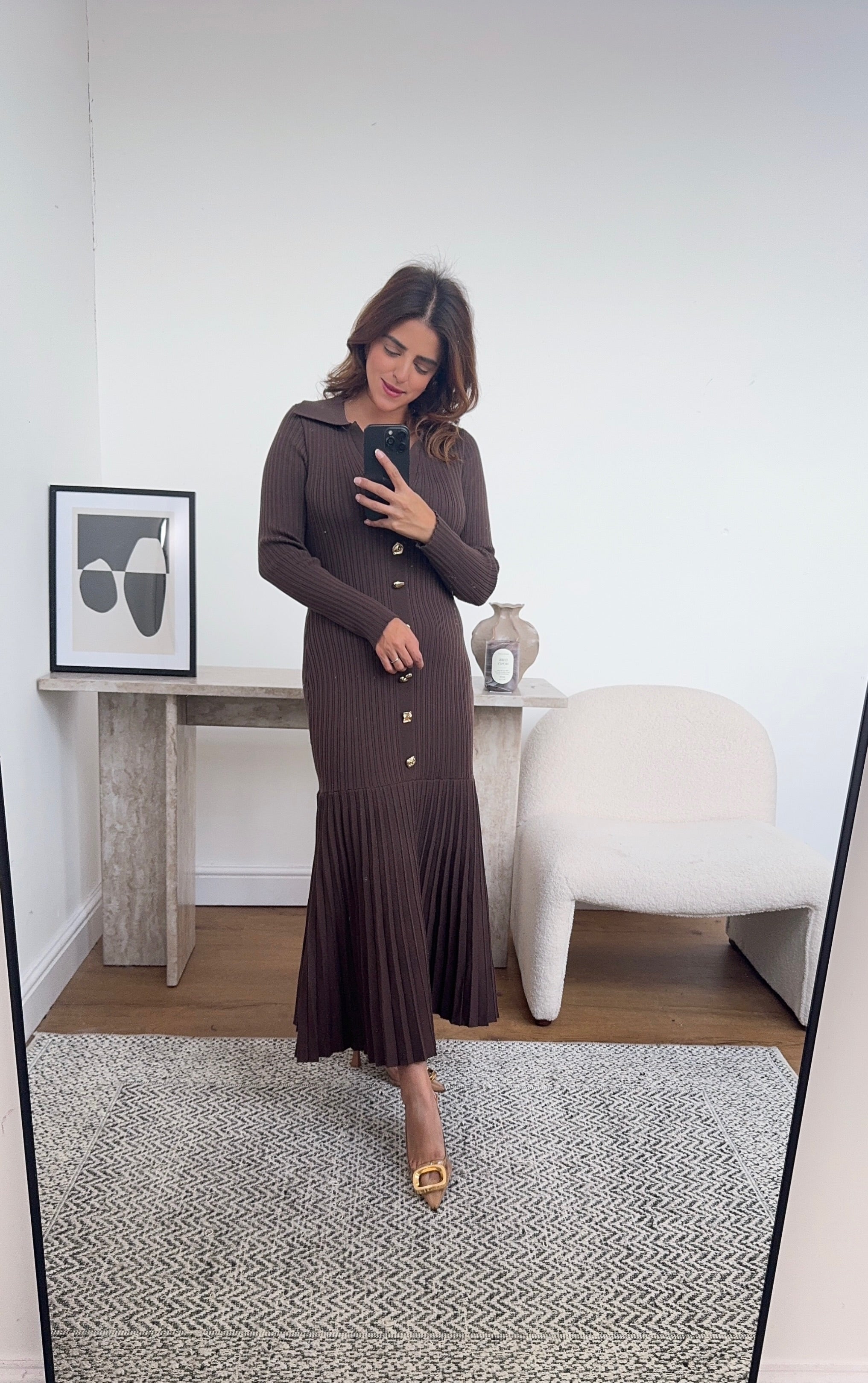 Super chic knit midi fishtail dress with gold button detail. Perfect outfit to go from work to dinner too!