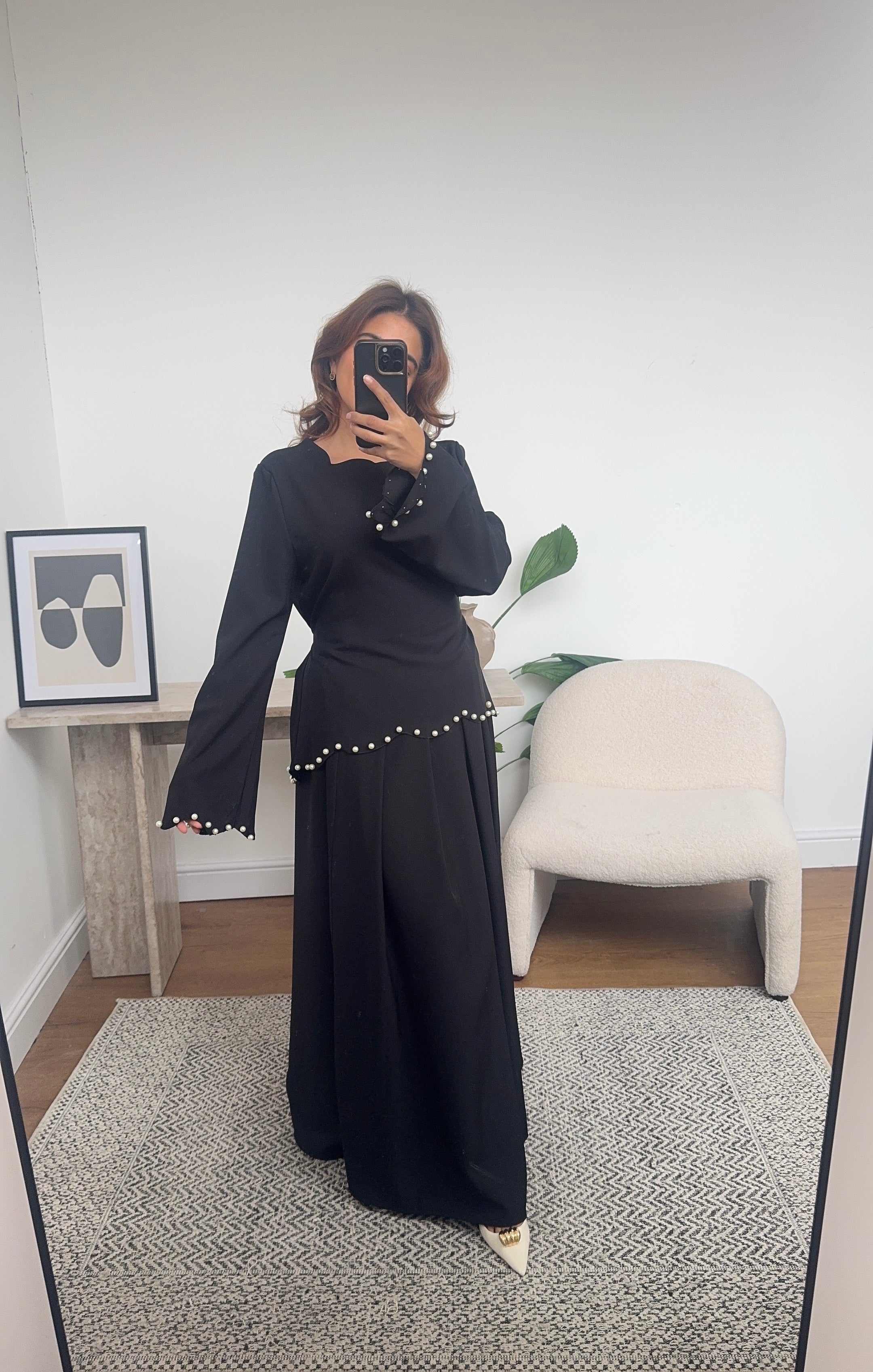 Beautiful two piece coord featuring a tie back top with pearl trim and a pleated skirt elasticated at the waist
