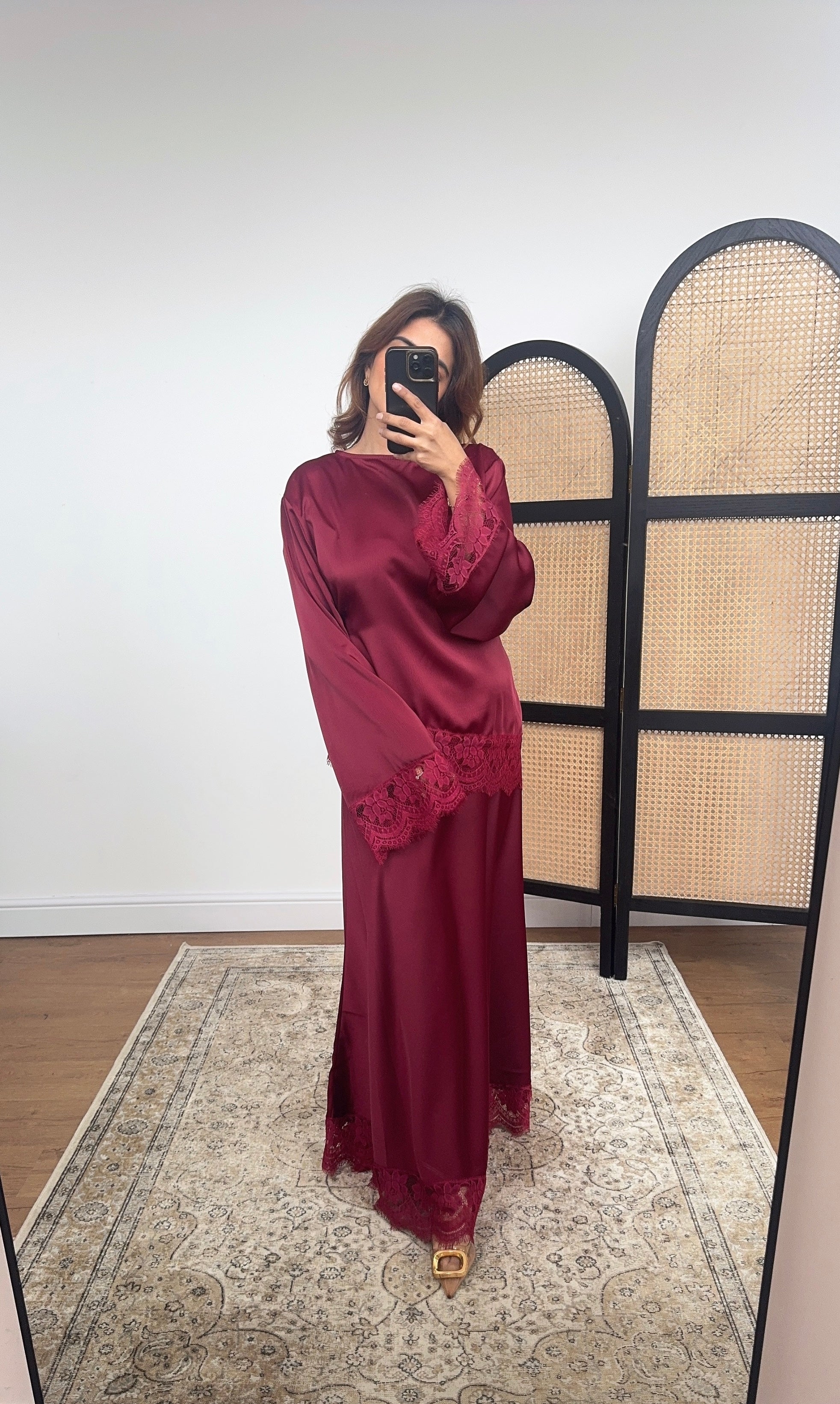 • Overall style: Graceful and sophisticated, blending modest coverage with luxurious details. The soft fabric and lace accents give it a timeless, formal look—well-suited for an evening event, formal gathering, or special occasion.