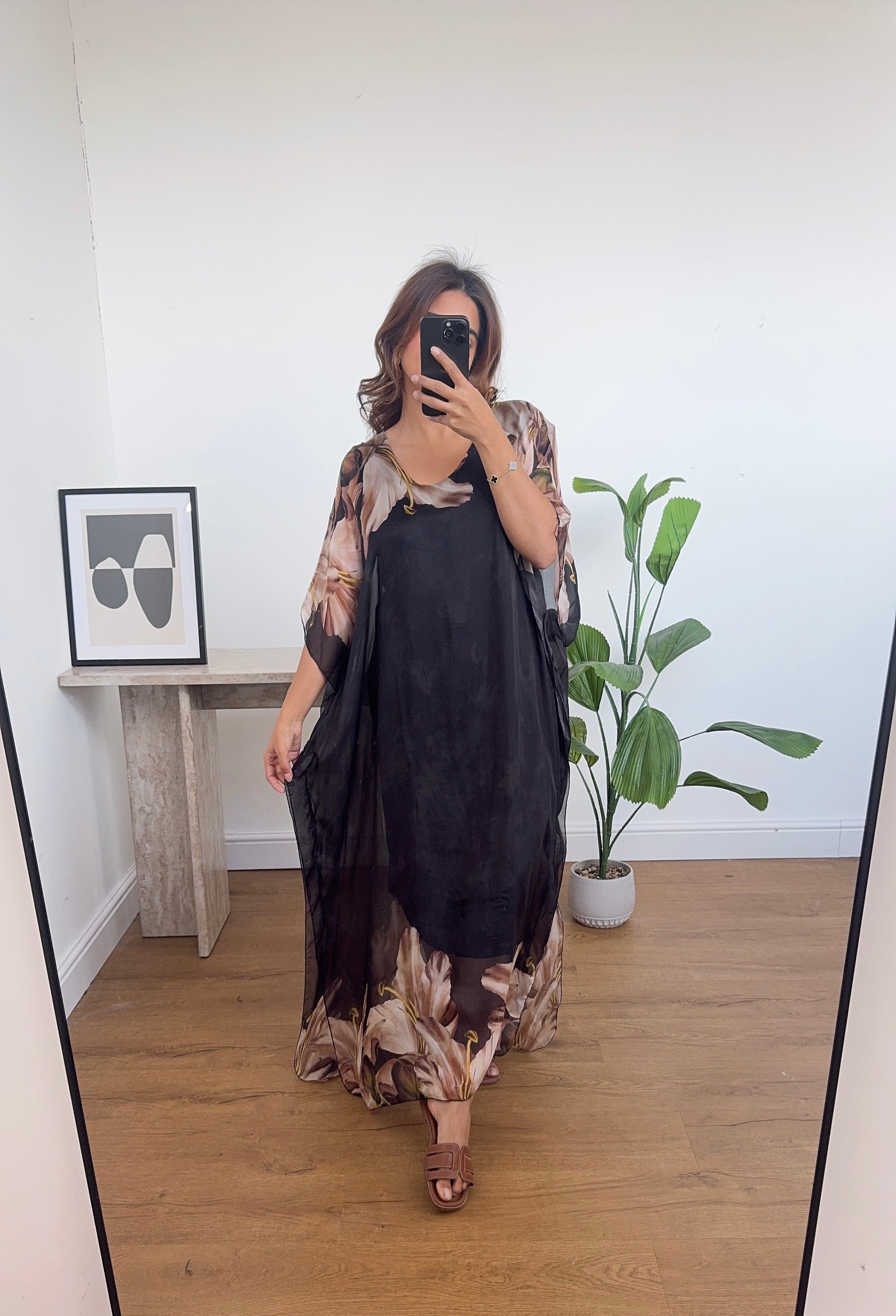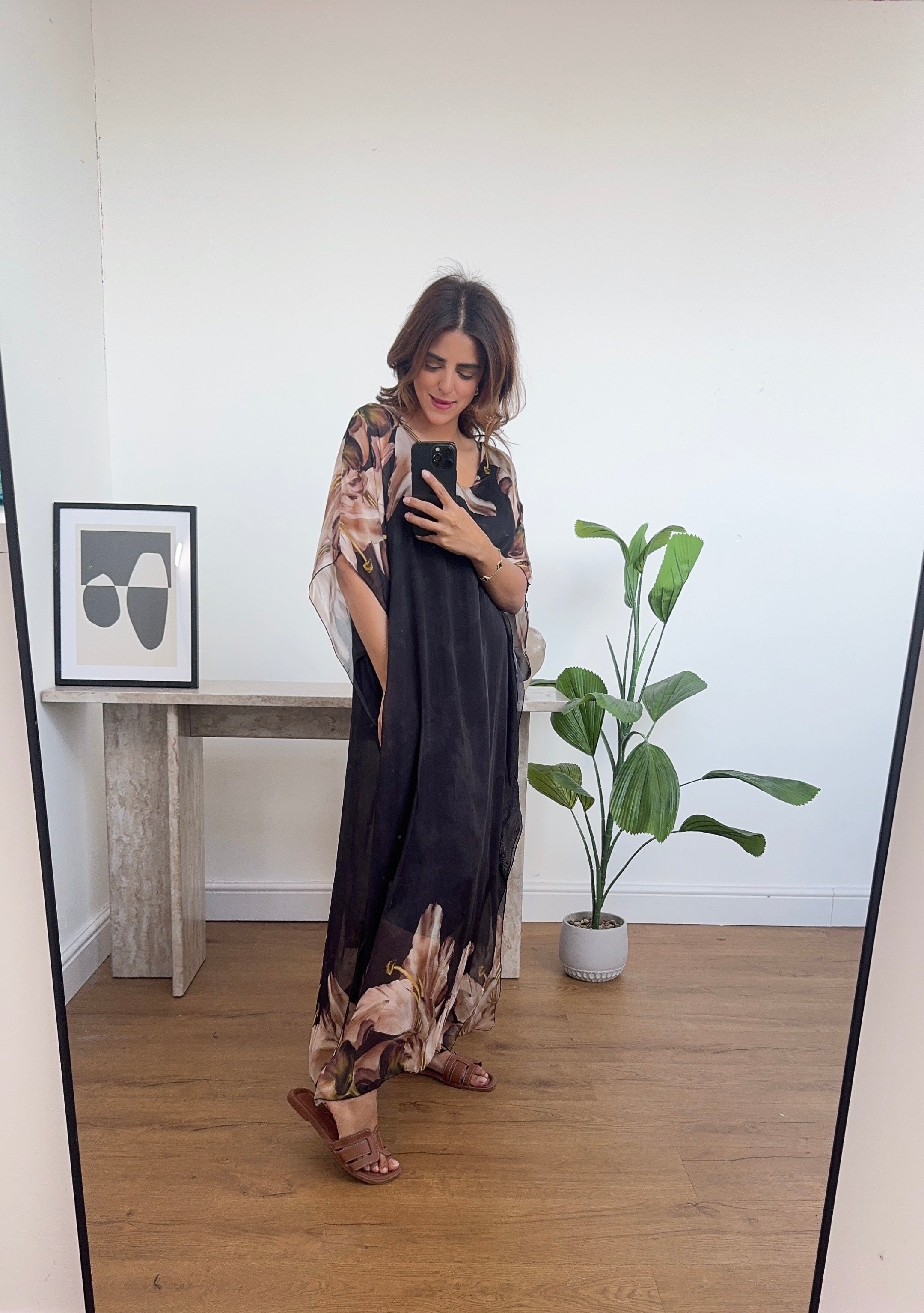 Beautiful floral flowy dress with a v neck and flare sleeves and knee length lining.