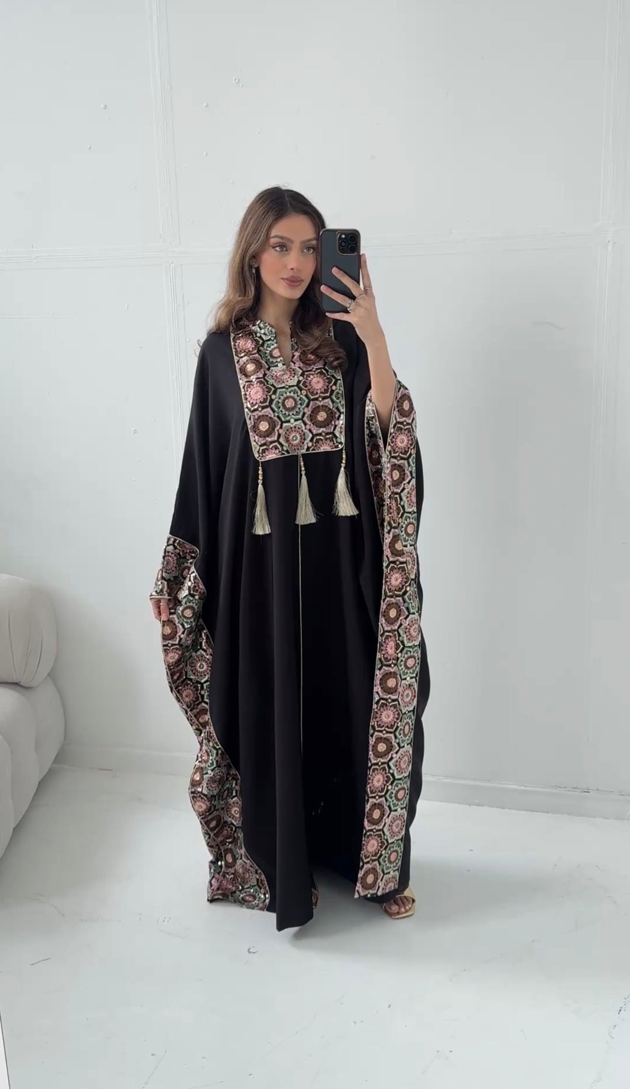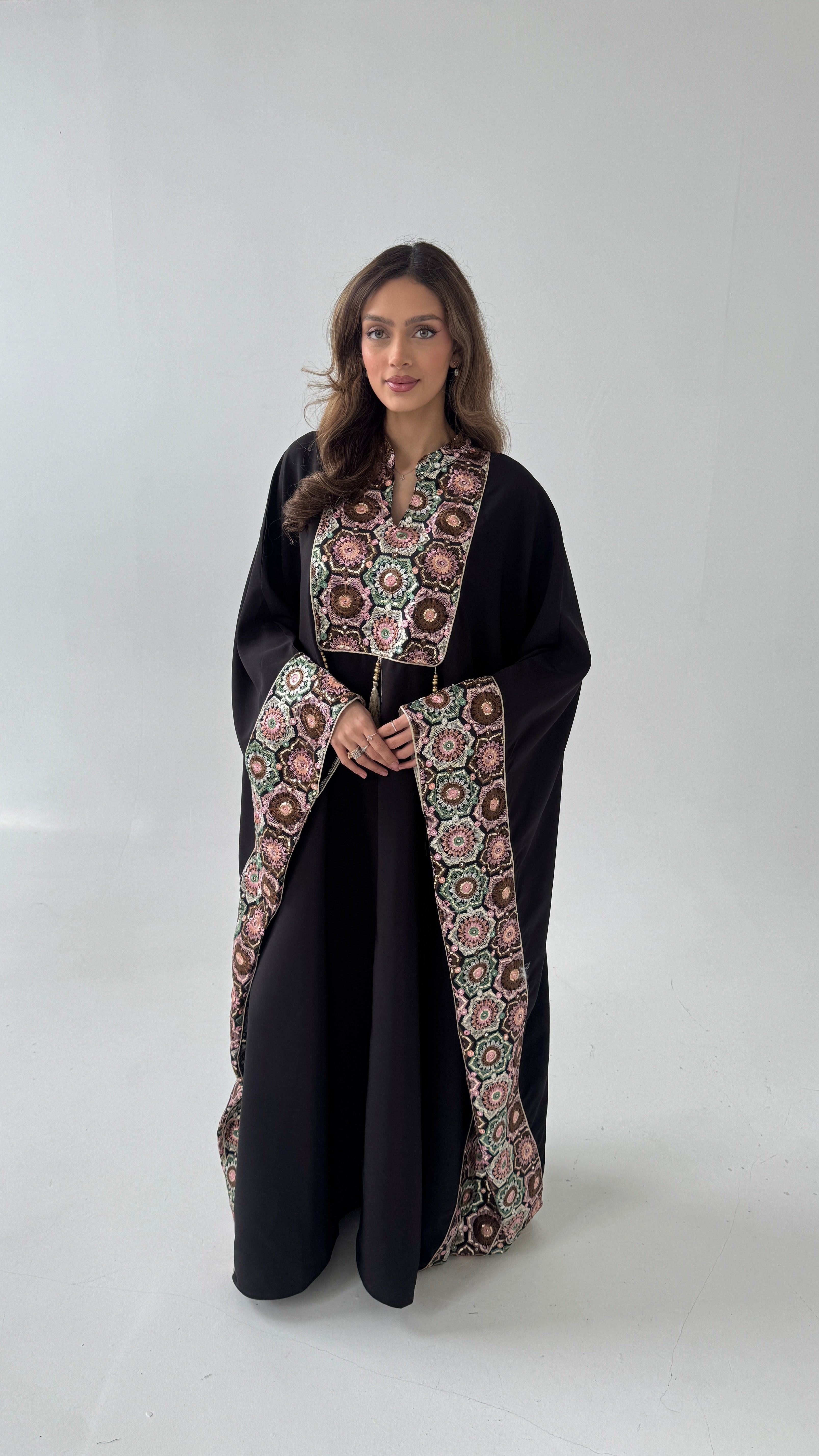 Elevate your occasion wardrobe with this luxurious black kaftan, featuring intricate embroidered detailing on the neckline and sleeves. Designed with a graceful, flowing silhouette and finished with elegant tassel accents, it offers both comfort and sophistication. Perfect for special occasions or refined everyday wear.