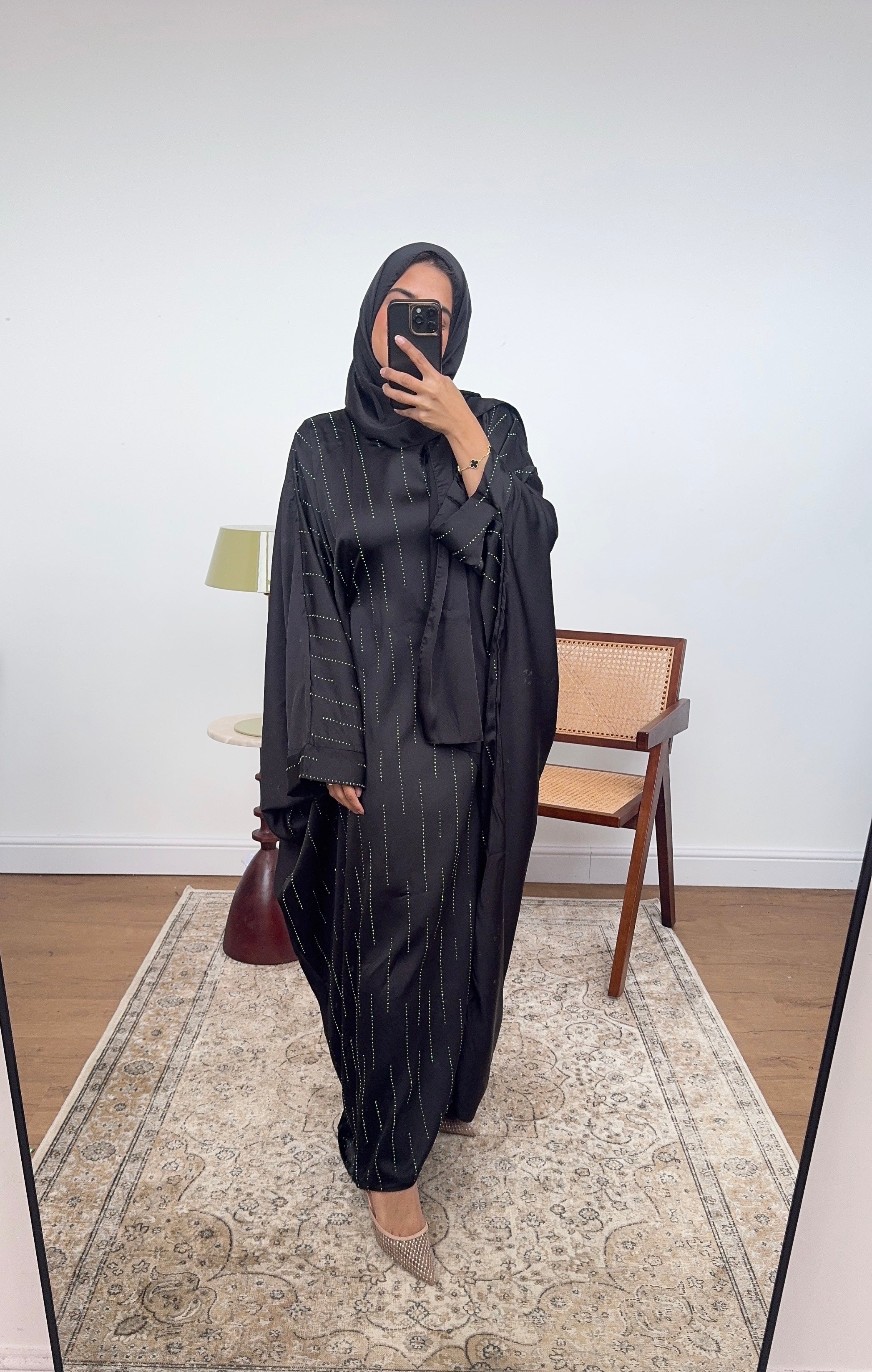 Beautiful abaya with diamente detail and inner tie belt for fitting. Scarf attached.