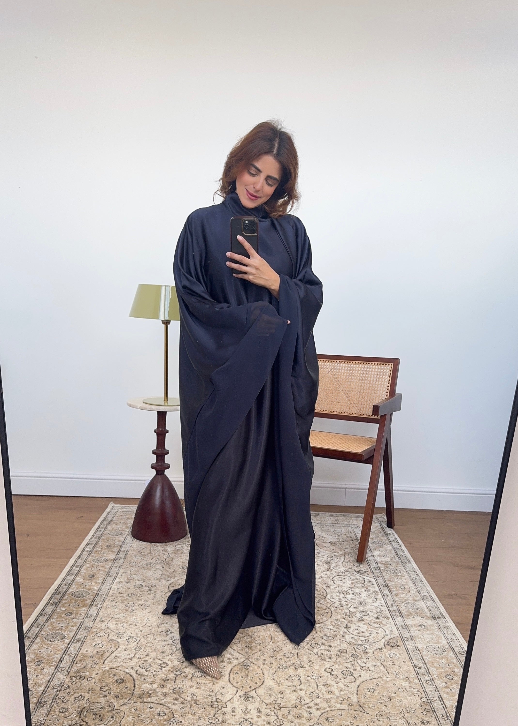 Beautiful heavy weight high neck flare sleeve dress with contrast chiffon fabric sleeve. Back neck tie and scarf detail.