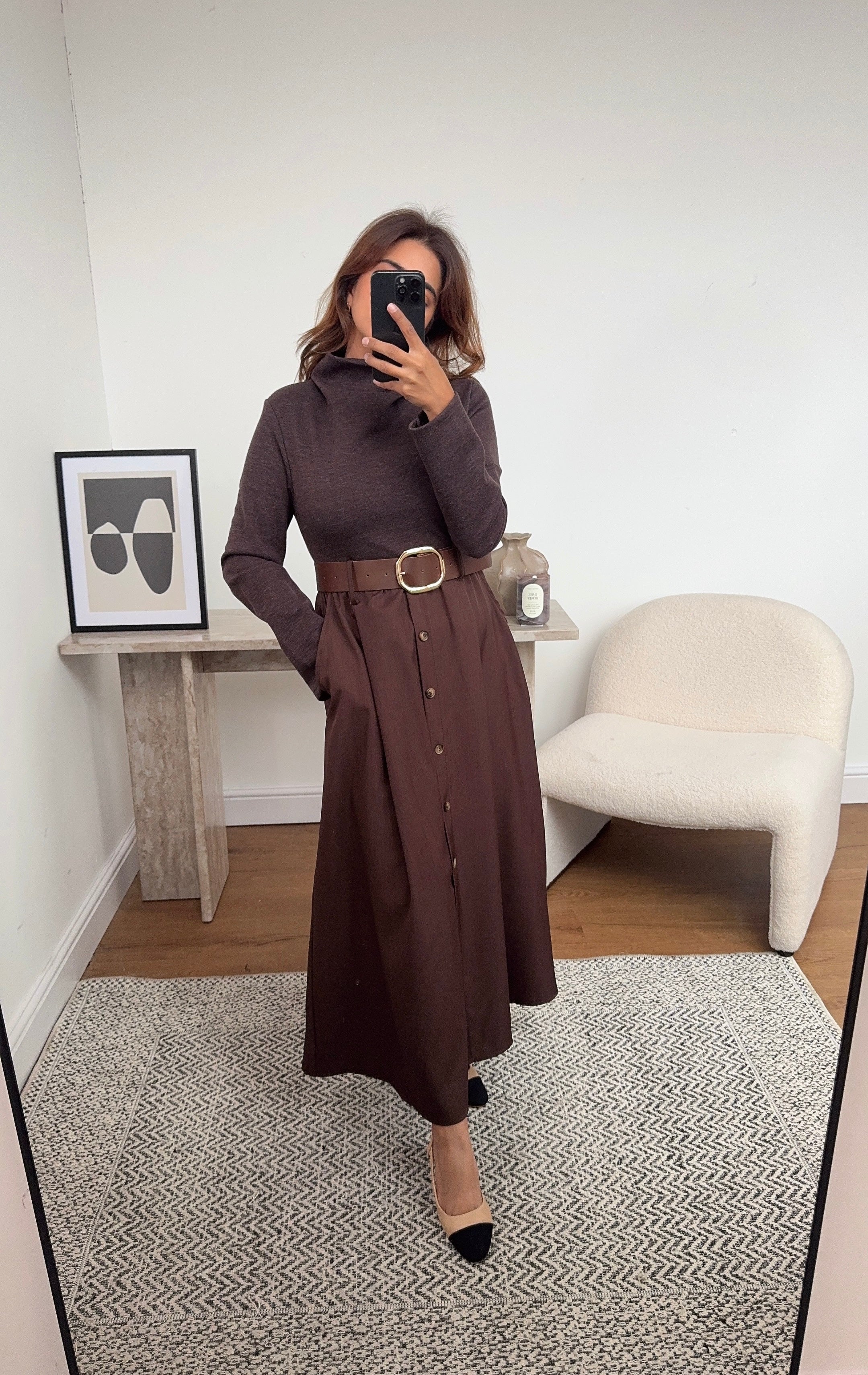 A classic featuring a high neck long sleeve dress with a belt for extra fitting.