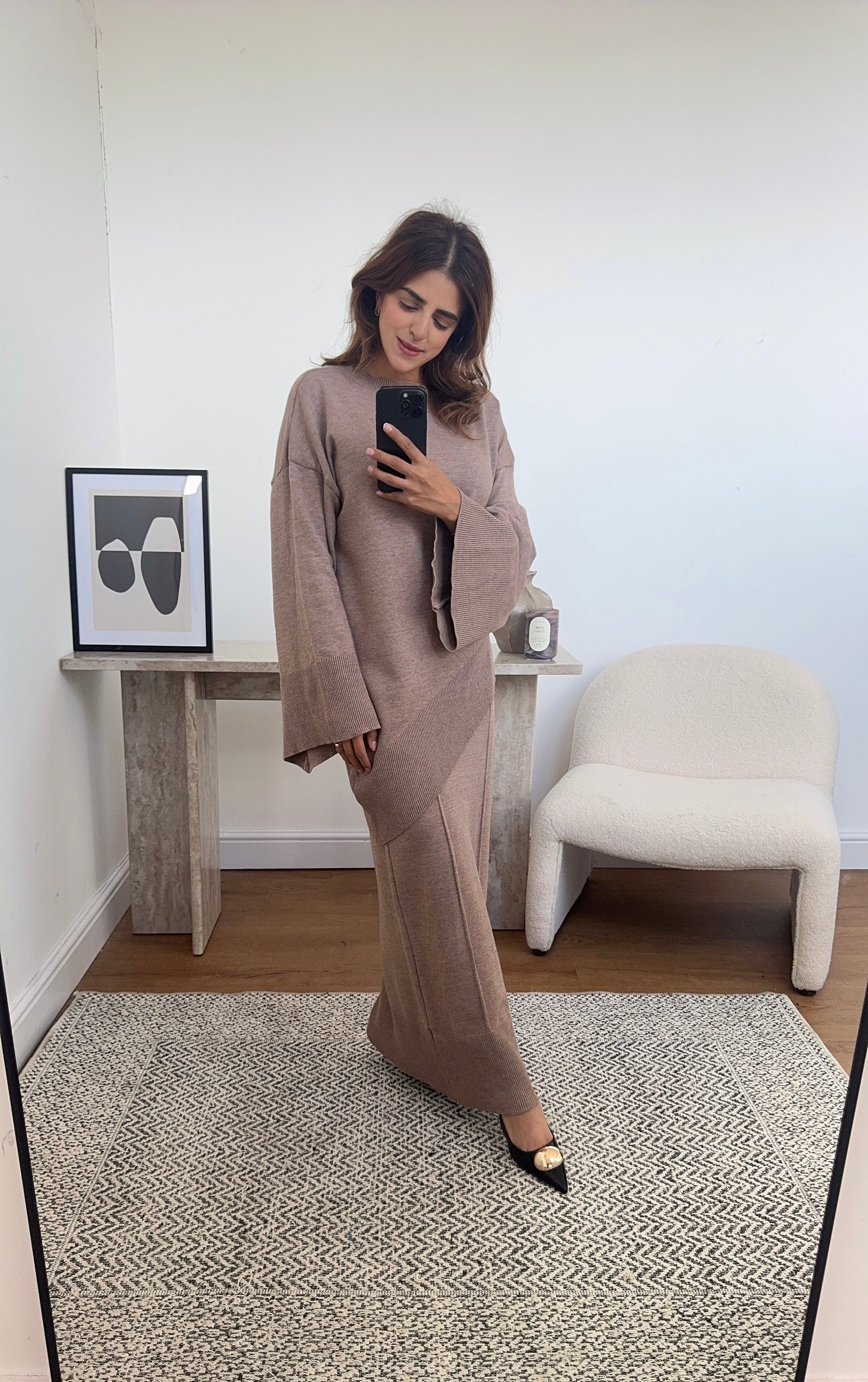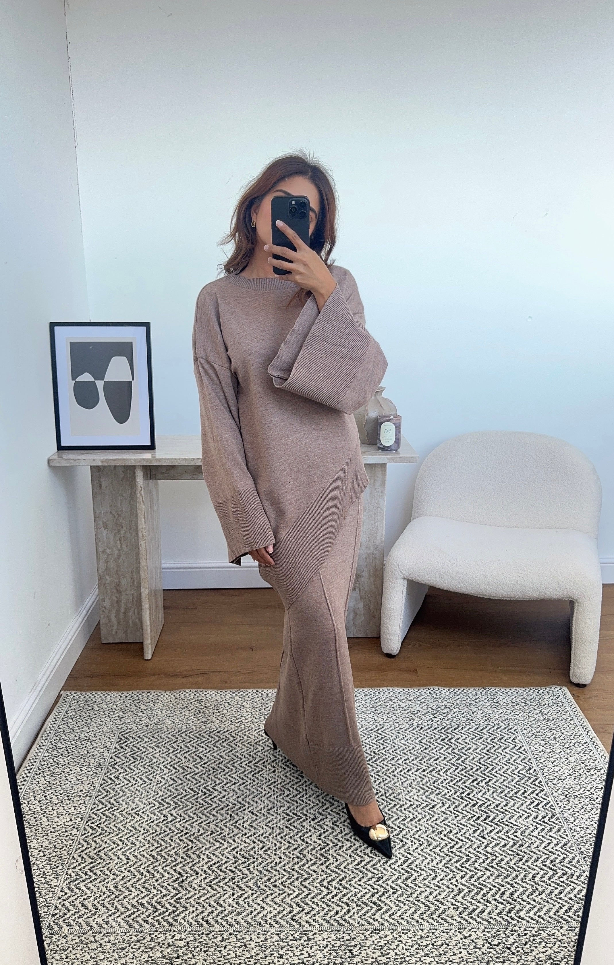 A trendy coord featuring a round neck asymmetric jumper & skirt with elasticated waist, creating a modern and chic ensemble that effortlessly blends comfort and fashion.