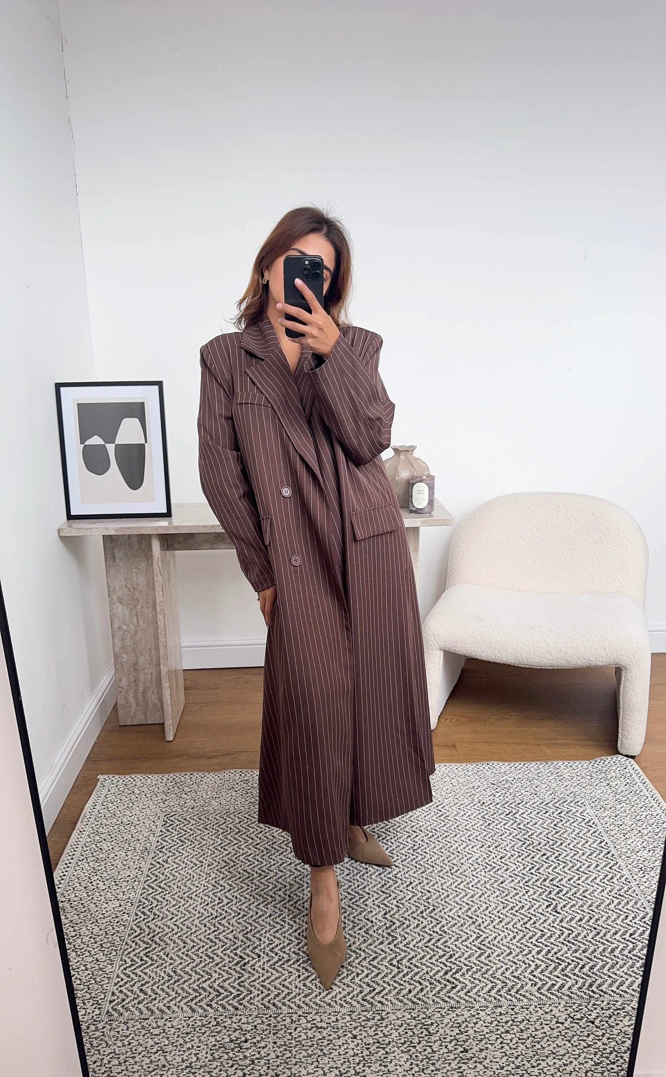 Longline blazer  with a collar and button closure, offering a sleek and effortless look.