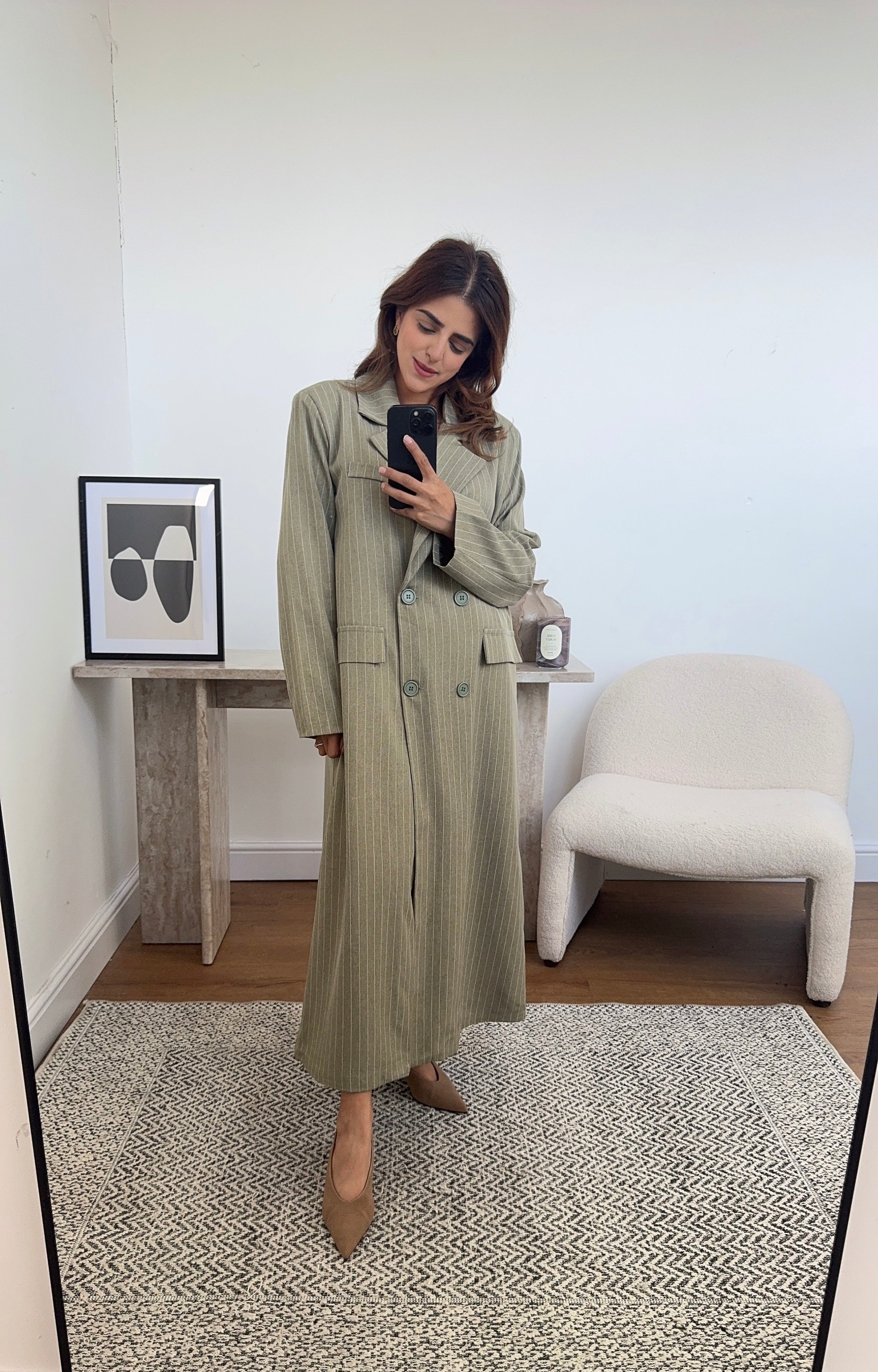 Longline blazer  with a collar and button closure, offering a sleek and effortless look.