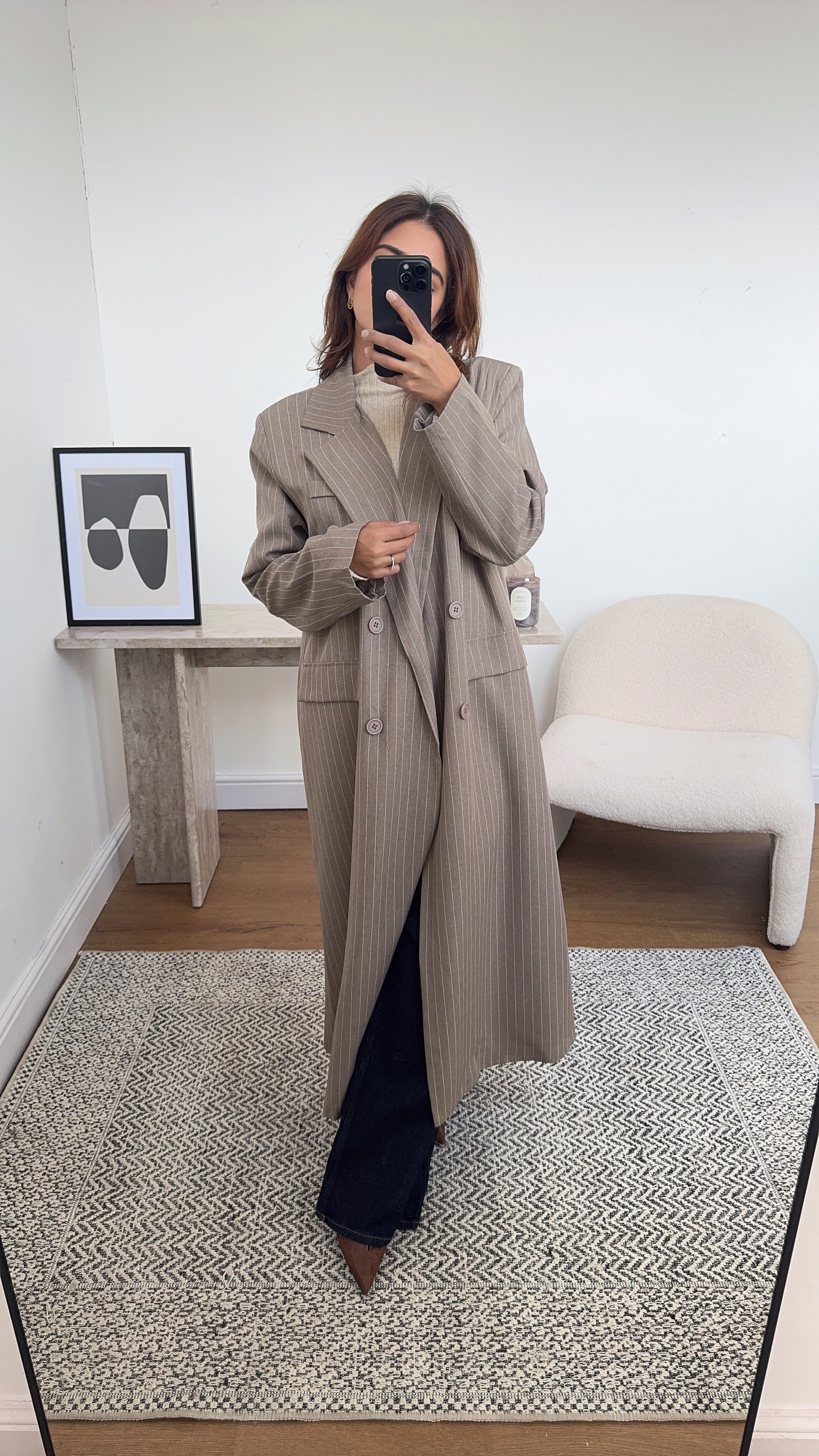 Longline blazer  with a collar and button closure, offering a sleek and effortless look.