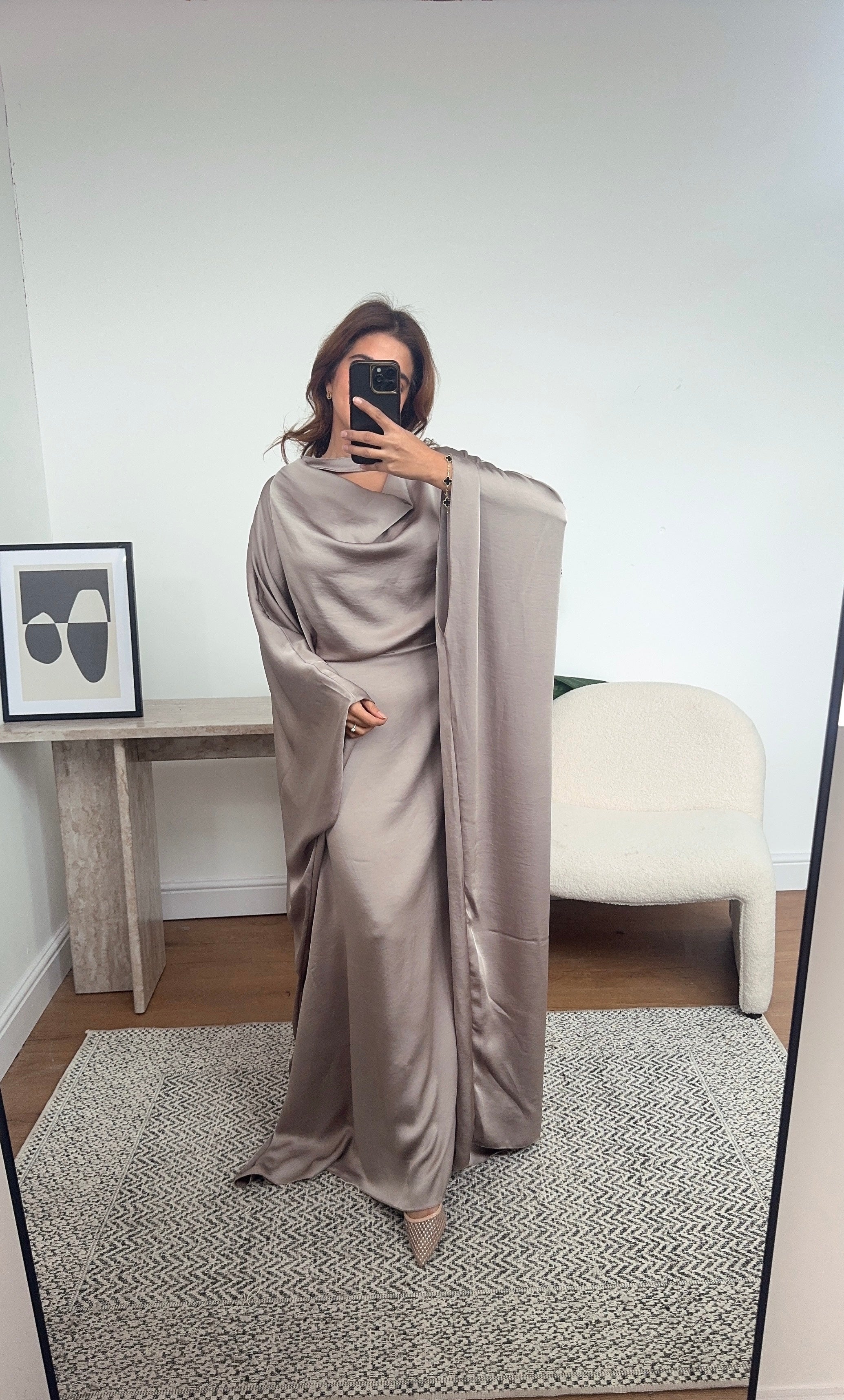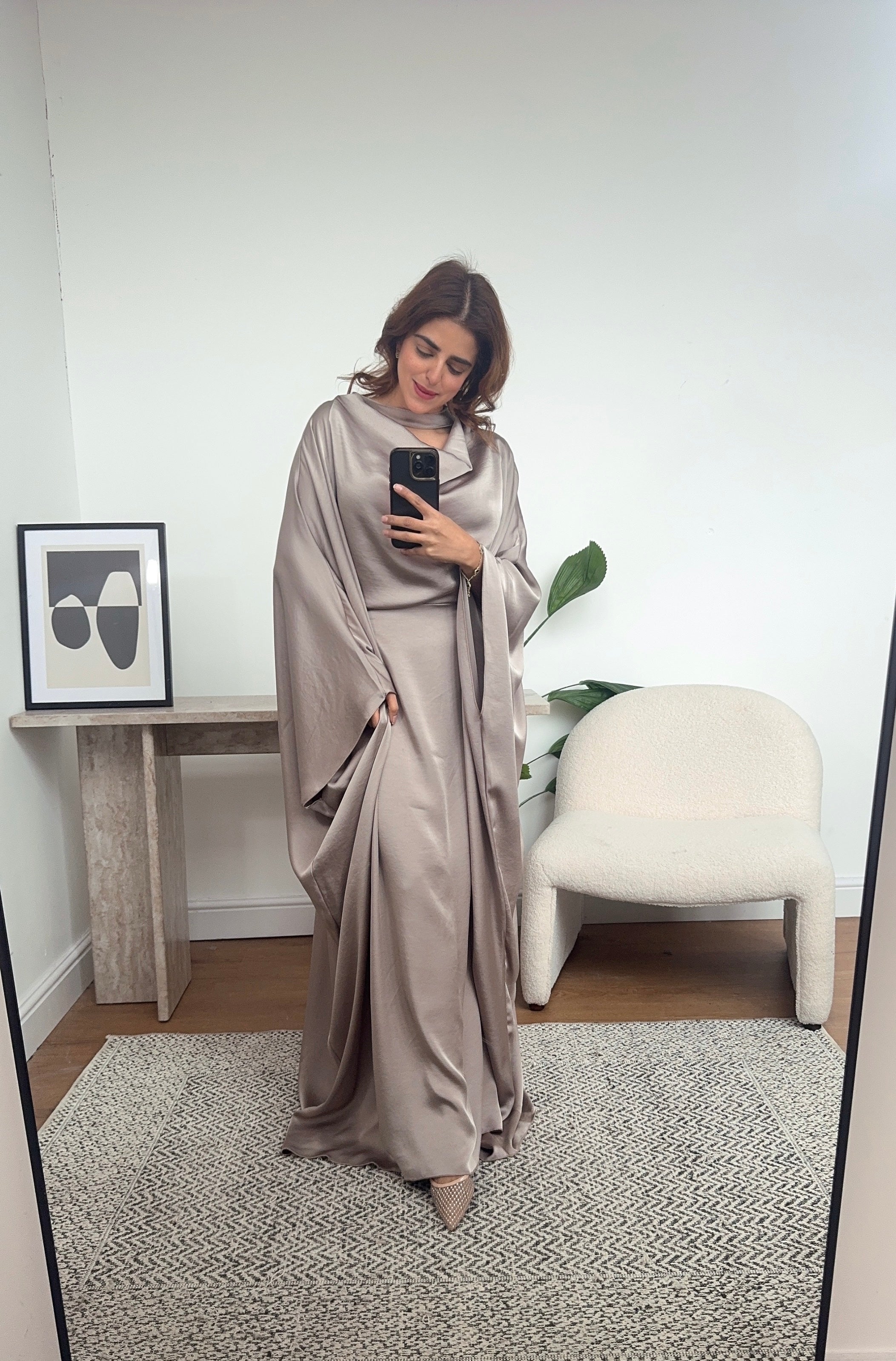 Beautiful long dress with a cowl neck and chocker detail. Inner tie belt for fitting.