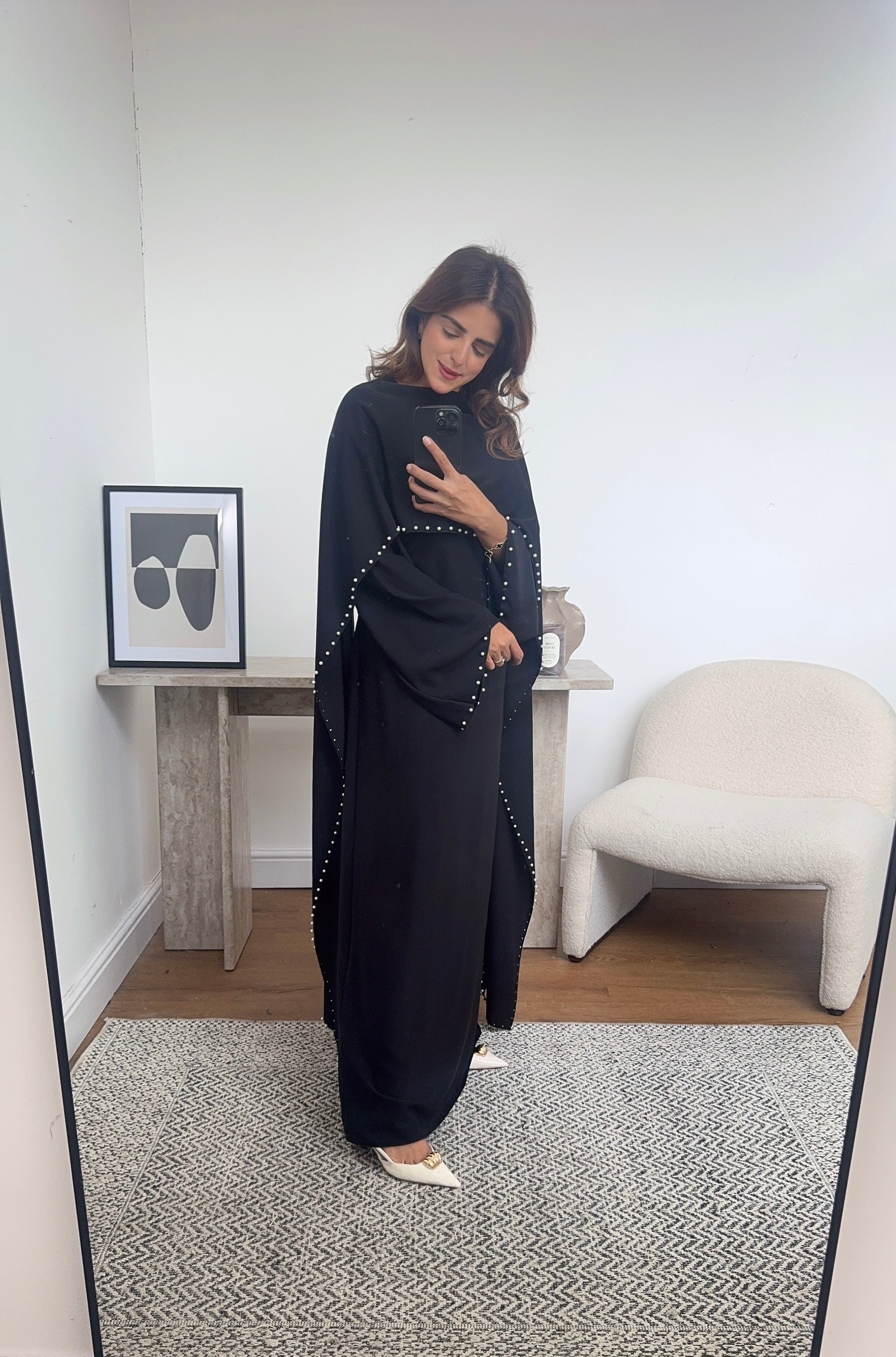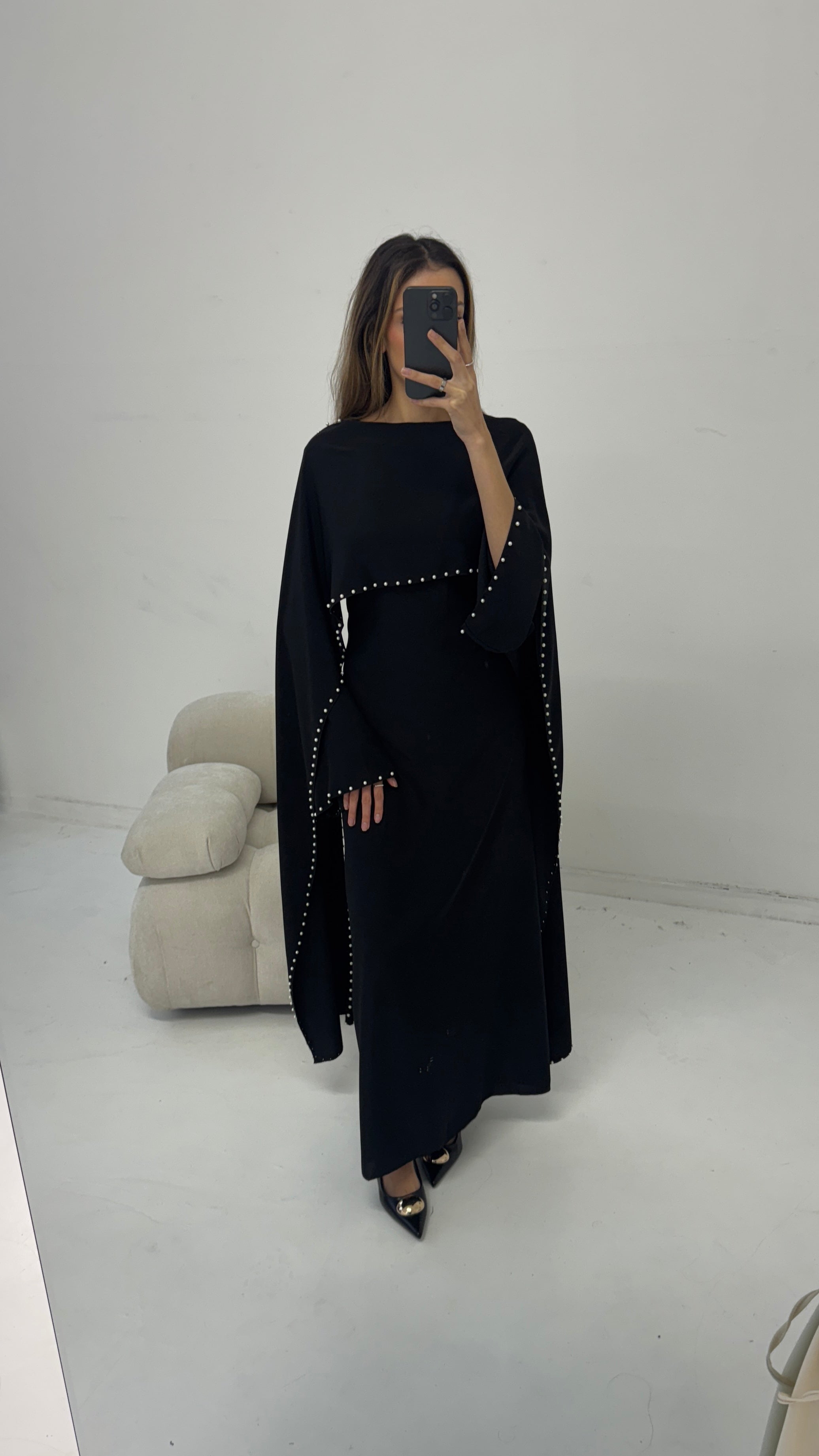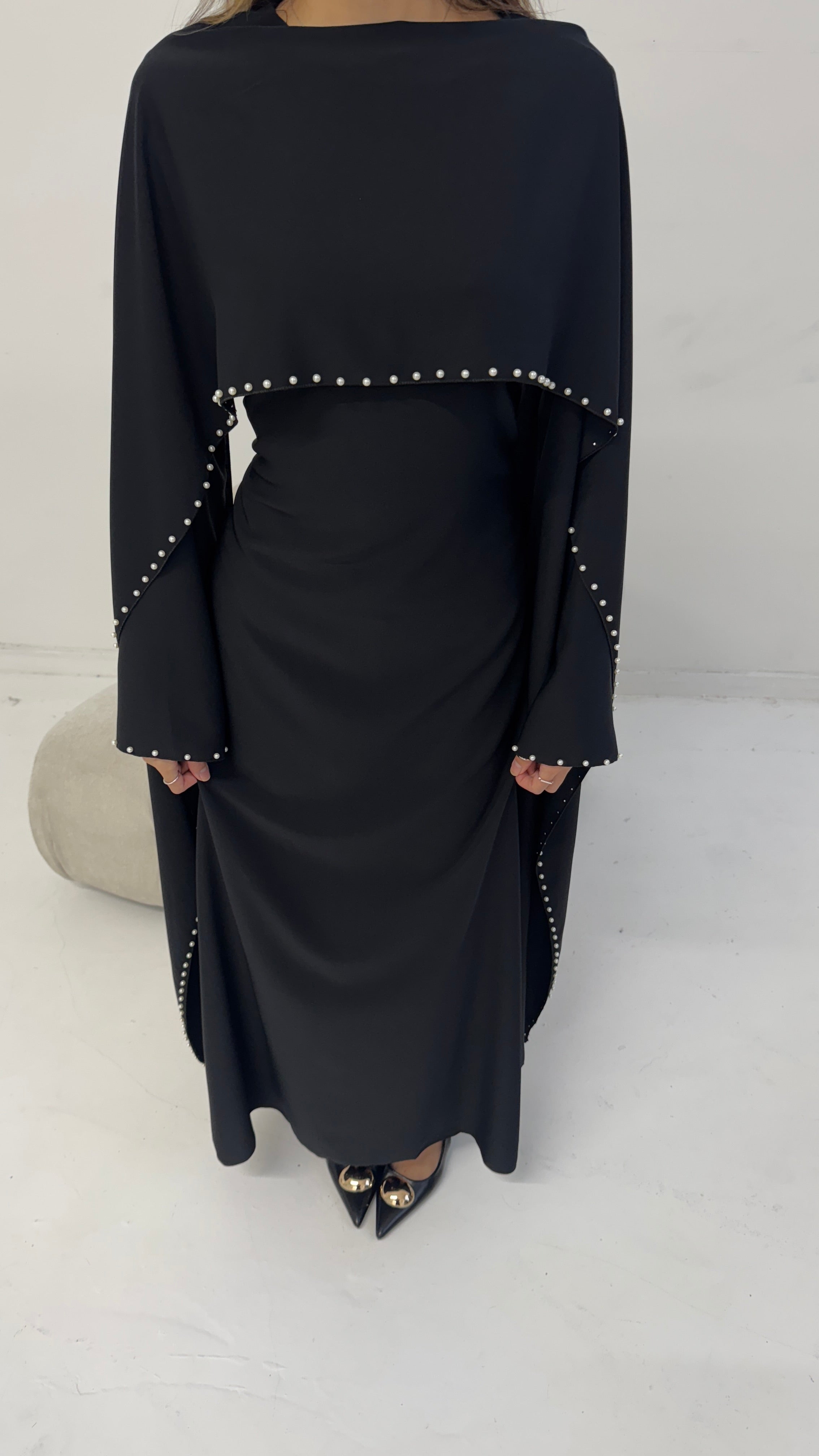 Beautiful long dress with pearl detailing cape attached. Back belt for extra fitting.