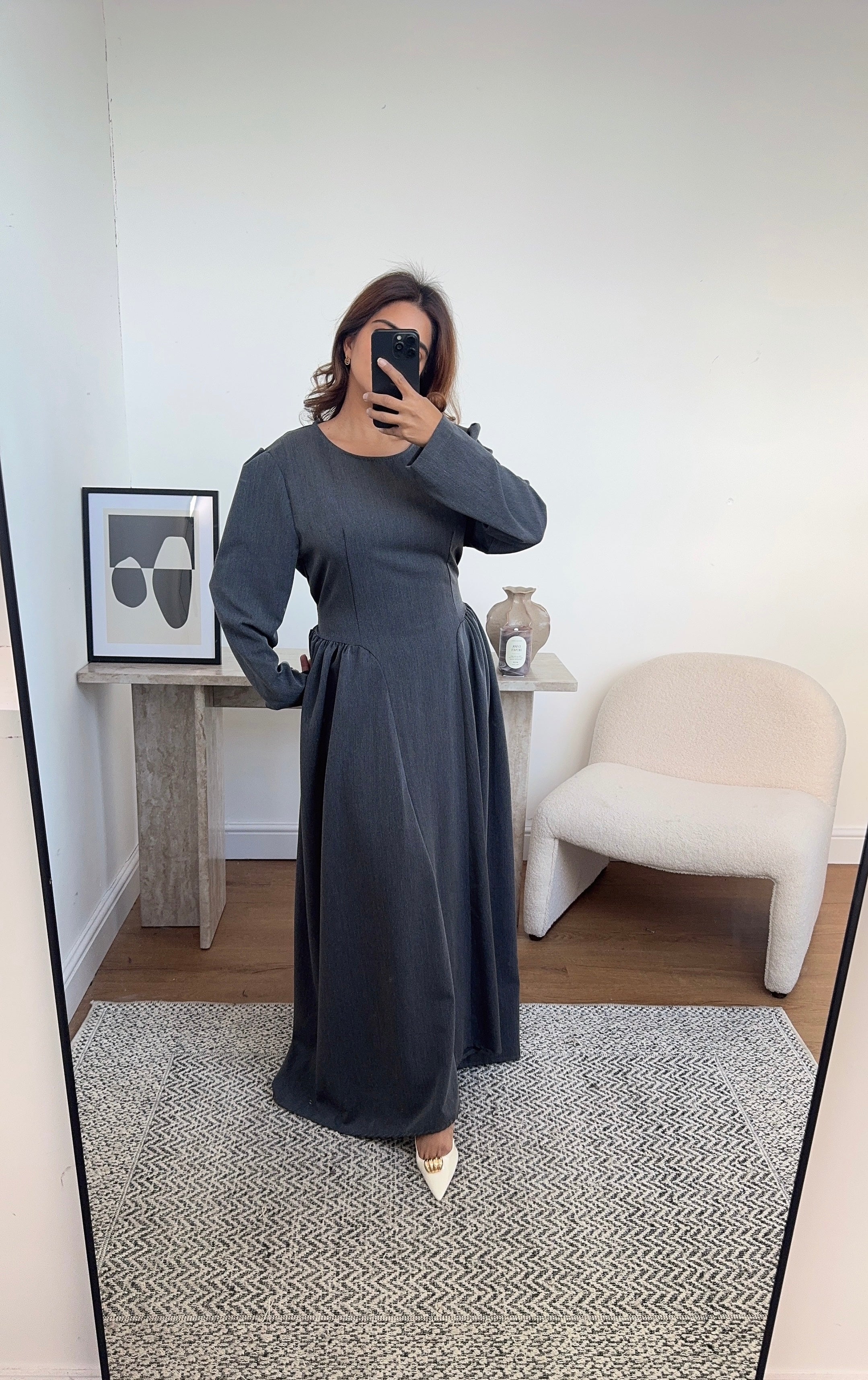 Chic taupe maxi dress with full sleeves and a softly structured silhouette. The dress has a fitted bodice and gentle pleating at the waist that creates a flowy, elegant drape. Has a belt at the back for fitting.