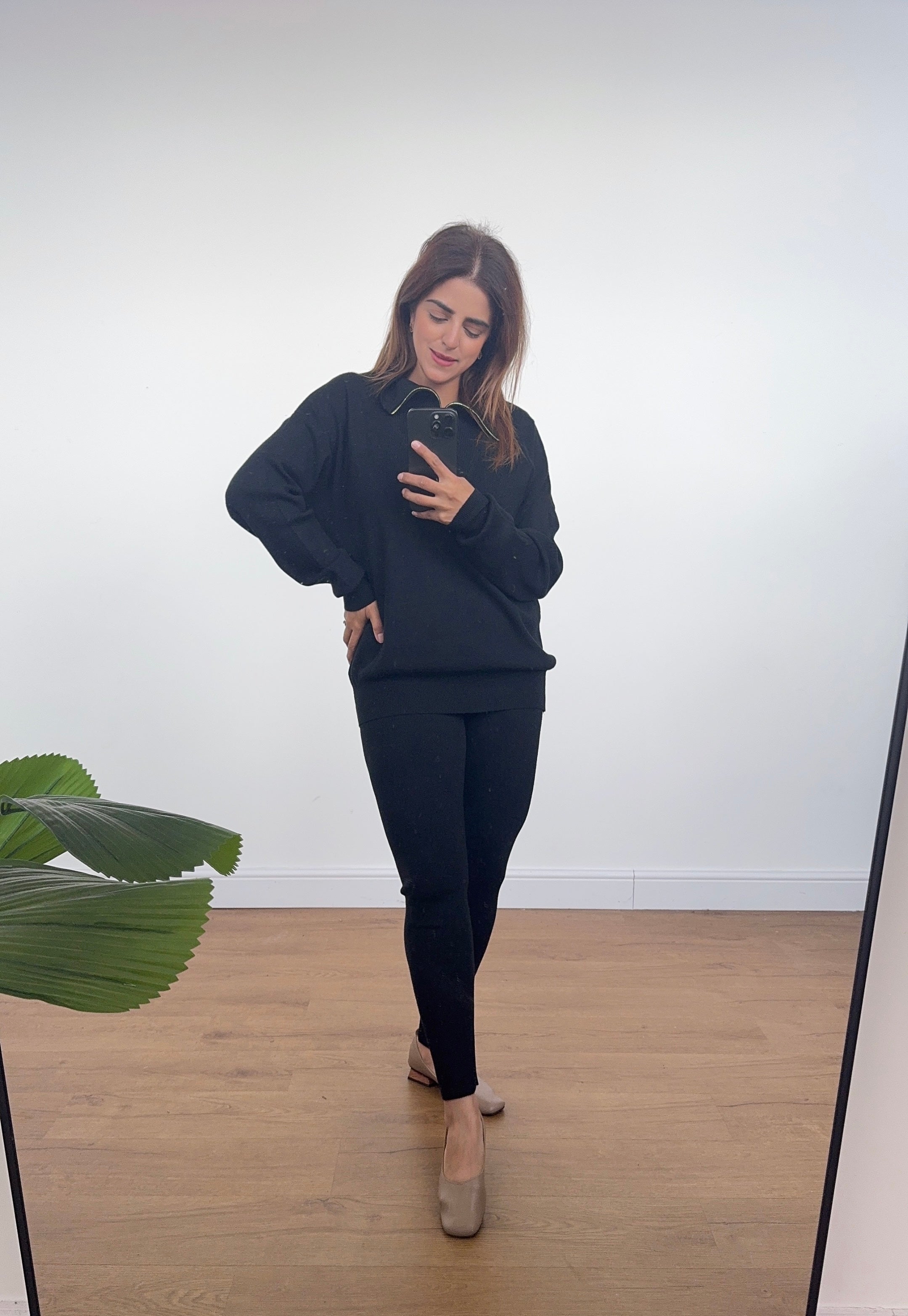 Casual loungewear outfit featuring a knitted long sleeve jumper with a zipper collar and matching knit leggings.