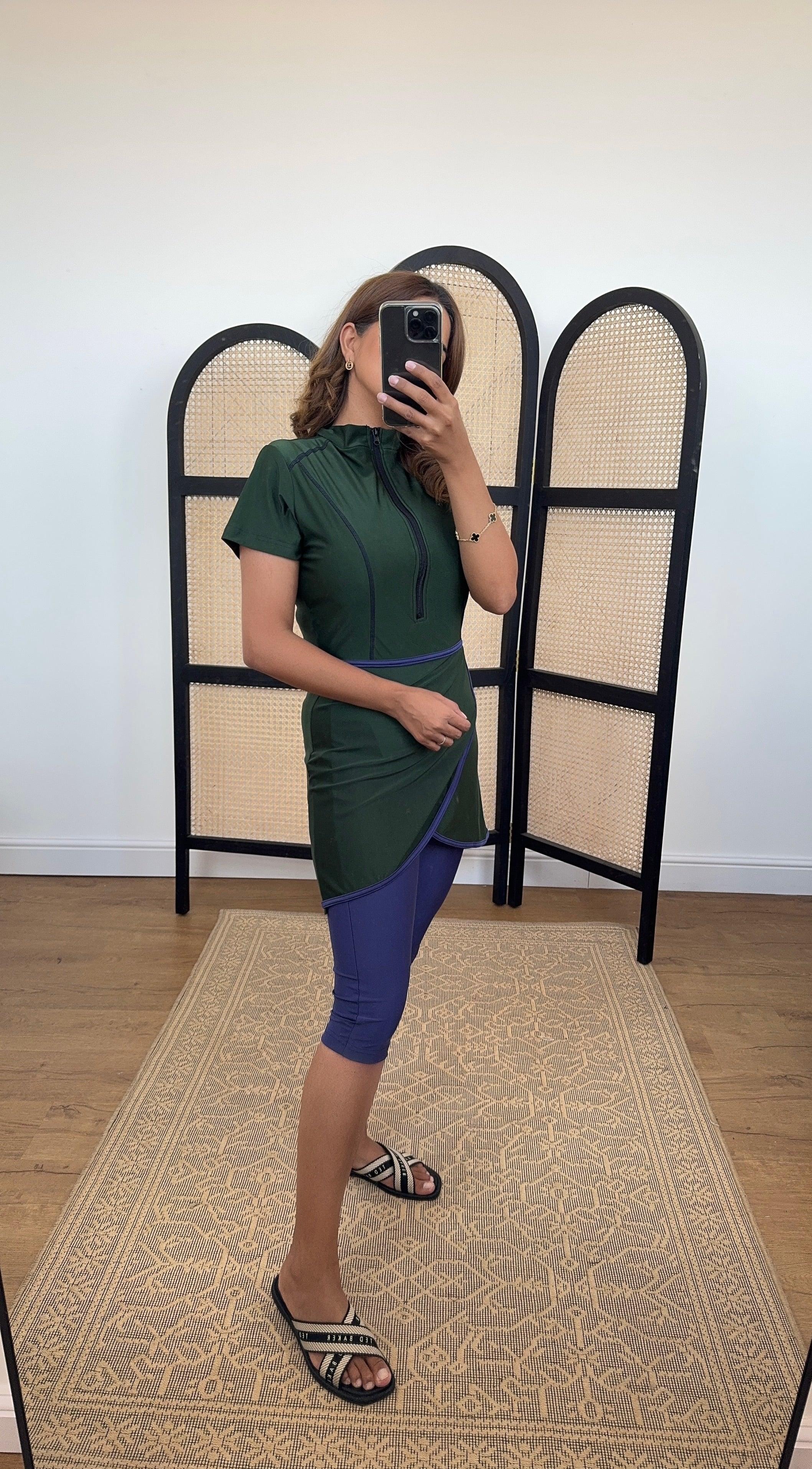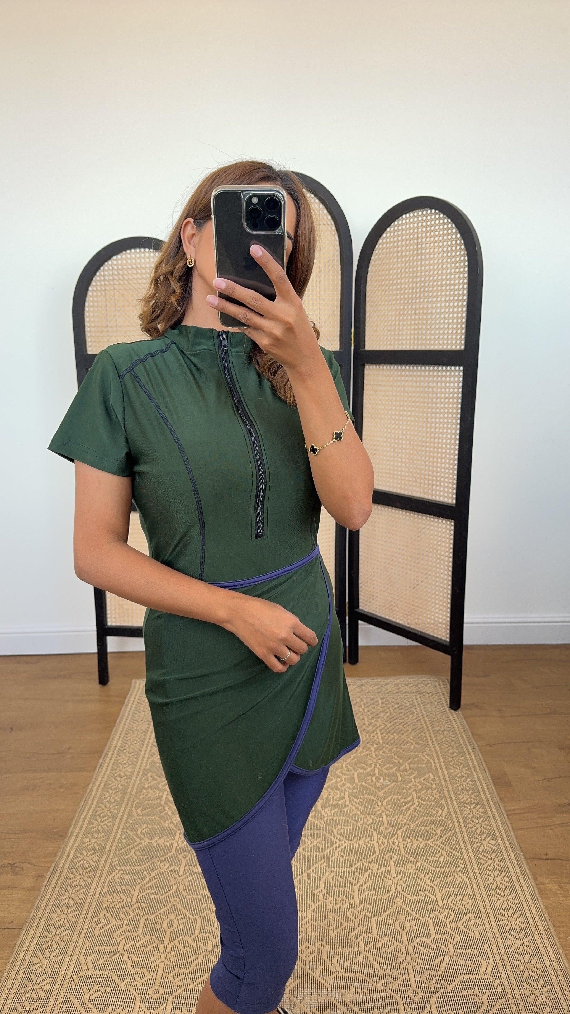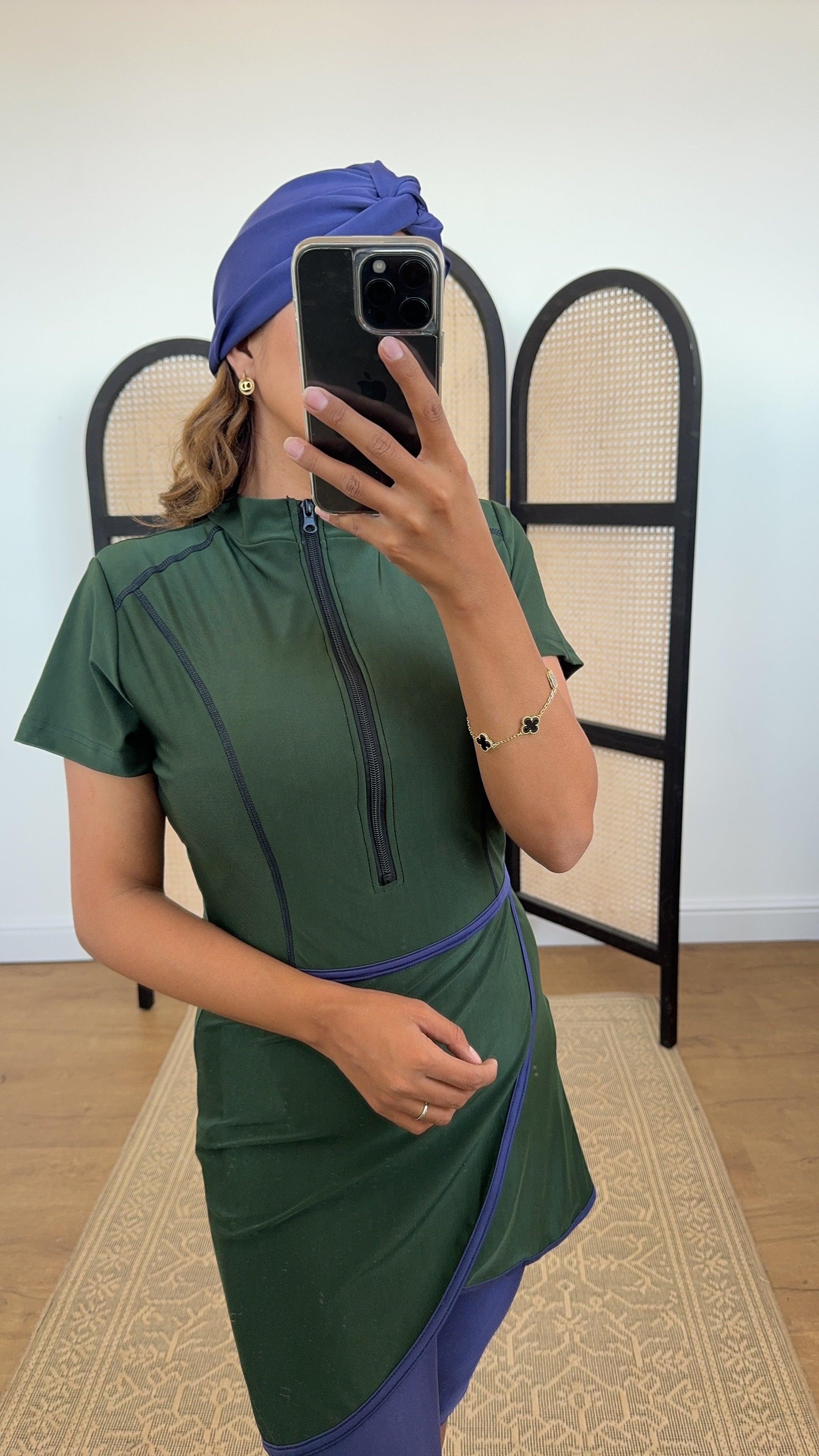 • Three-piece modest swimsuit- swim dress also has tie to the leggings for extra coverage