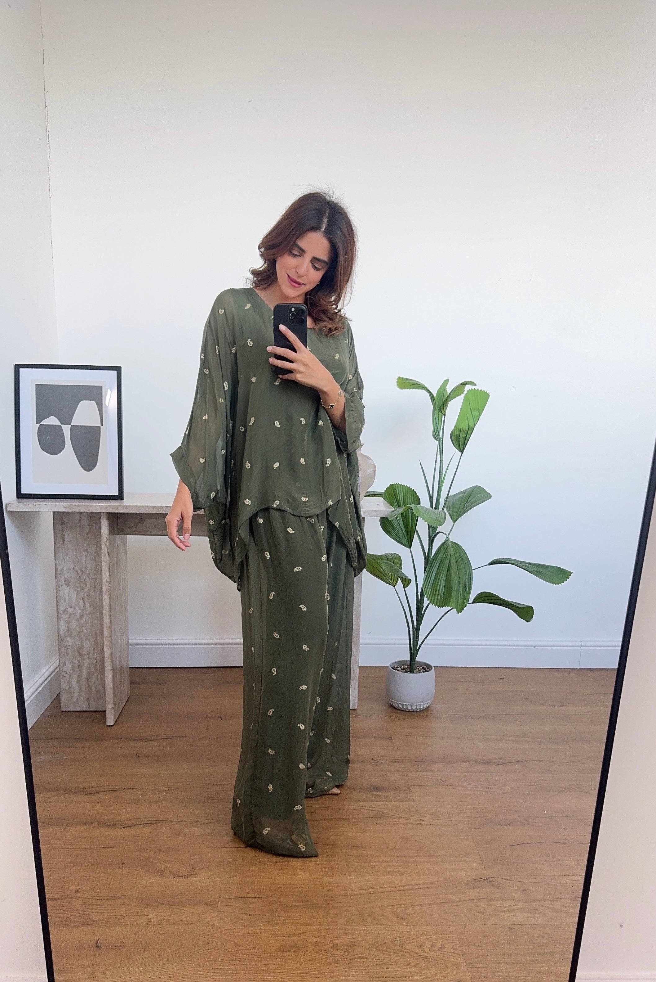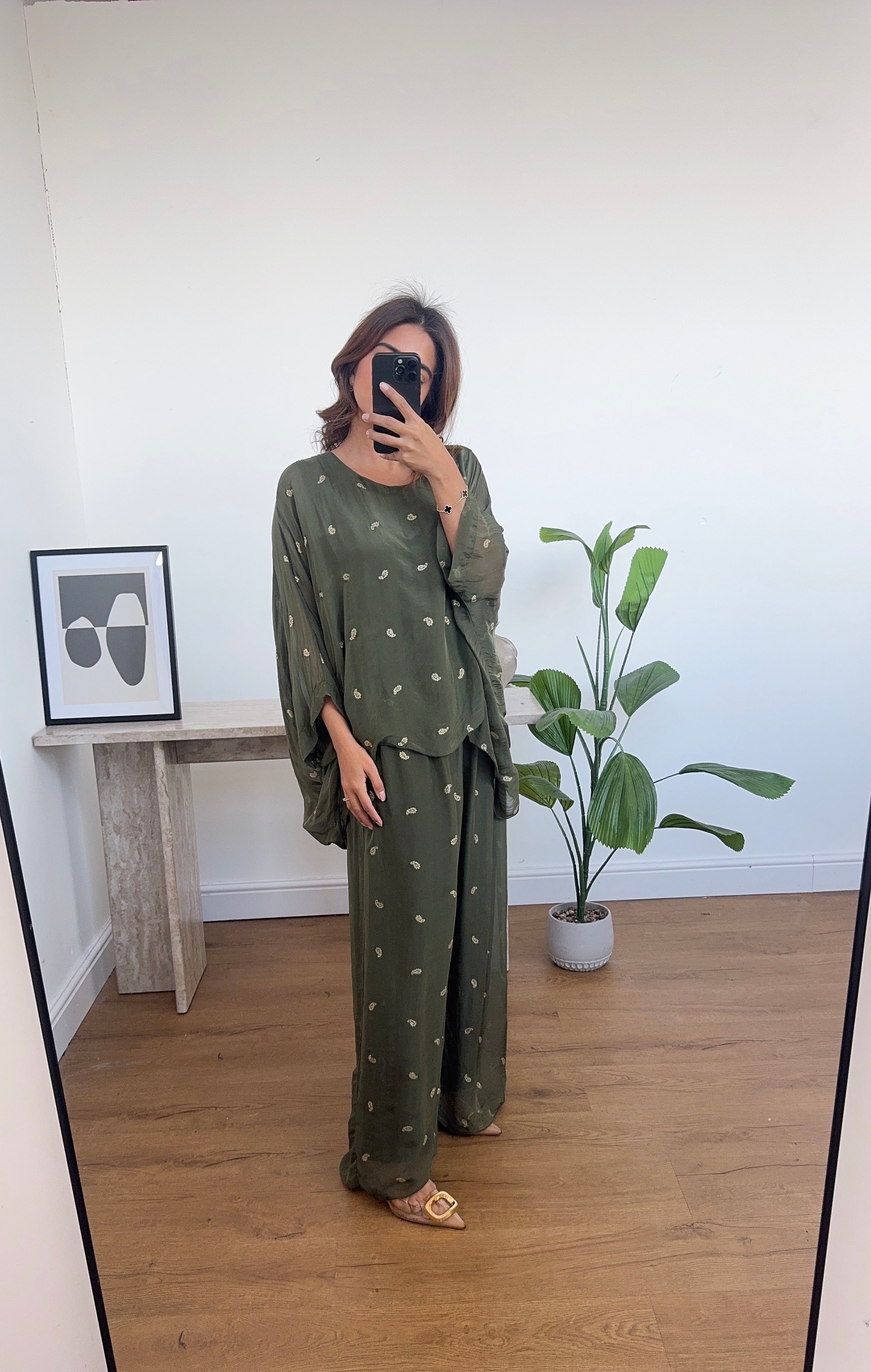 Jetting of for some winter sun? This coord is everything! Gold paisley detail top with flare sleeves and inner lining. Double layer trousers that has an elasticated waist.