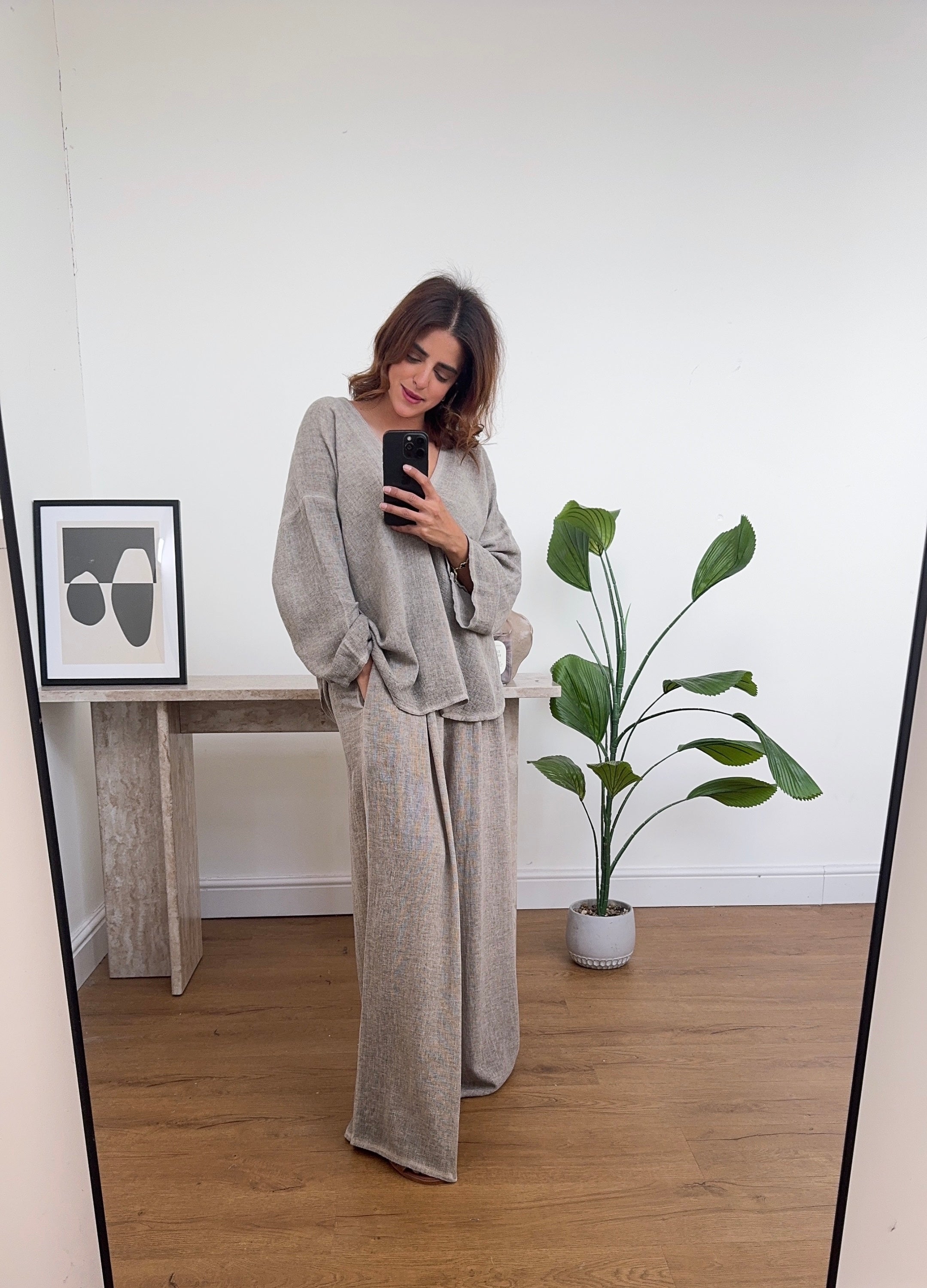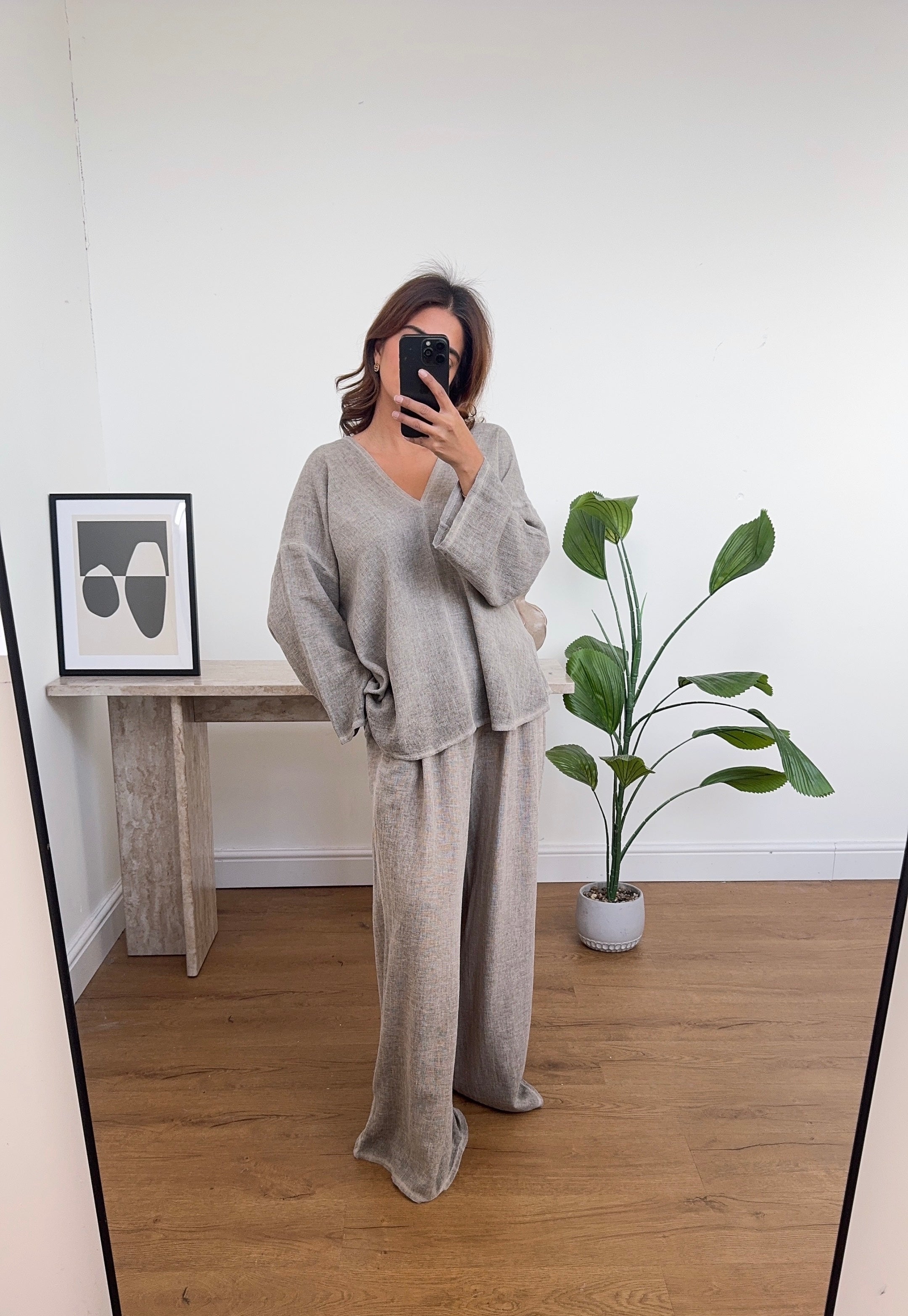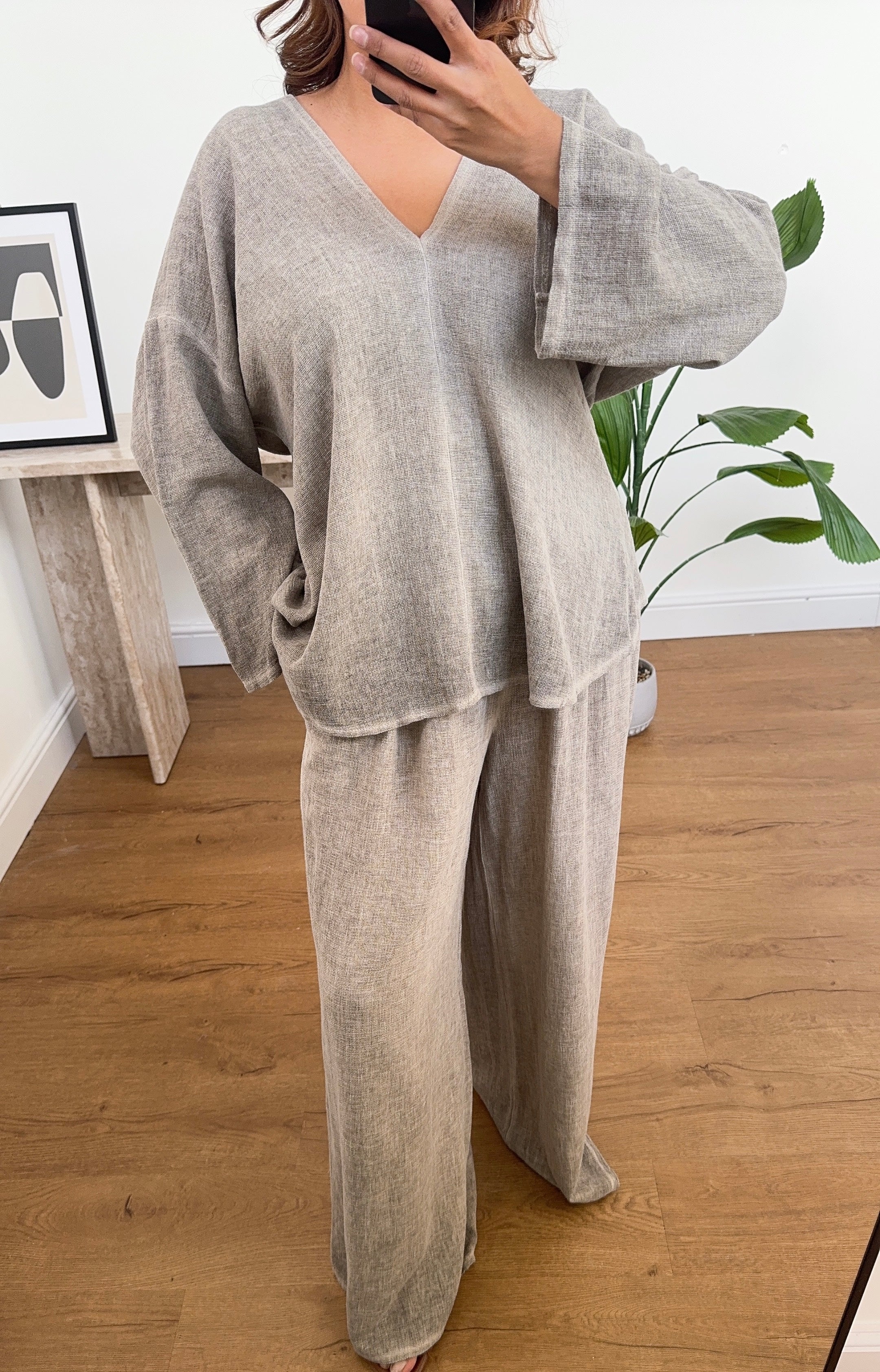 This linen and cotton mix coord is the perfect casual holiday look. The top features a longer back for extra coverage, while the lightweight fabric keeps you cool and comfortable. Paired with elasticated waist trousers, it’s a relaxed, stylish option for sunny days.