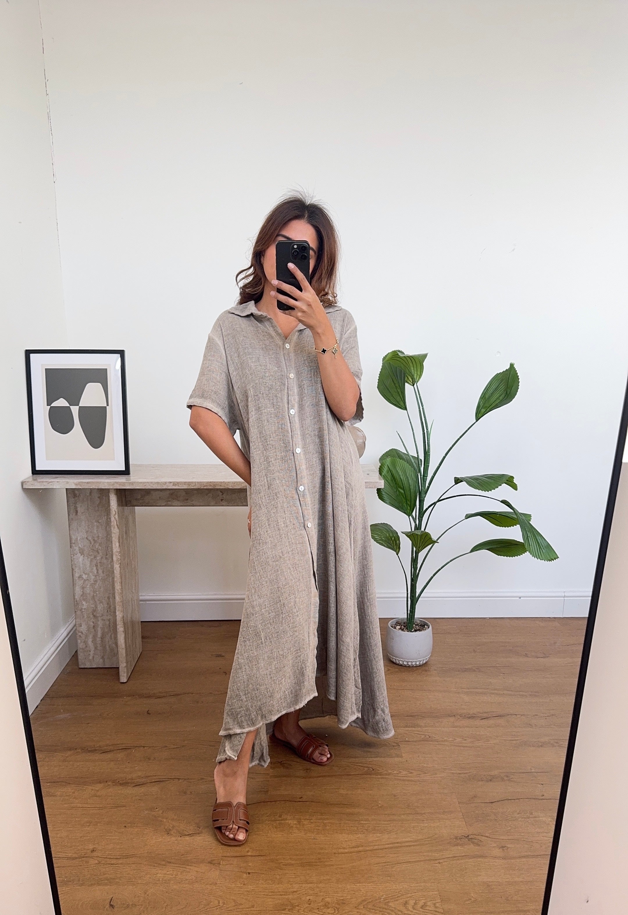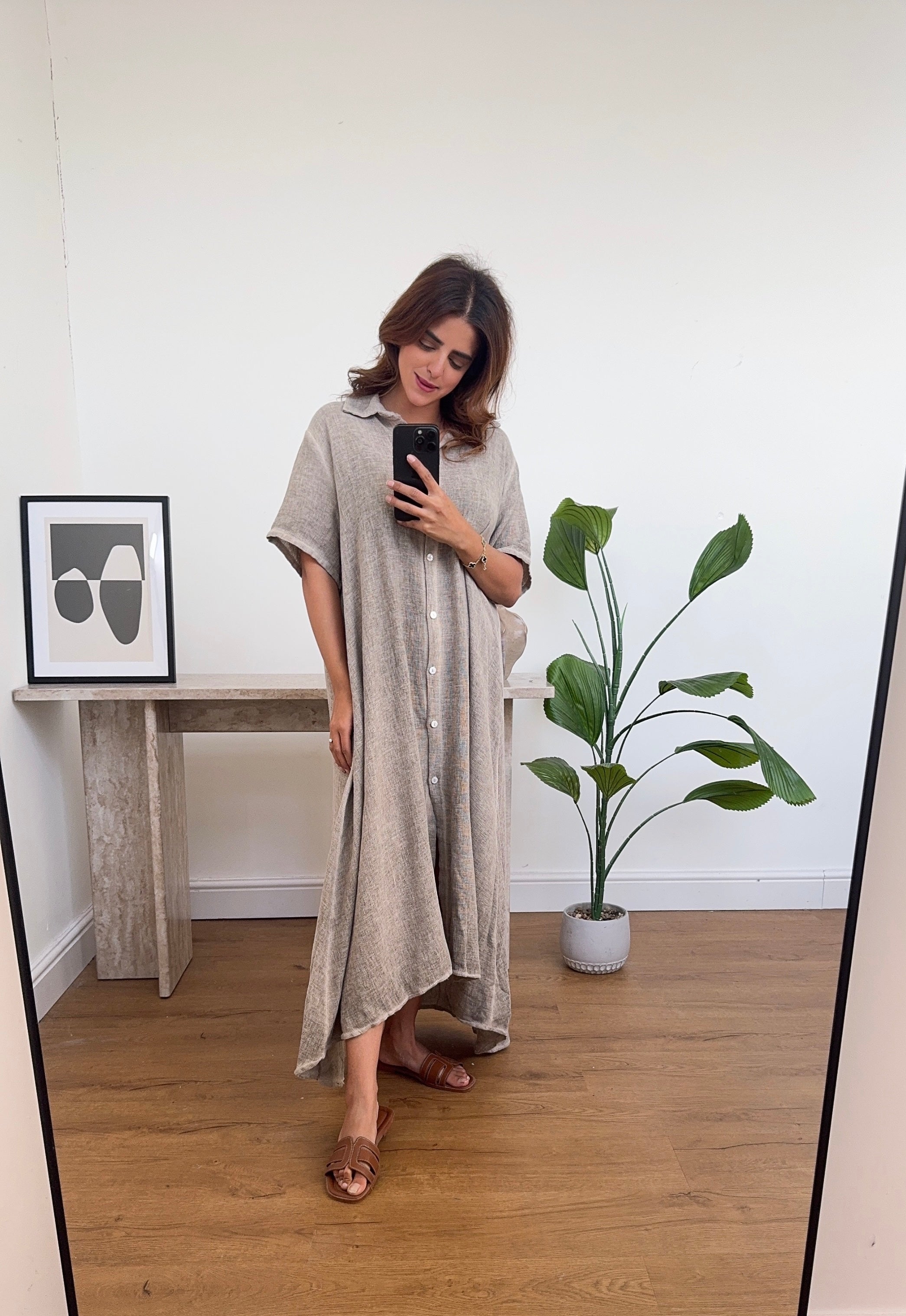 This linen and cotton mix shirt dress is the perfect casual holiday look. Super light airy and perfect for breastfeeding mamas as it has a button down front