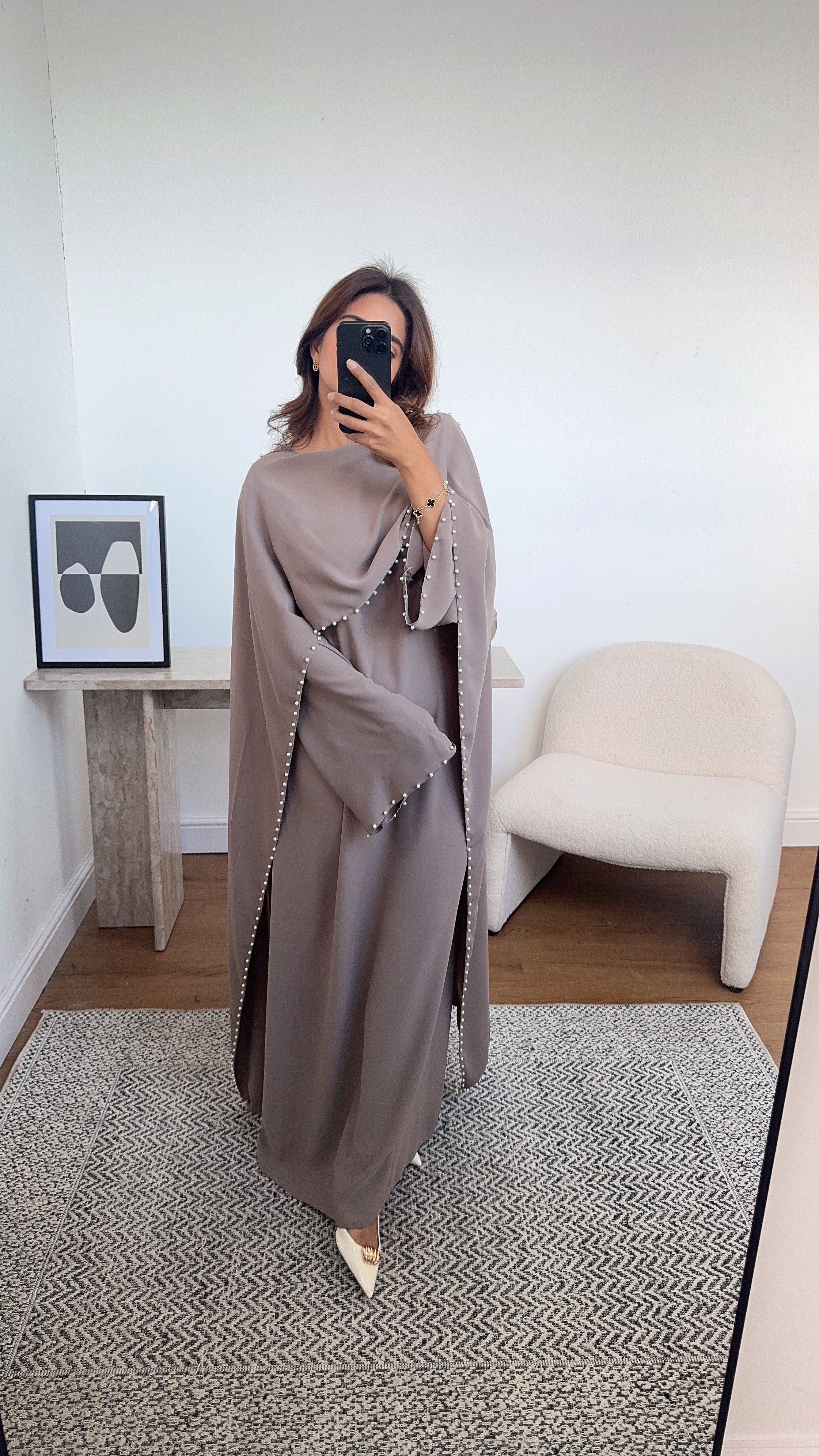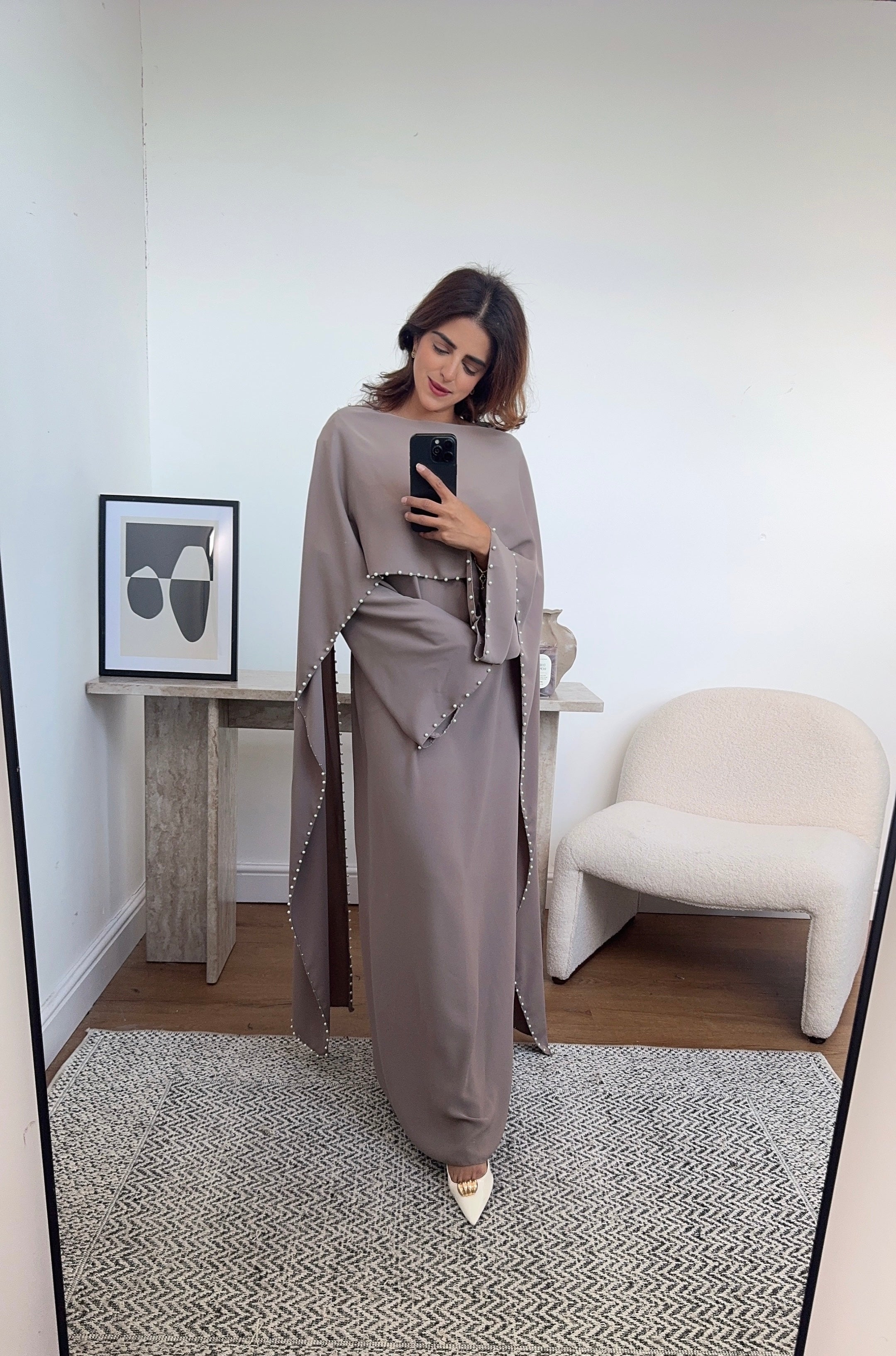 Beautiful long dress with pearl detailing cape attached. Back belt for extra fitting.