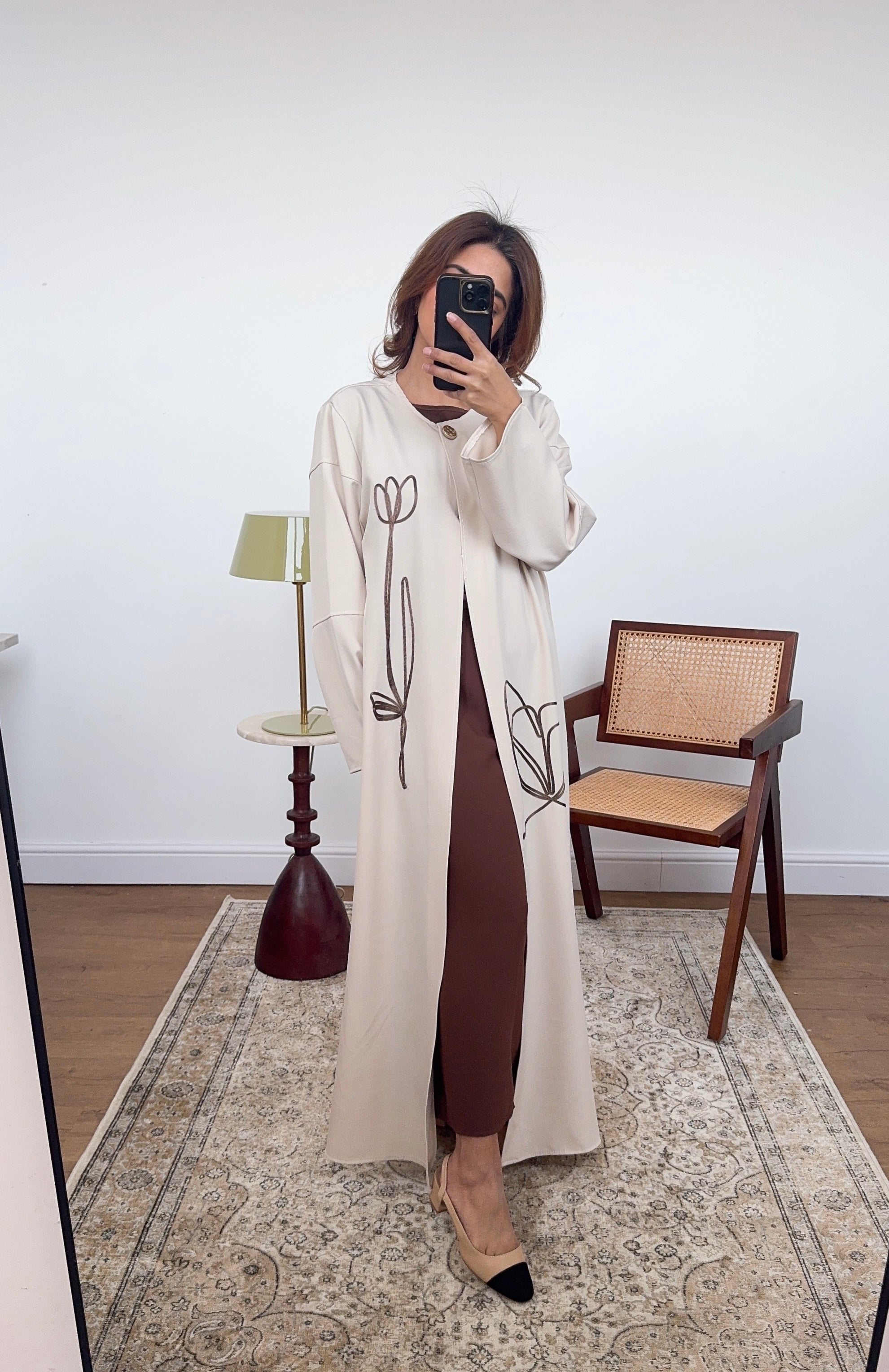 Super chic abaya with neck button, embroidered tulip detail and a belt for fitting.
