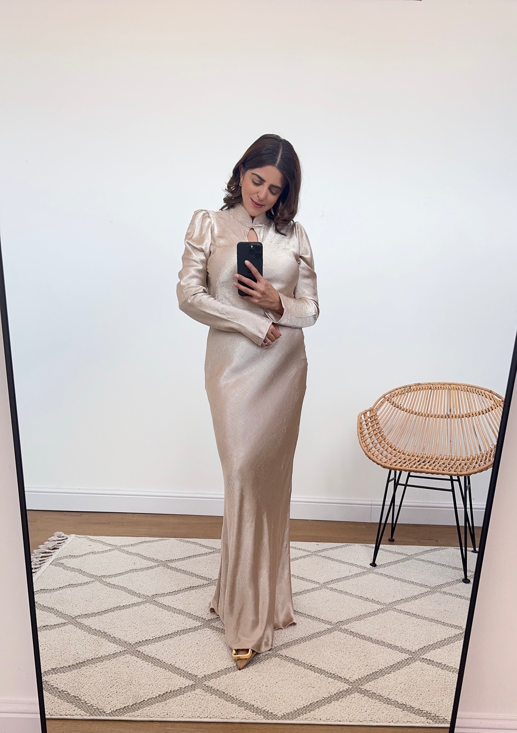 Beautiful long fishtail dress with button keyhole neck line and a back tie belt for fitting.