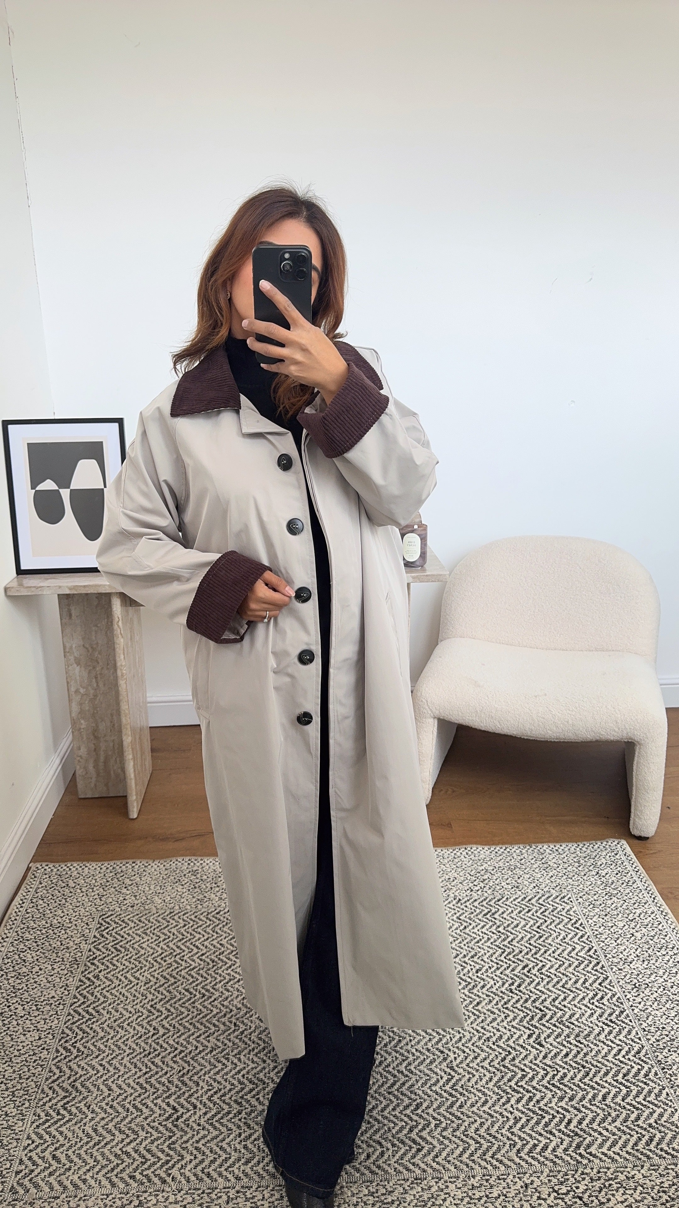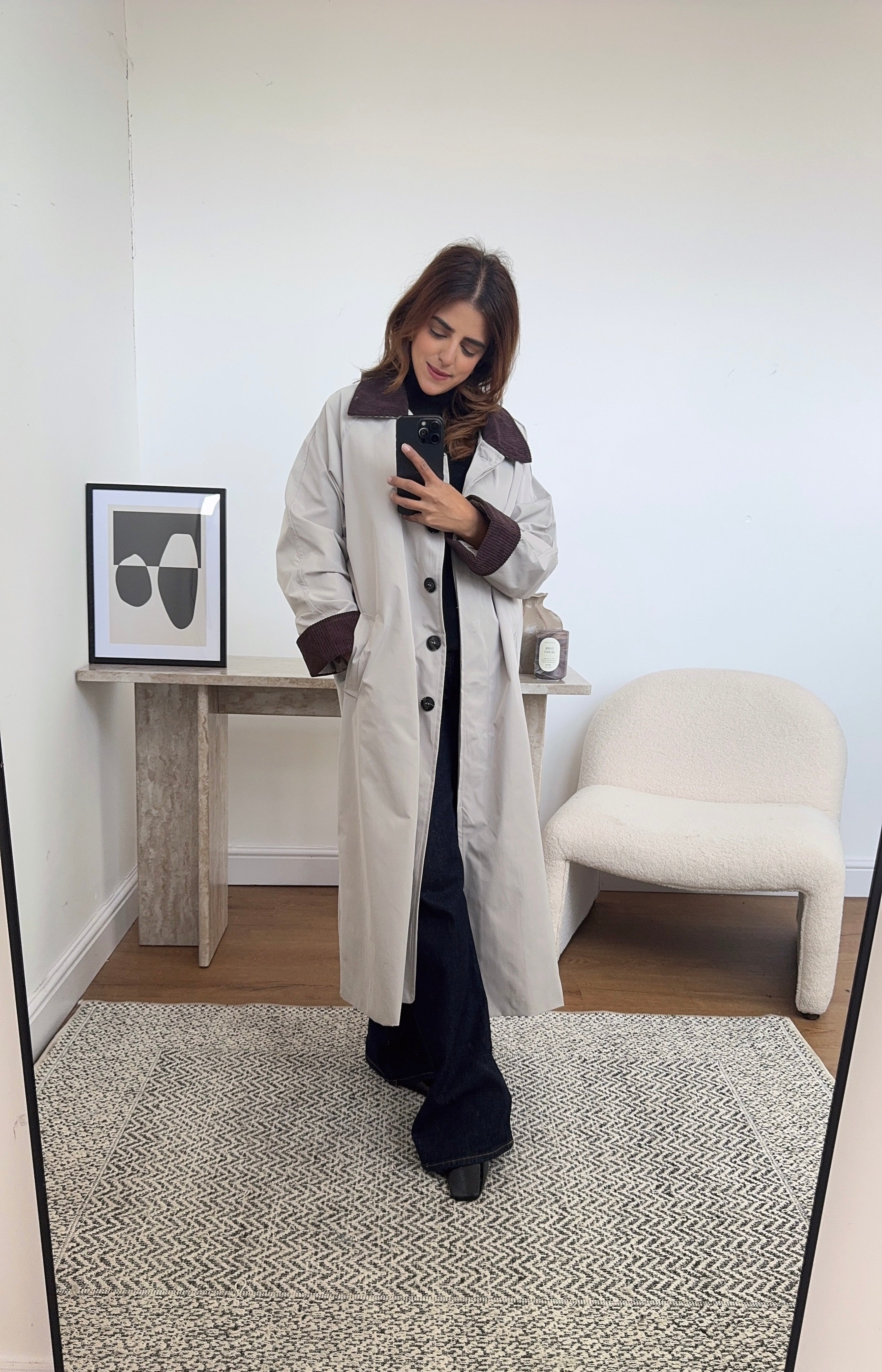 A lightweight long jacket featuring a contrasting collar and practical pockets — effortless style with functional charm.