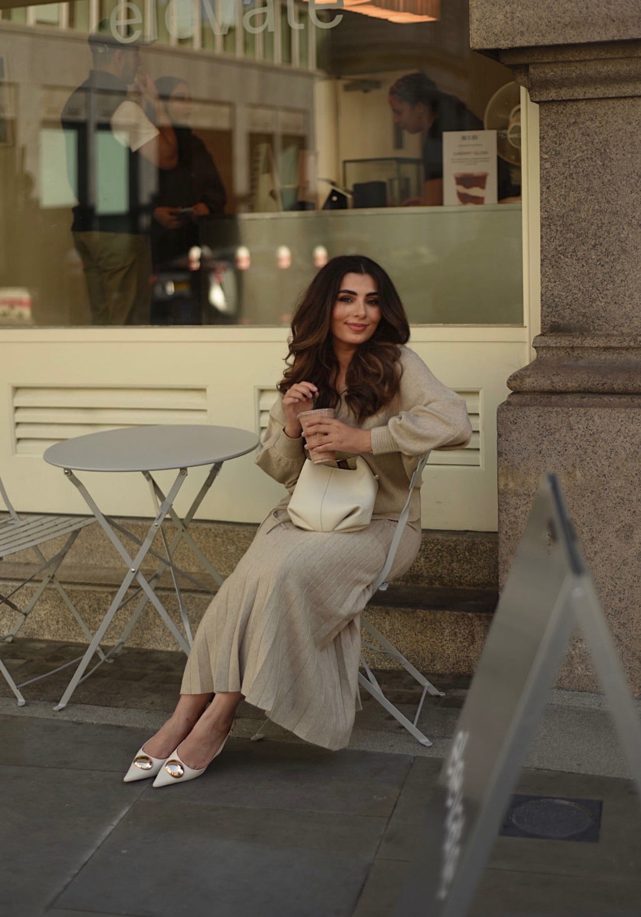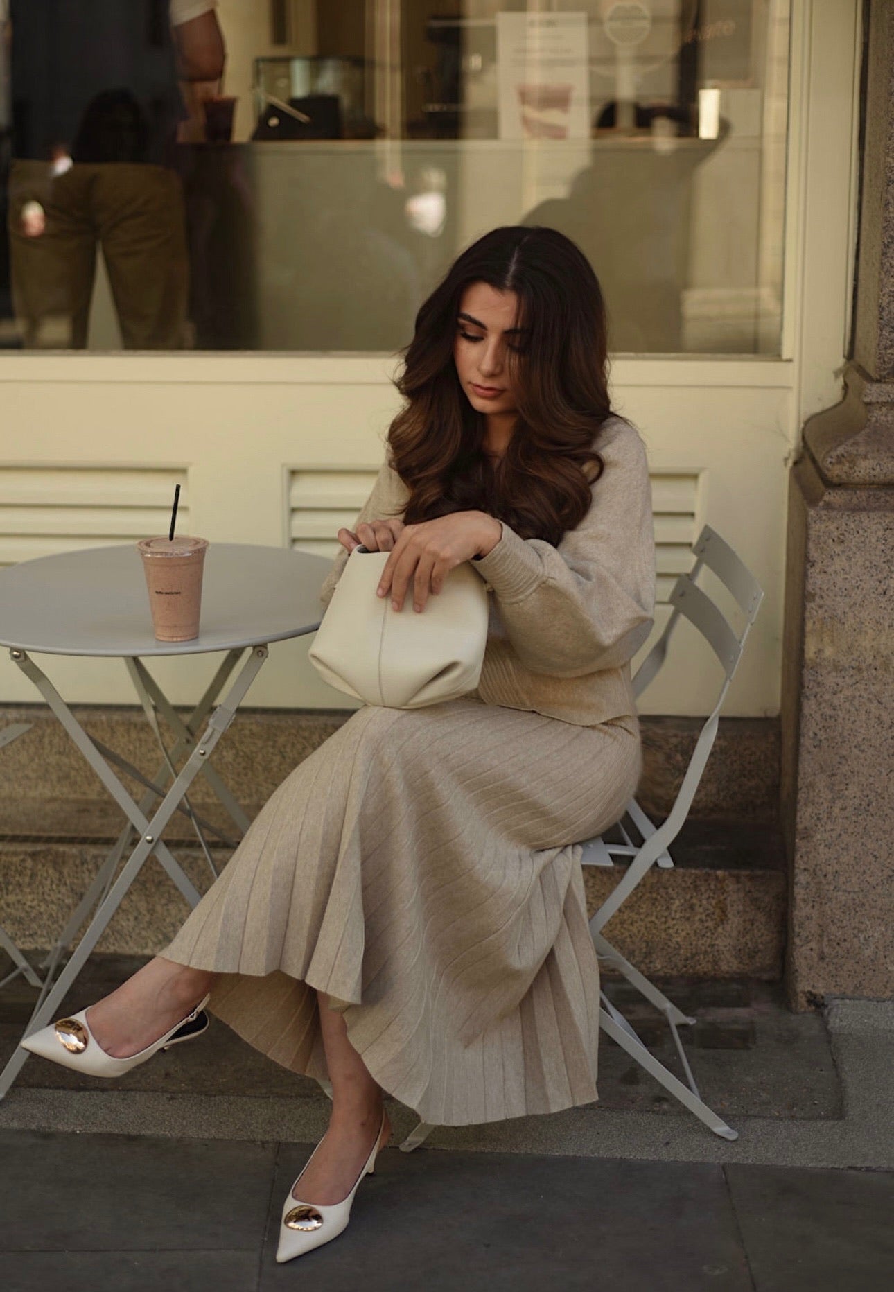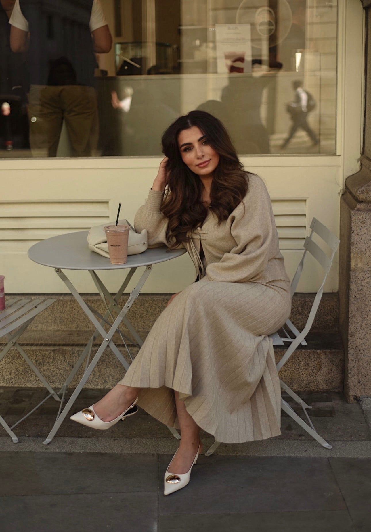 A stylish knitted co-ord with a tie-wrap short top paired with a graceful pleated skirt — chic and effortlessly coordinated.