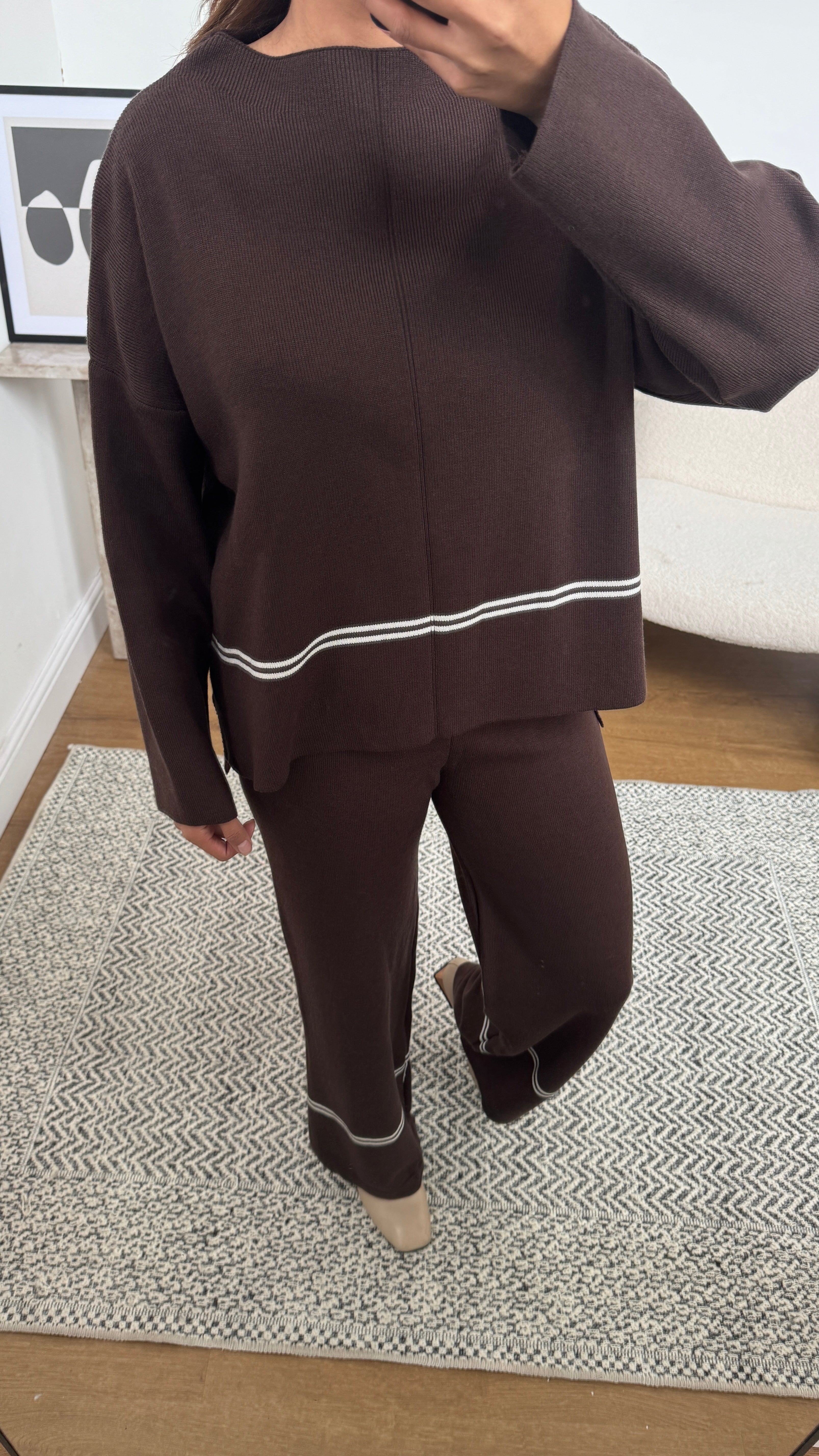 Steal the style game with this beautifully knitted coord set featuring a high low jumper and troursers with an elasticated waist.