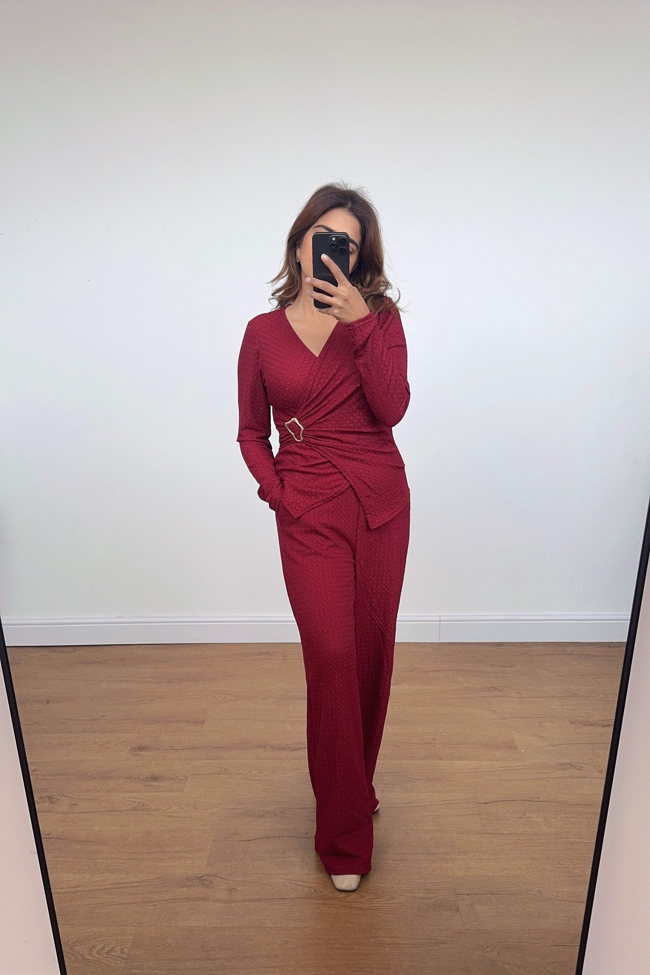 The basic coord that could take you from lounging around the house to a dinner date by the evening- featuring a long sleeve ruched wrap top with an asymmetric design. Trousers have an elasticated waist.