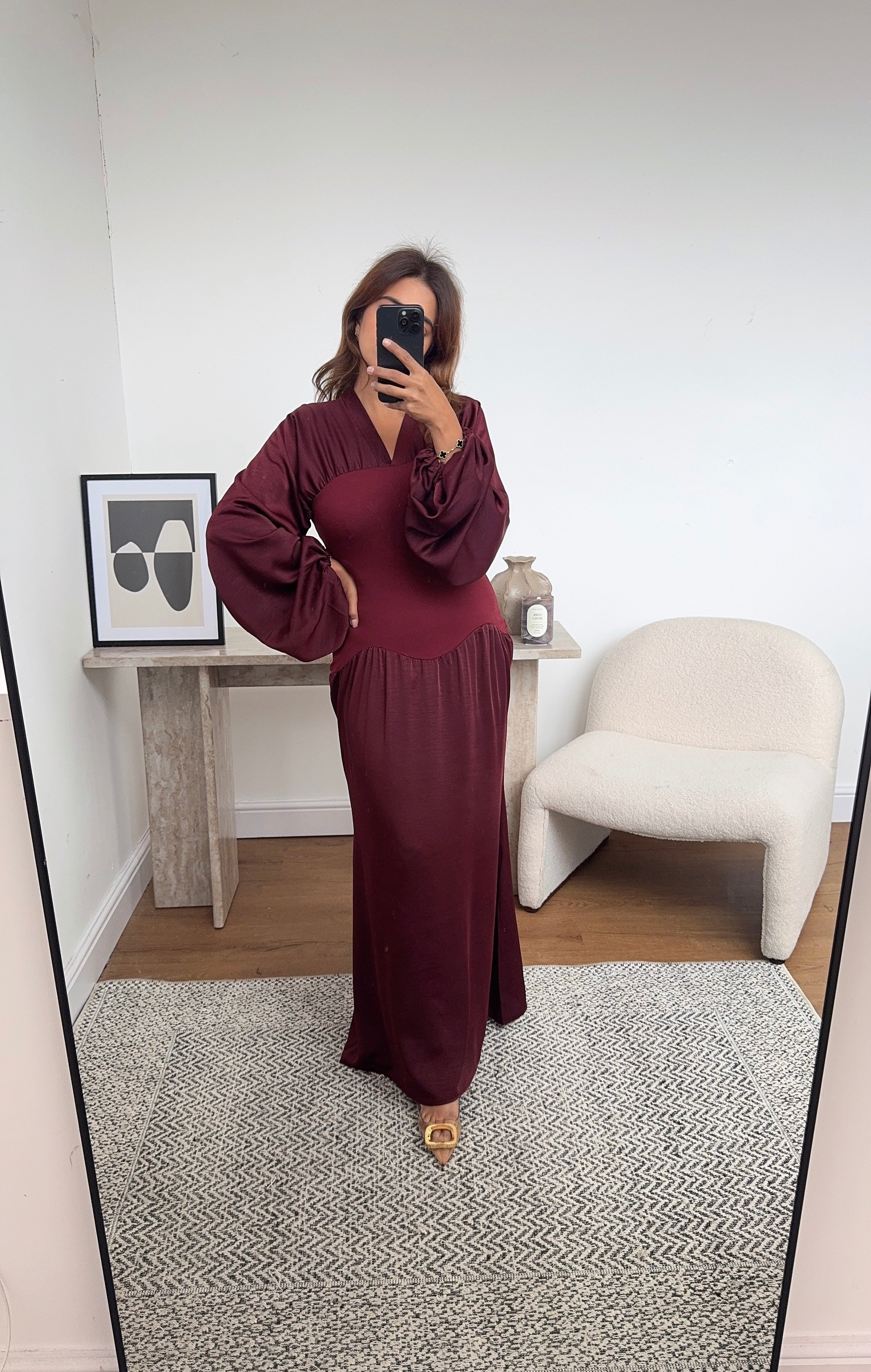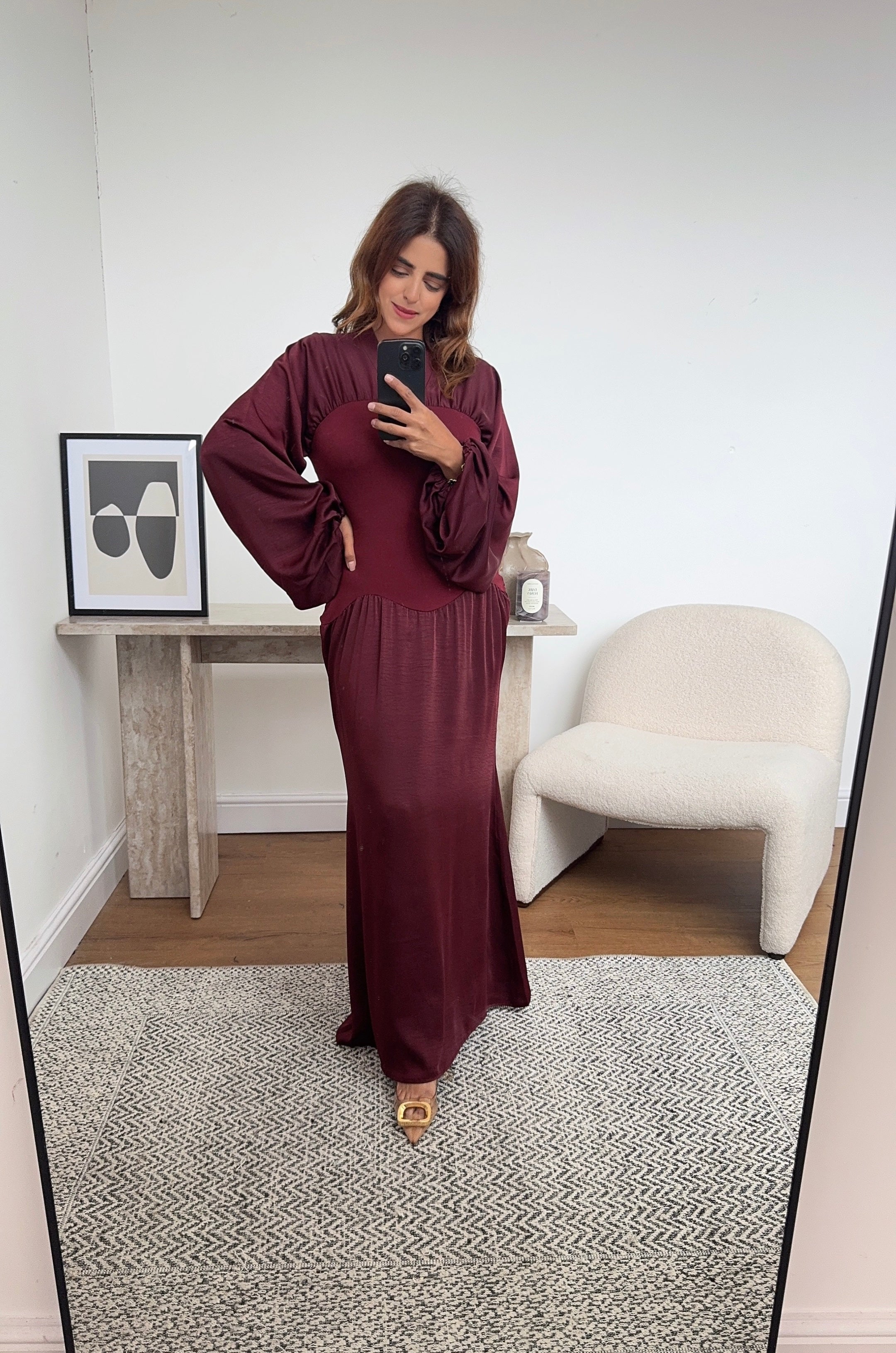 deep burgundy long-sleeve dress with a fitted bodice and flowing sleeves, creating a very elegant silhouette. The fabric has a slight sheen, giving it a sophisticated, evening-appropriate touch.