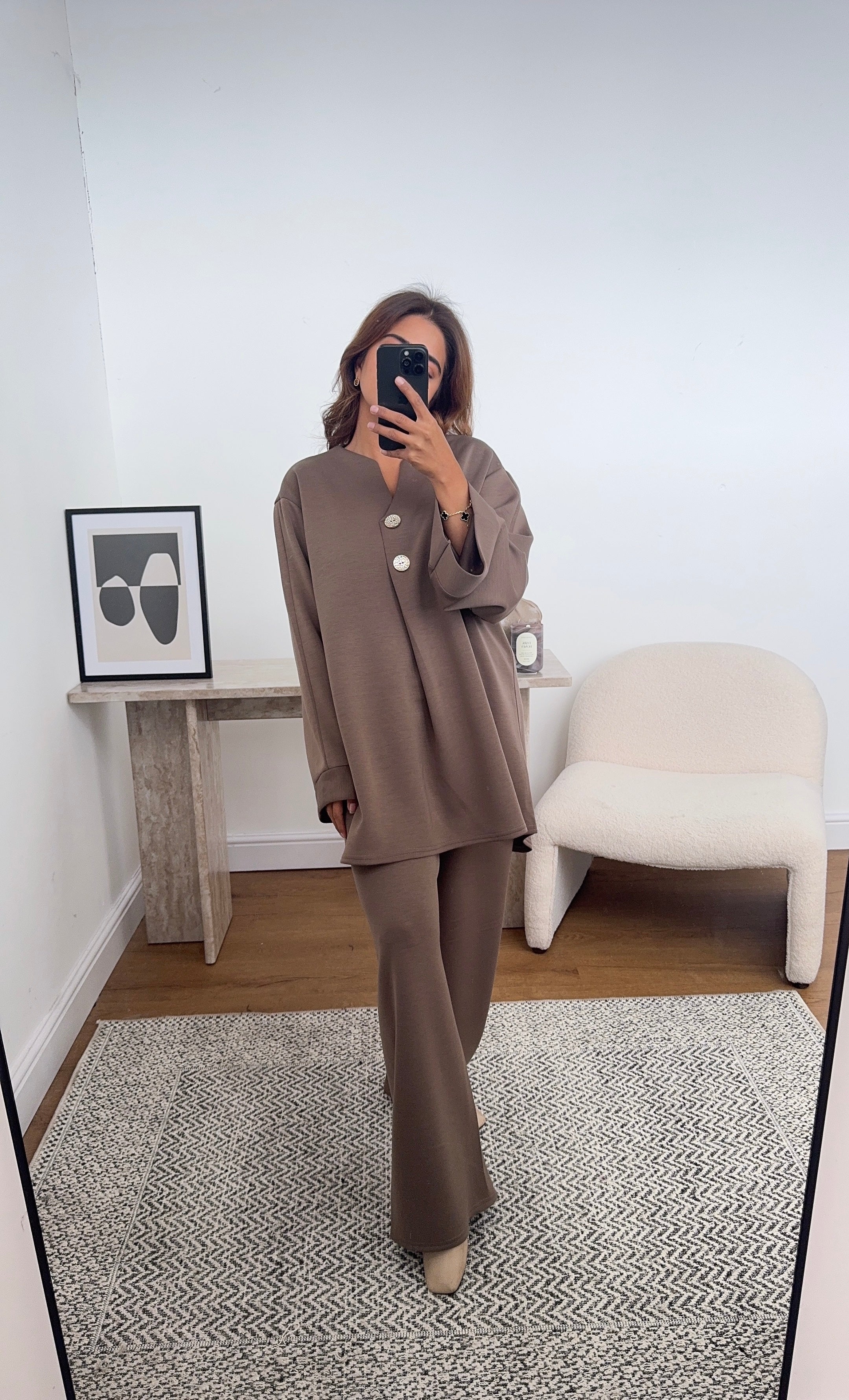 taupe coord with gold buttons- julia