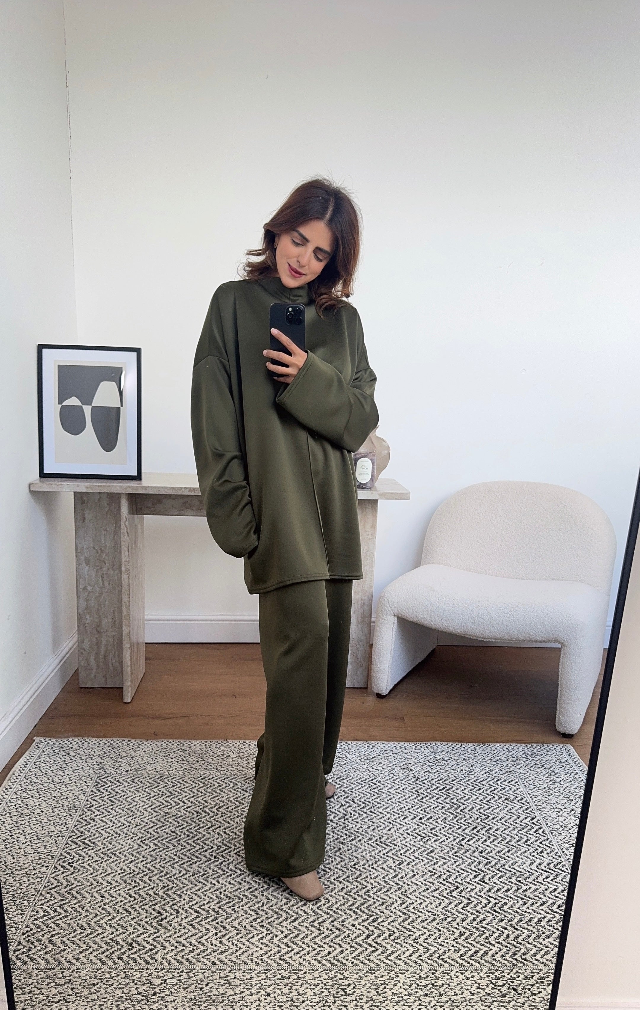• High neck top and trousers with elasticated waist
