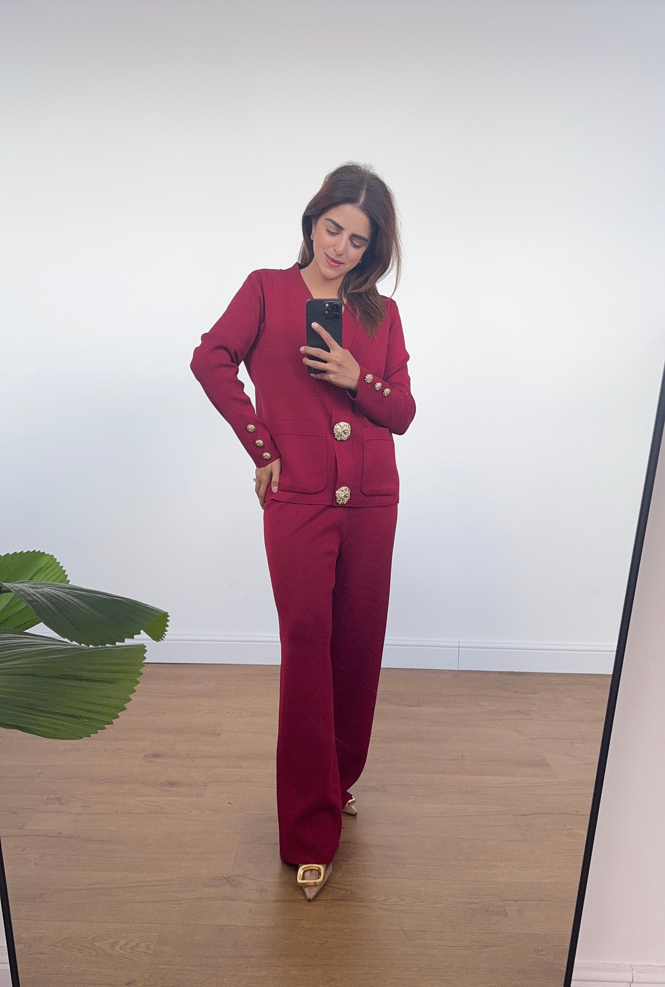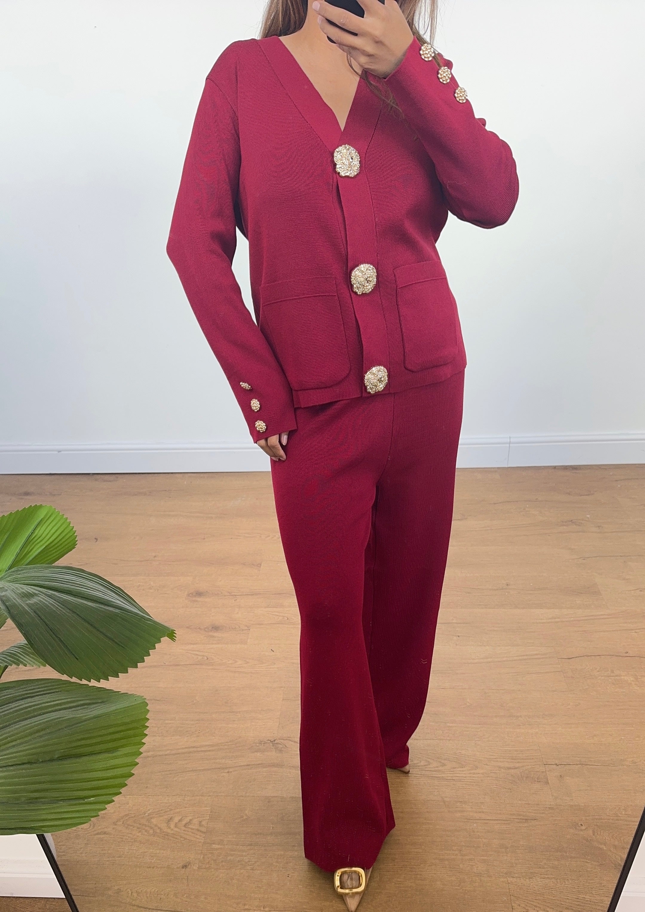 The knit coord that will take you to dinner featuring a cardigan with gold button detailing and trousers with elasticated waist.