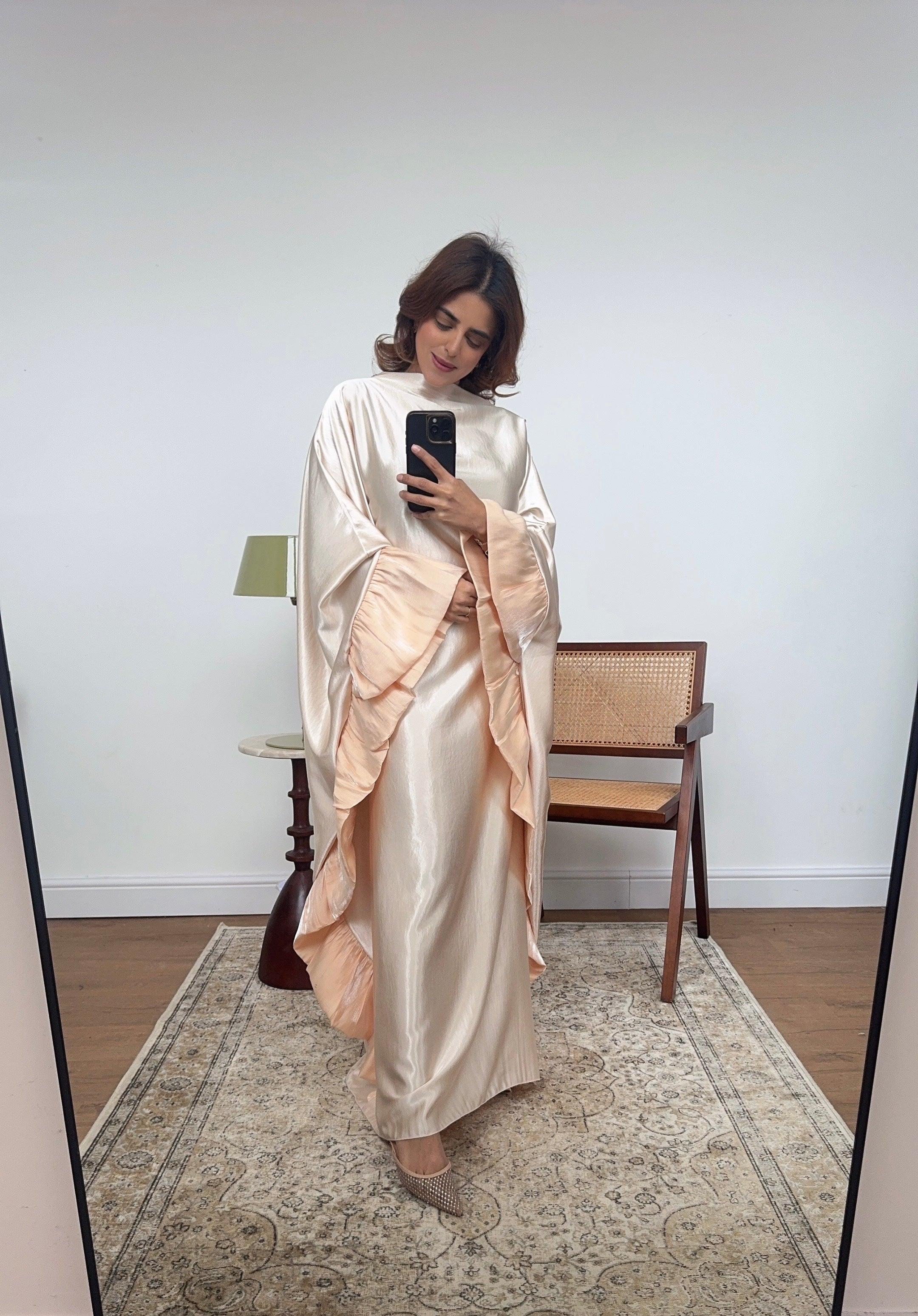 Beautiful kaftan with organza frill edge detail and inner tie belt.