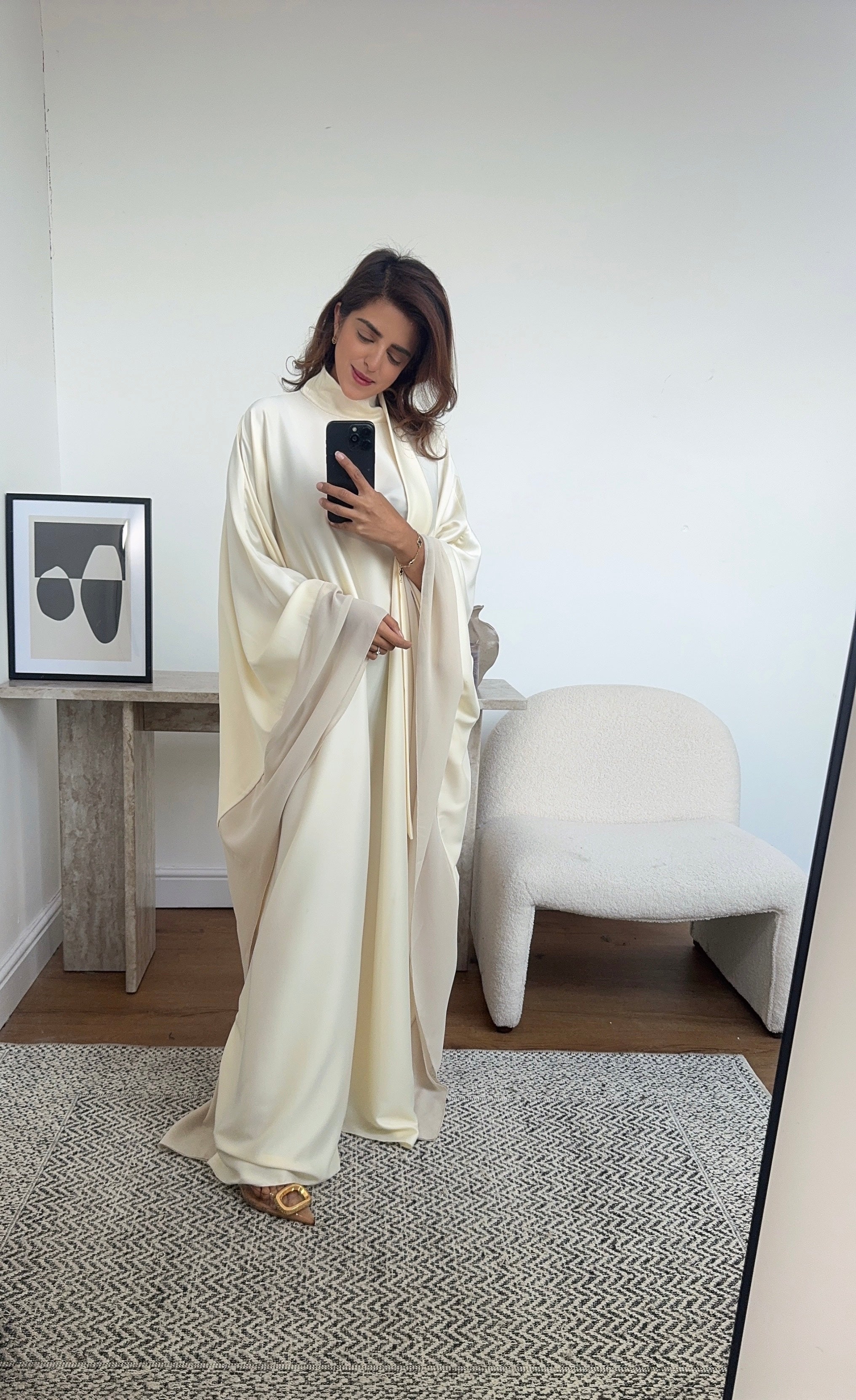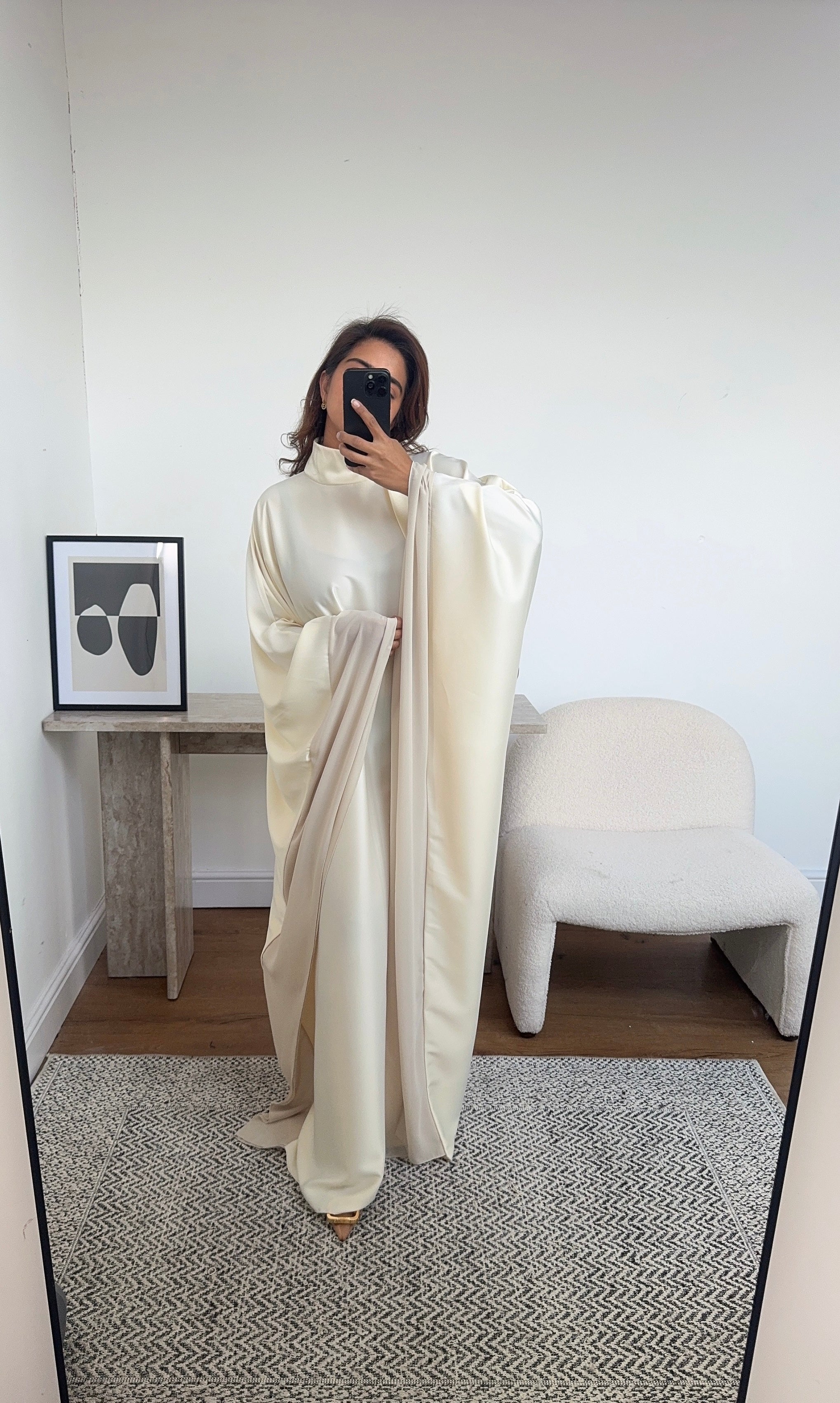 Beautiful heavy weight high neck flare sleeve dress with contrast chiffon fabric sleeve. Back neck tie and scarf detail.
