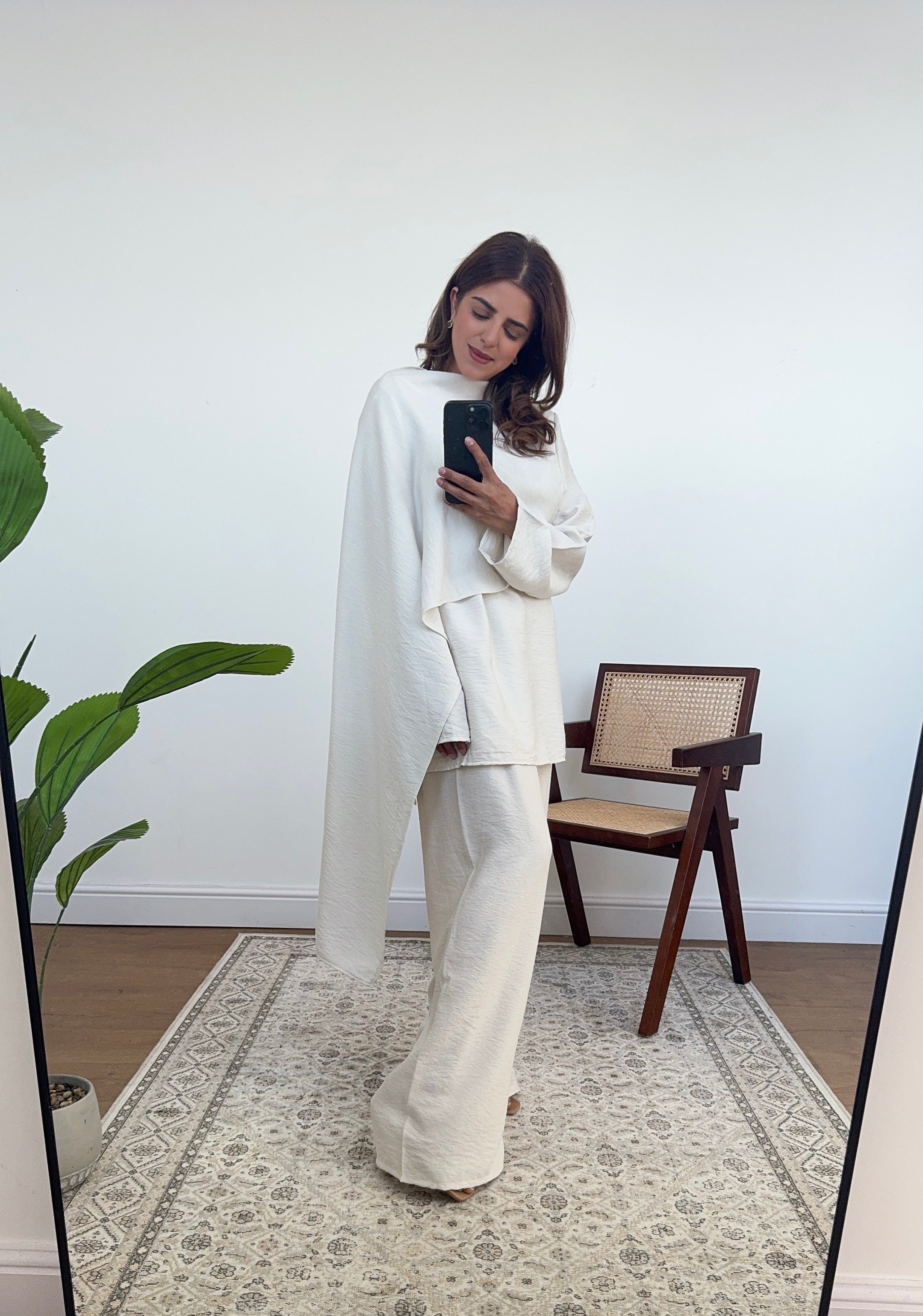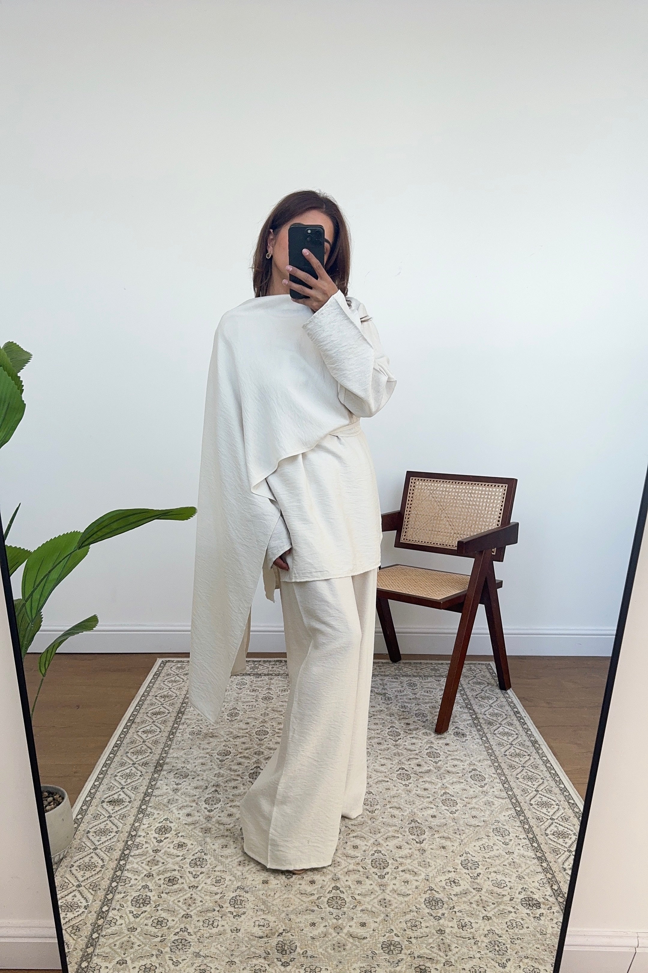 This chic top features a draping scarf and a loop to thread it through. The longer back provides extra coverage, while the lightweight summer fabric keeps you cool. Paired with elasticated waist trousers for a comfortable, flattering fit, this set blends style and comfort effortlessly—perfect for any warm-weather occasion. Belt for fitting